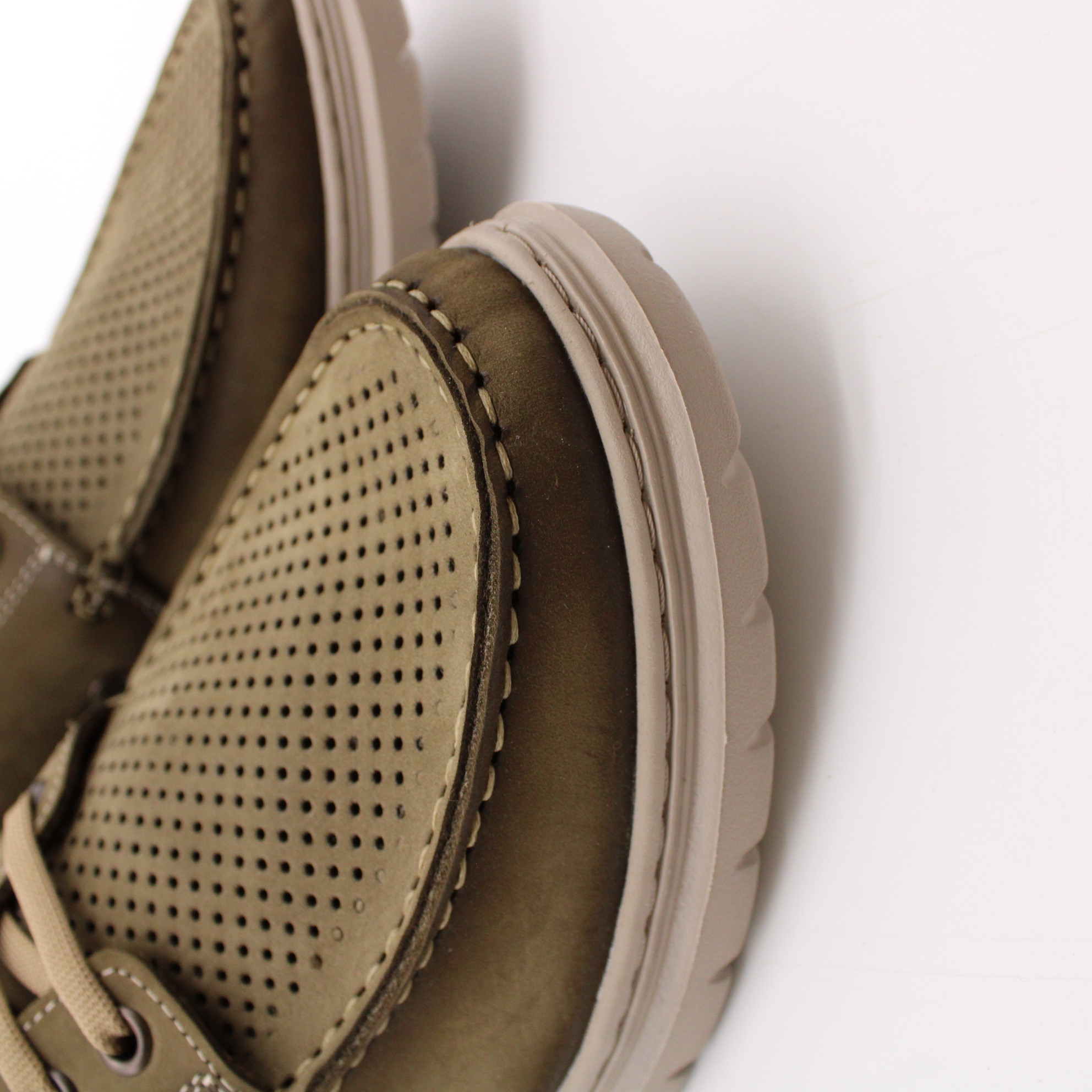 Топсайдеры цвета хаки с перфорированной носочной частью для комфортного микроклимата стопы. Модель выполнена на ультралёгкой подошве, что создаёт удобство при ходьбе.