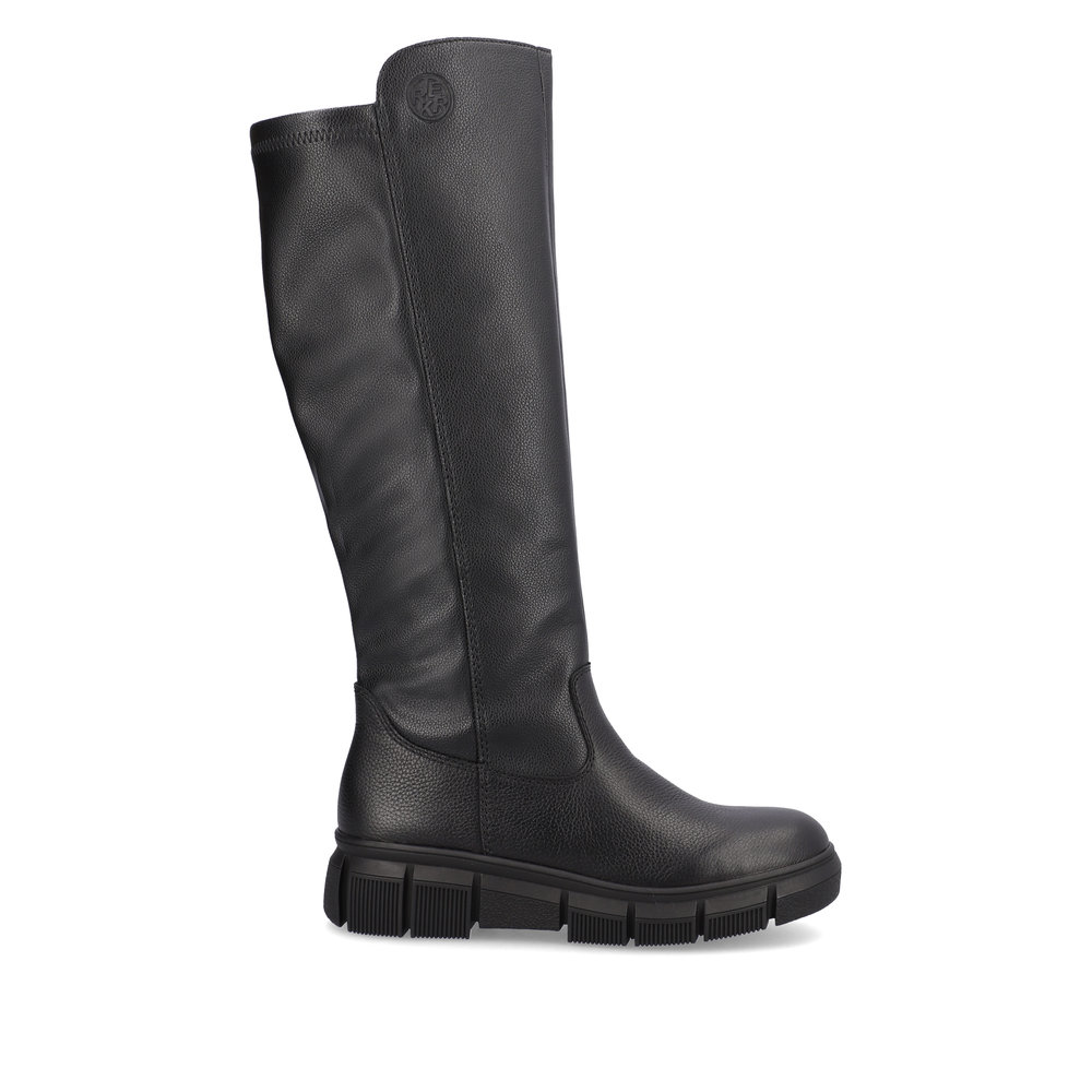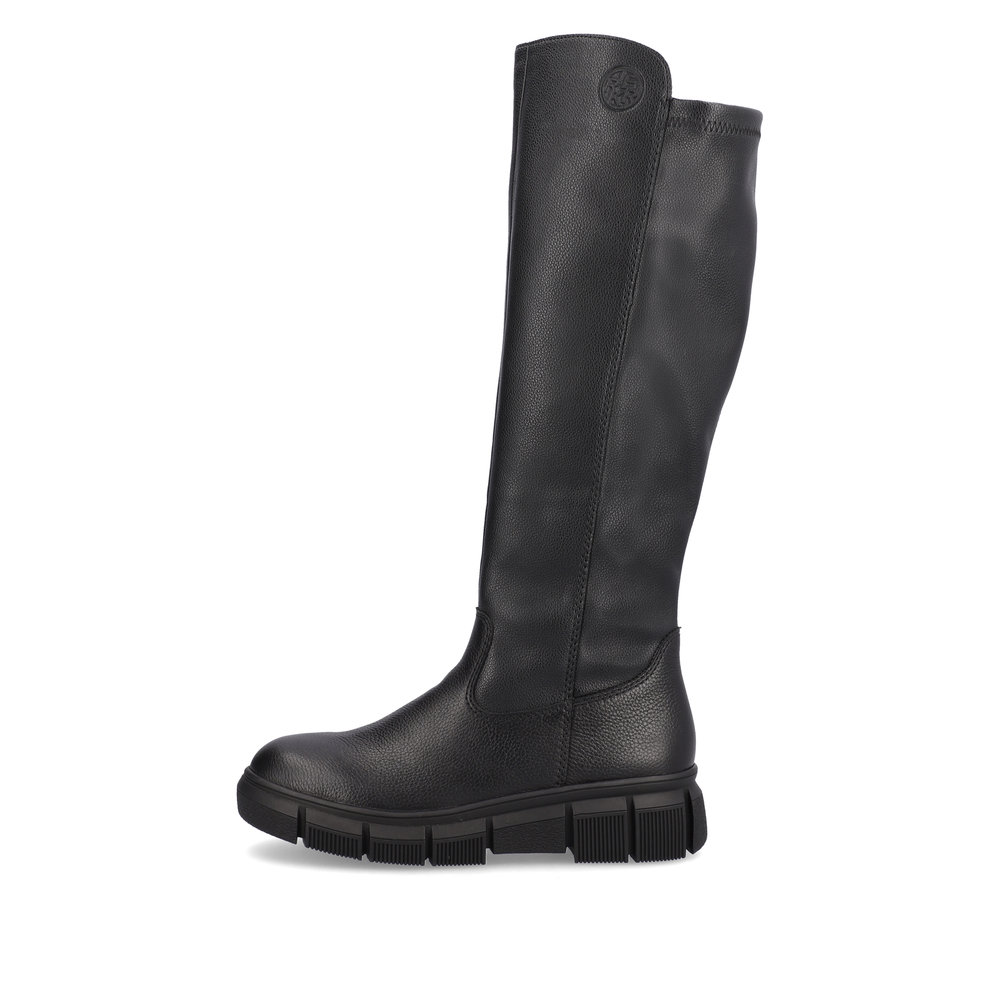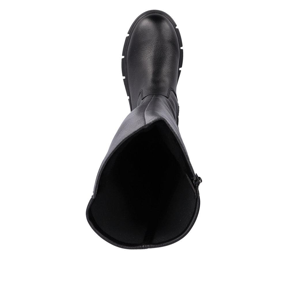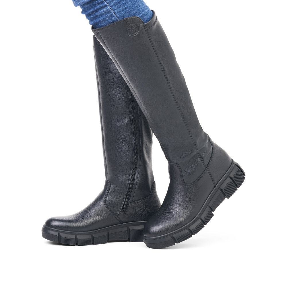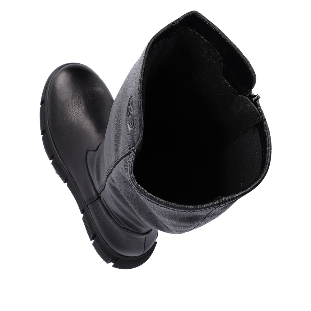 Сапоги женские немецкого бренда Rieker. Верх изготовлен из  искуственной кожи черного цвета. Материал подкладки натуральная шерсть с ТЕХ мембраной. Отлично подойдут на зиму и станут хорошим завершением к вашему гардеробу.