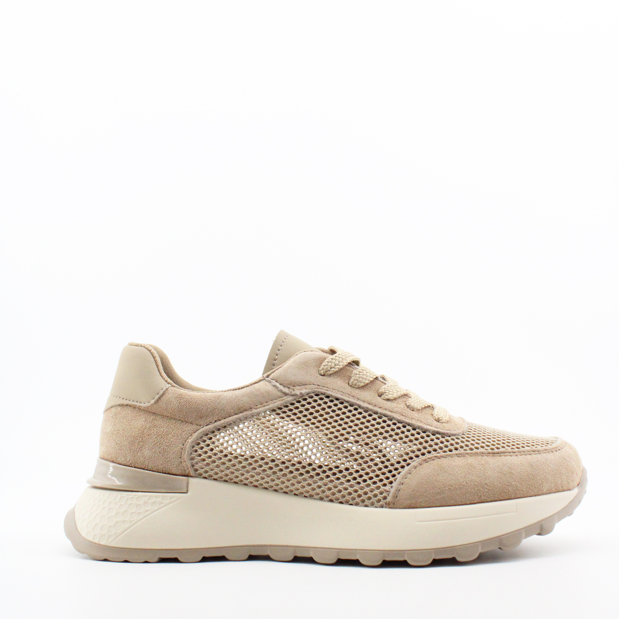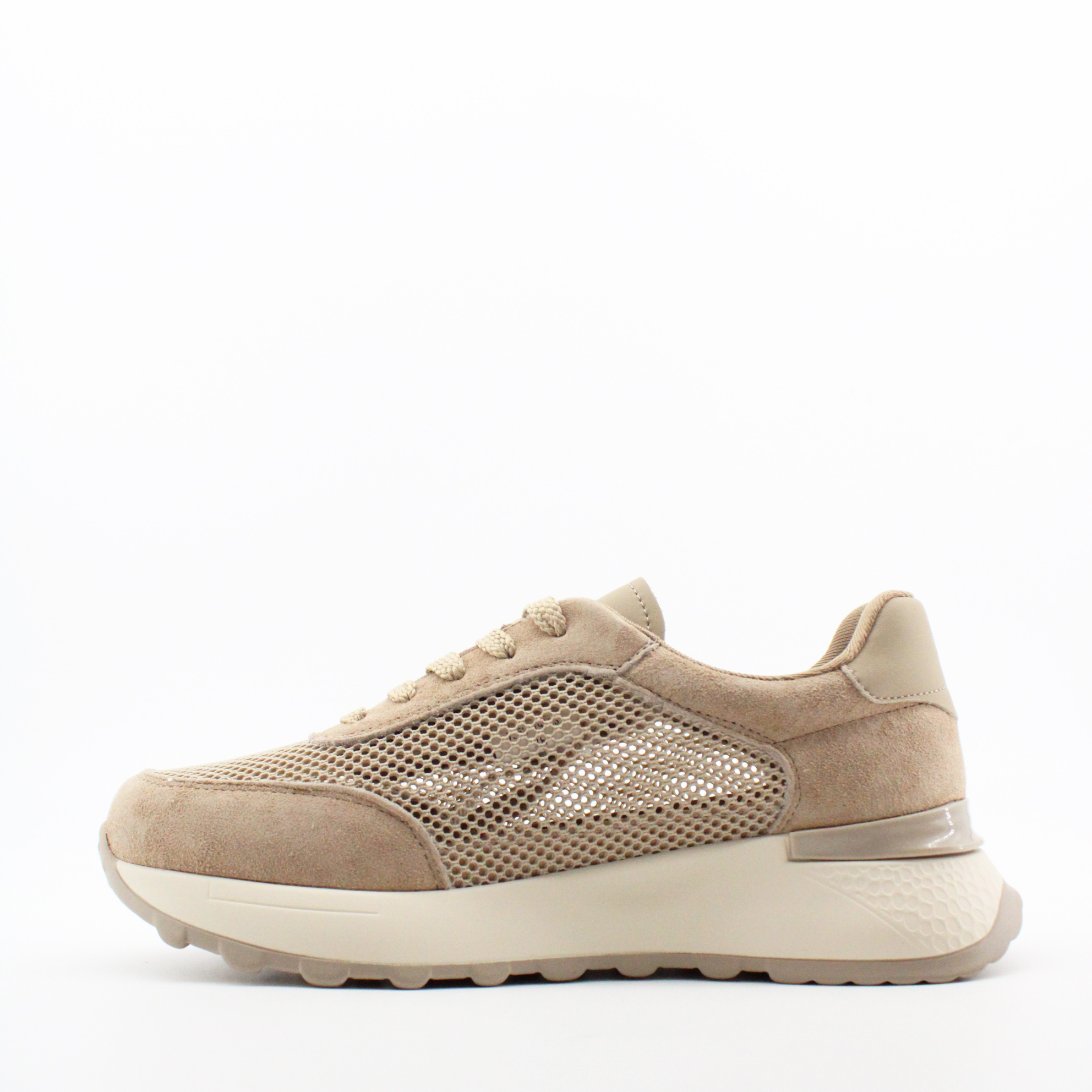 Натуральная замша обнимает стопу, текстильная сетка позволяет ноге дышать, а полиуретановая подошва делает каждый шаг таким лёгким, будто идёшь по облаку. Монохромный бежевый — от шнурков до протектора — это тот самый nude-оттенок, который удлиняет ногу, выглядит дорого и сочетается абсолютно с любым образом.