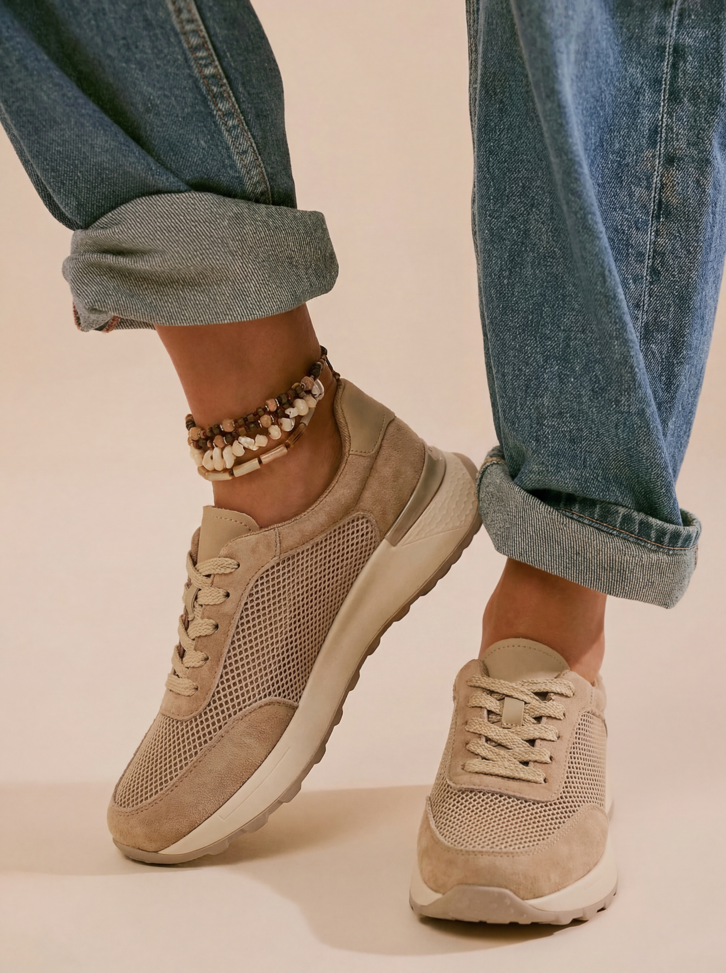 Натуральная замша обнимает стопу, текстильная сетка позволяет ноге дышать, а полиуретановая подошва делает каждый шаг таким лёгким, будто идёшь по облаку. Монохромный бежевый — от шнурков до протектора — это тот самый nude-оттенок, который удлиняет ногу, выглядит дорого и сочетается абсолютно с любым образом.