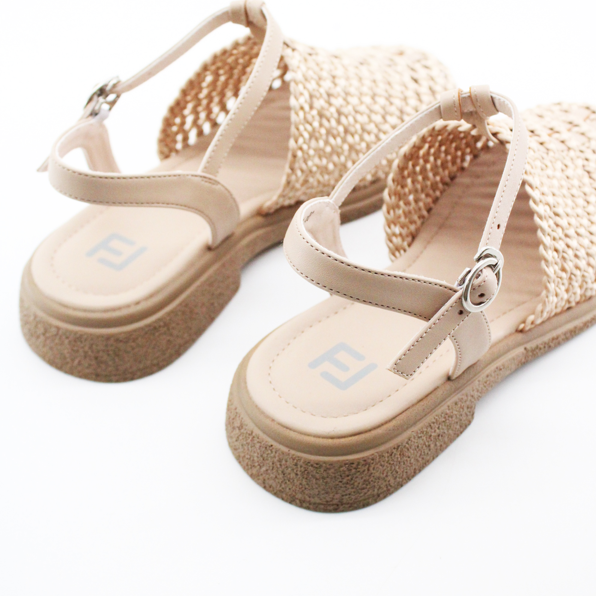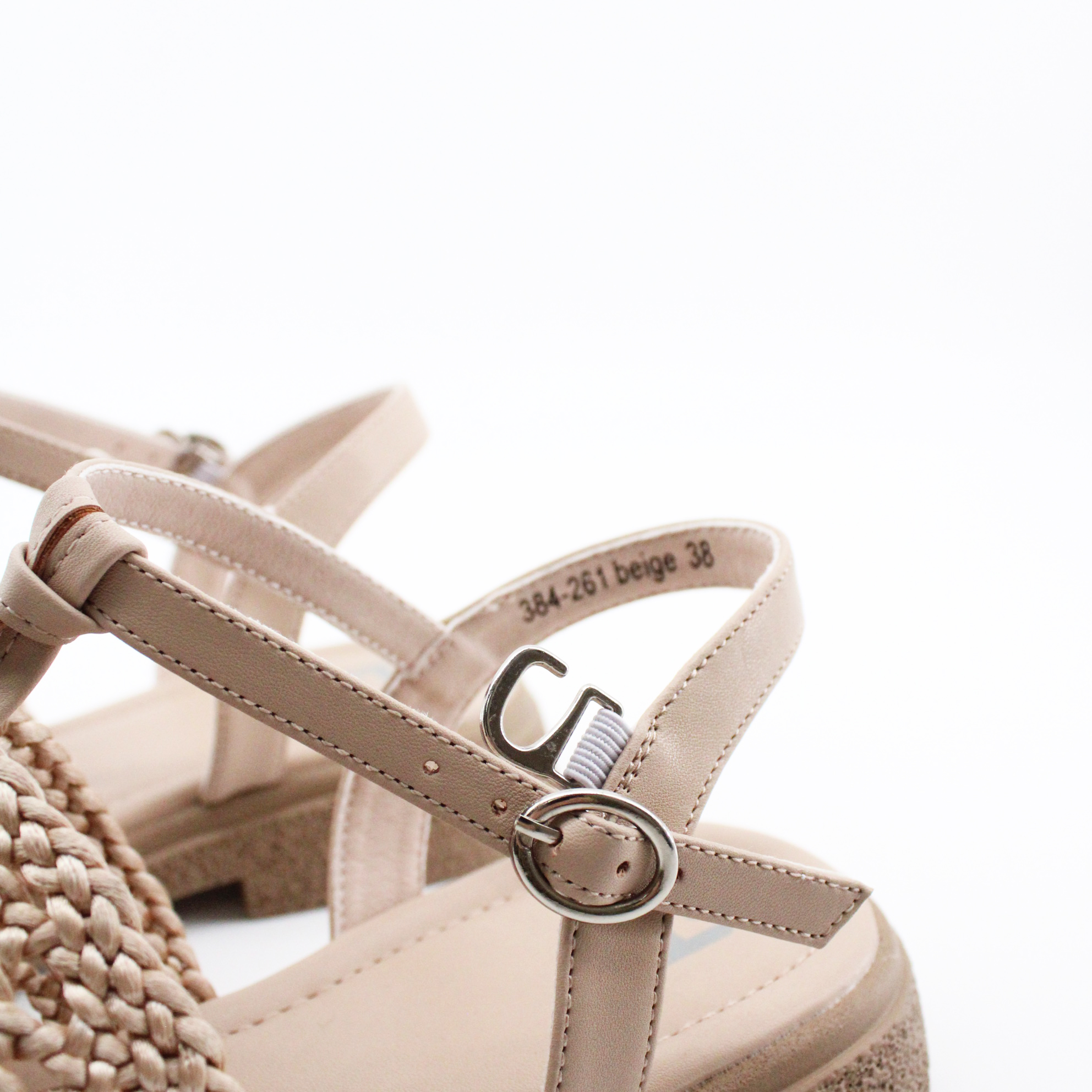Задник — классический Т-ремешок (T-bar): тонкий вертикальный ремешок от плетёной части переходит в горизонтальный ремешок вокруг щиколотки. Застёжка — металлическая пряжка цвета серебро/никель с язычком. Несколько отверстий для регулировки по обхвату — можно подогнать по ноге. Пятка полностью открытая — максимальная лёгкость и вентиляция.