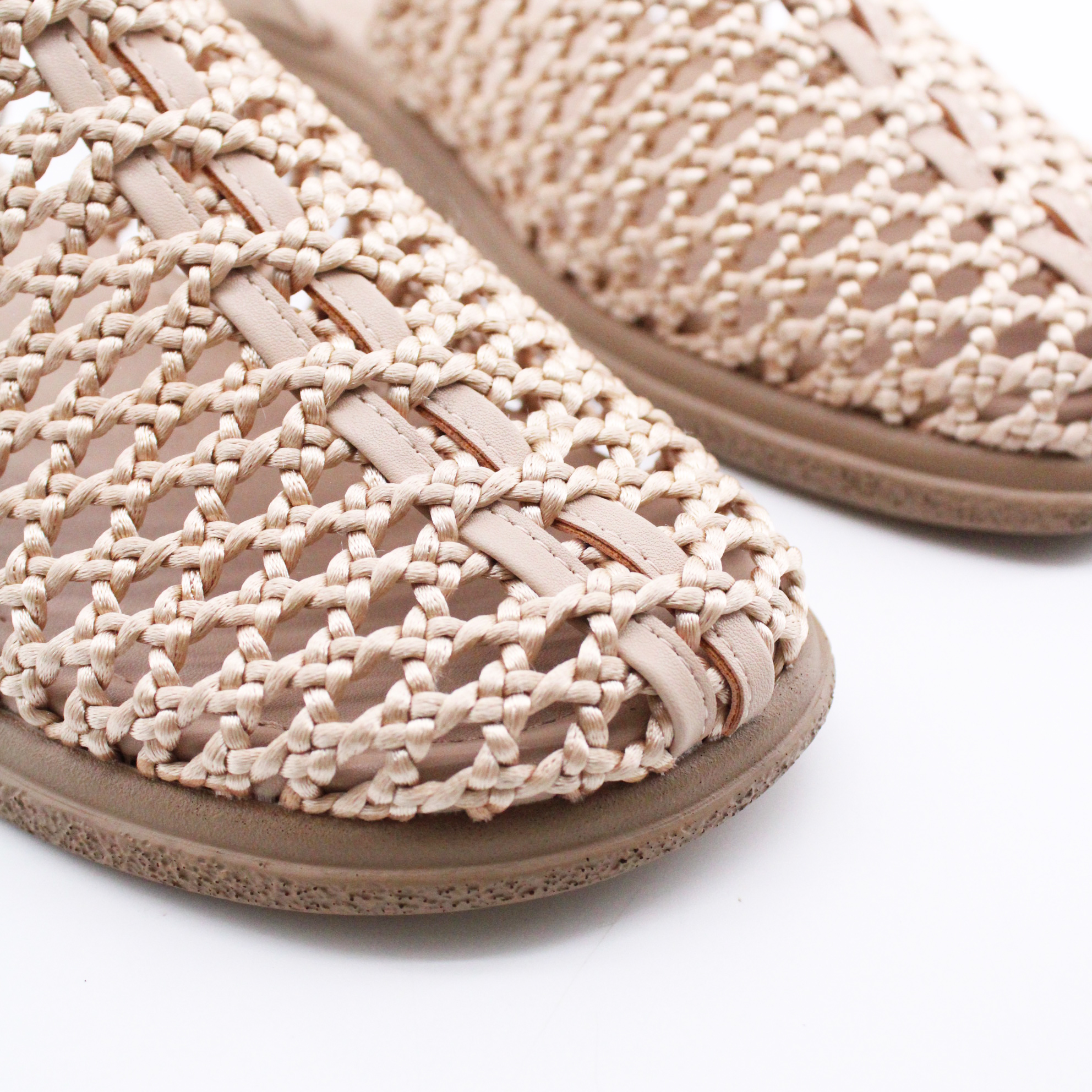Передняя часть — ажурное ручное плетение из тонких кожаных полос в технике «макраме». Узор напоминает мелкие узелки-цветочки с ромбовидными просветами. Плетение объёмное, эластичное — мягко облегает стопу и не давит. Цвет — нюдовый беж / слоновая кость: тёплый, нежный, универсальный.