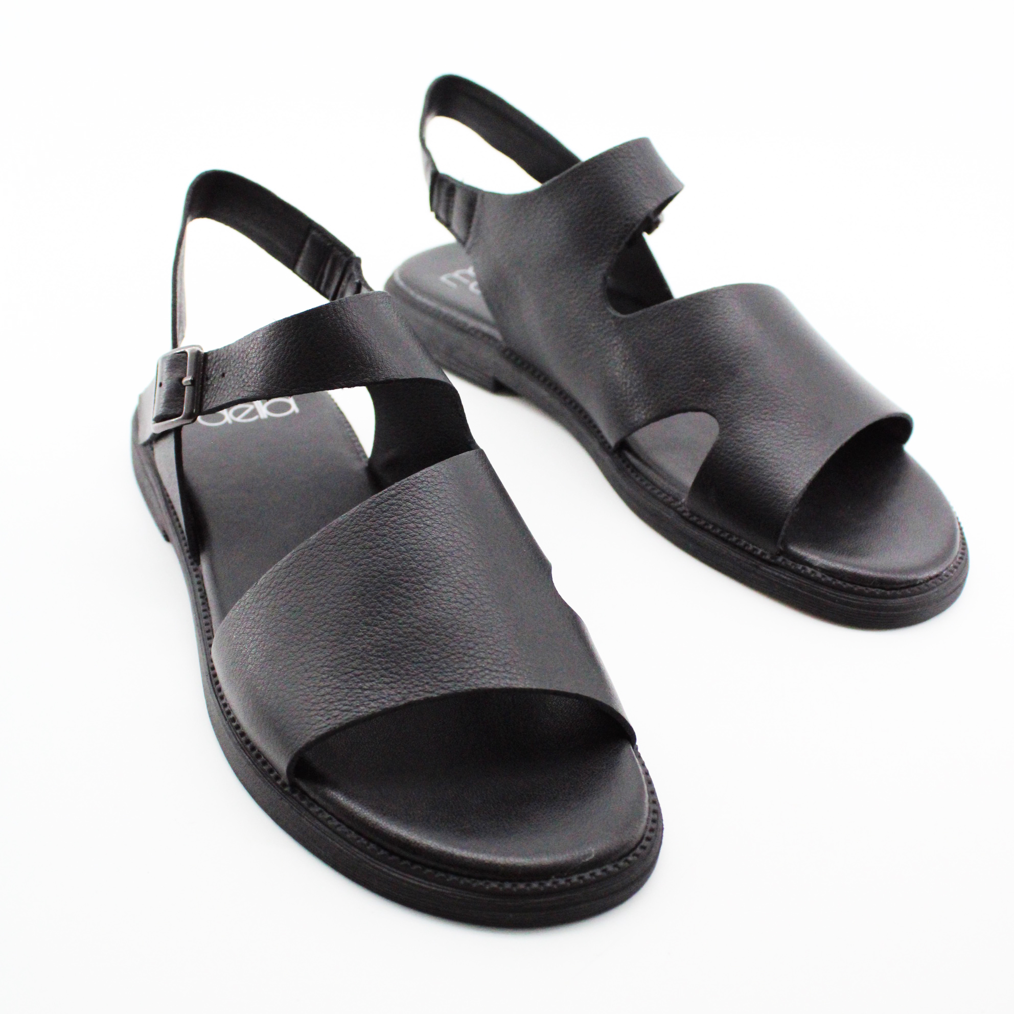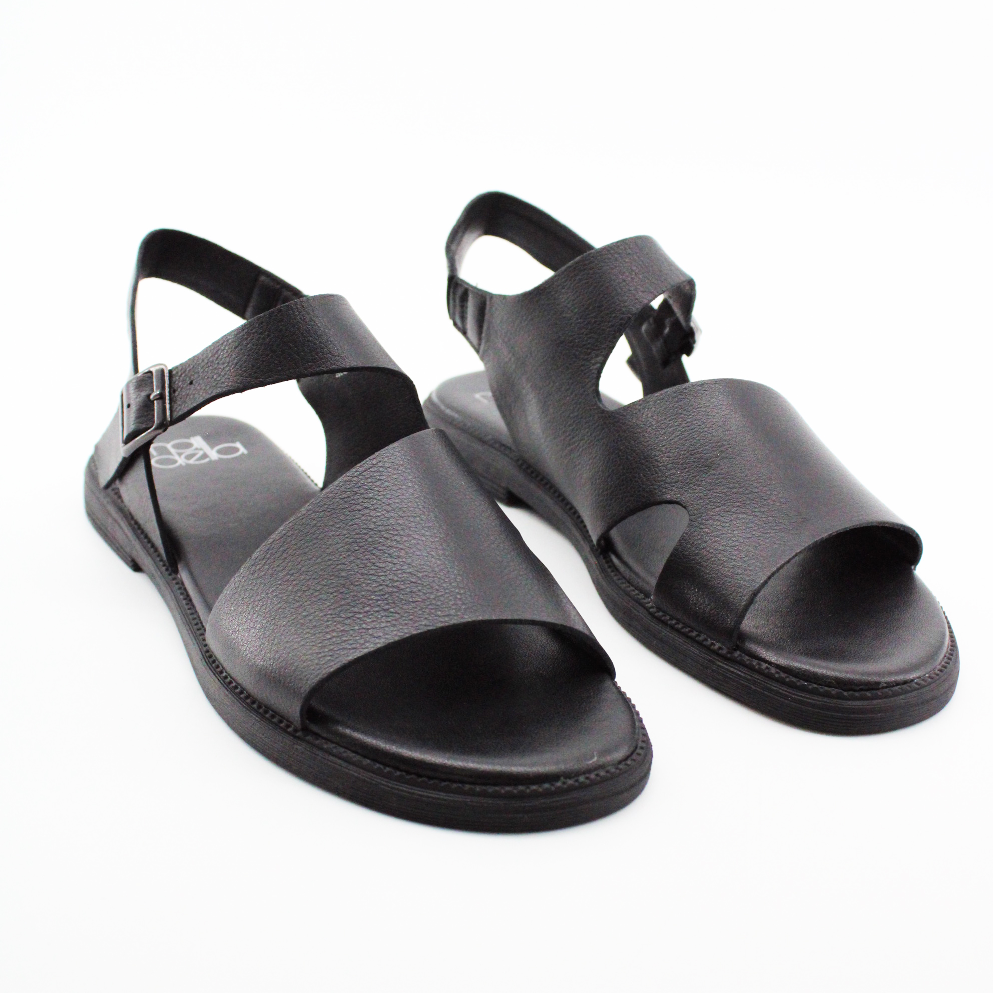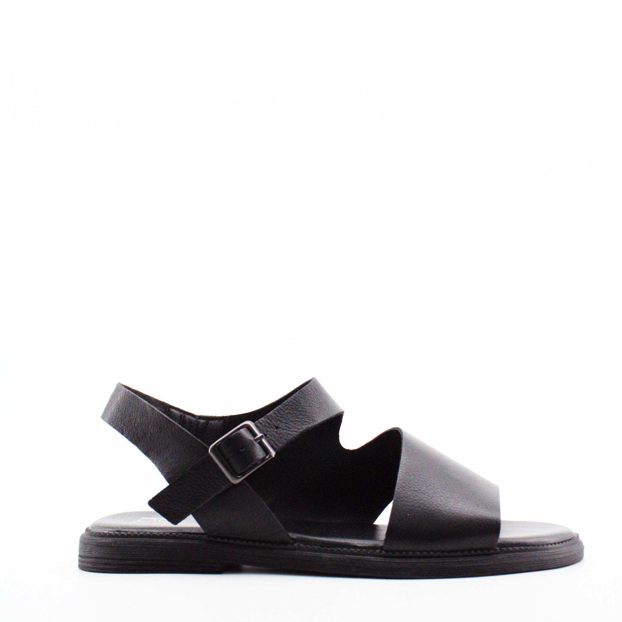 Передняя часть — широкая кожаная панель, которая закрывает пальцы и переднюю часть стопы. Она плавно изгибается, открывая стопу с внутренней стороны — создавая асимметричный V-образный вырез. Этот вырез — ключевой дизайнерский элемент: он открывает ровно столько кожи, сколько нужно для вентиляции и эстетики, но при этом надёжно фиксирует переднюю часть стопы.