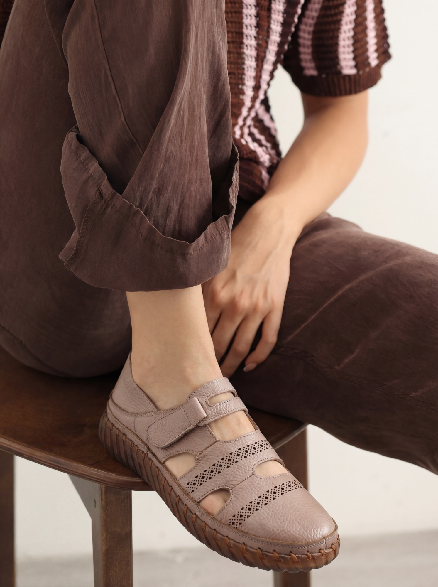 Женские кожаные туфли в нежном пудрово-бежевом оттенке — это настоящий подарок для стоп, которые устали от жёсткой, тесной, неудобной обуви. Мягкая натуральная кожа, бортопрошивной метод крепления, гибкая подошва и открытые вырезы для вентиляции — каждый элемент продуман ради одного: вашего комфорта.