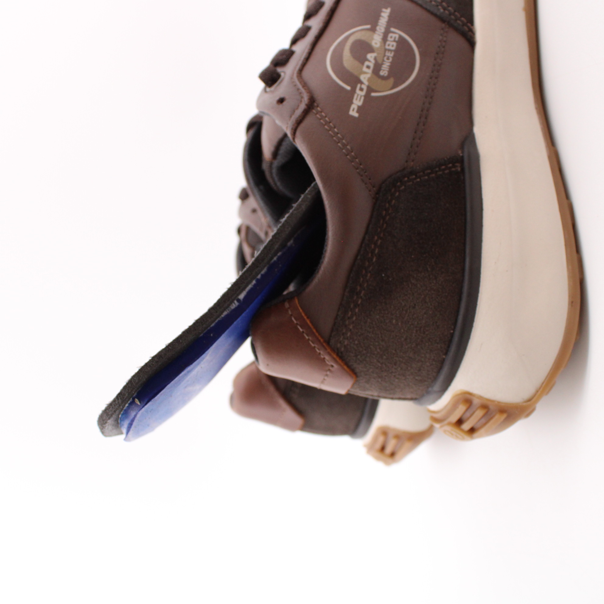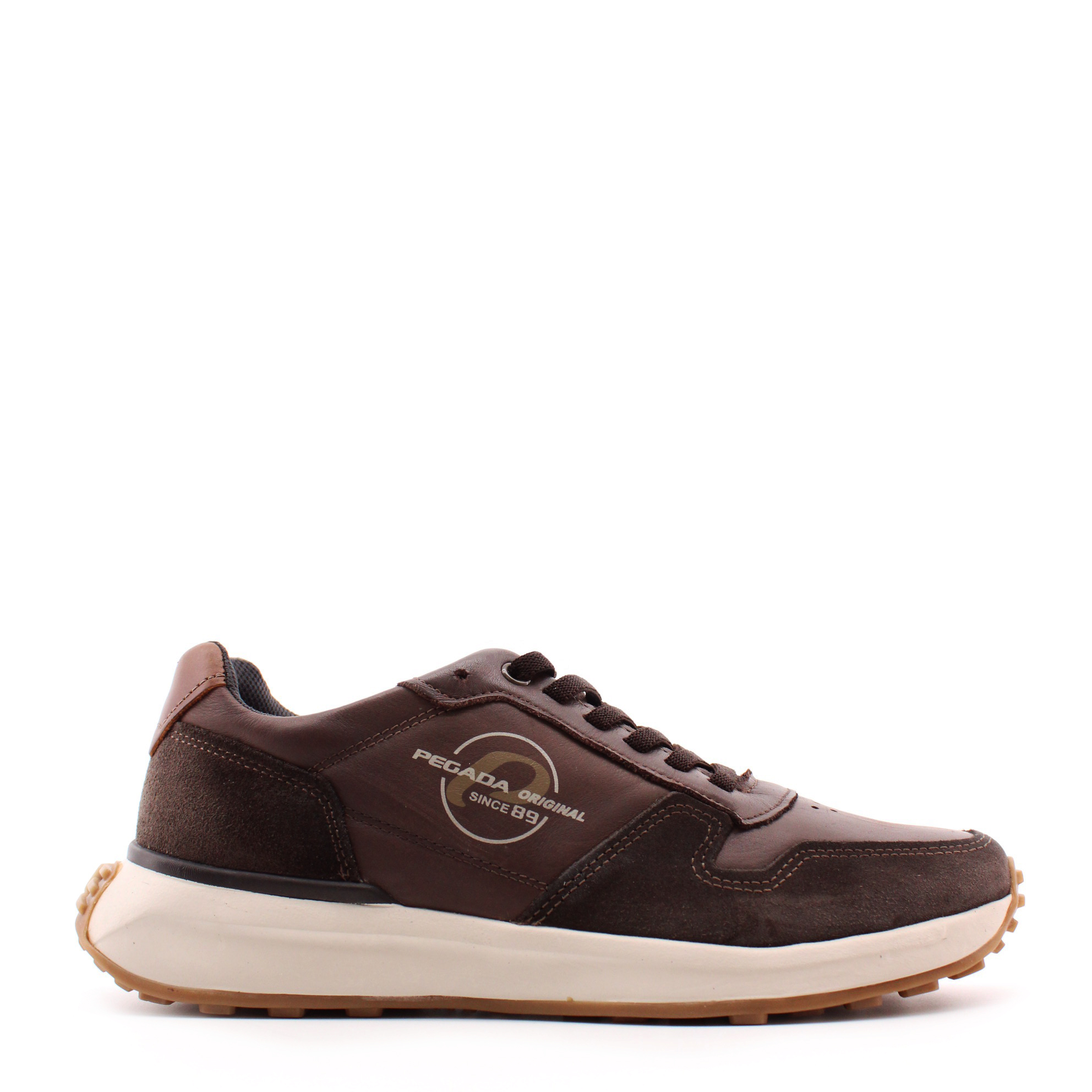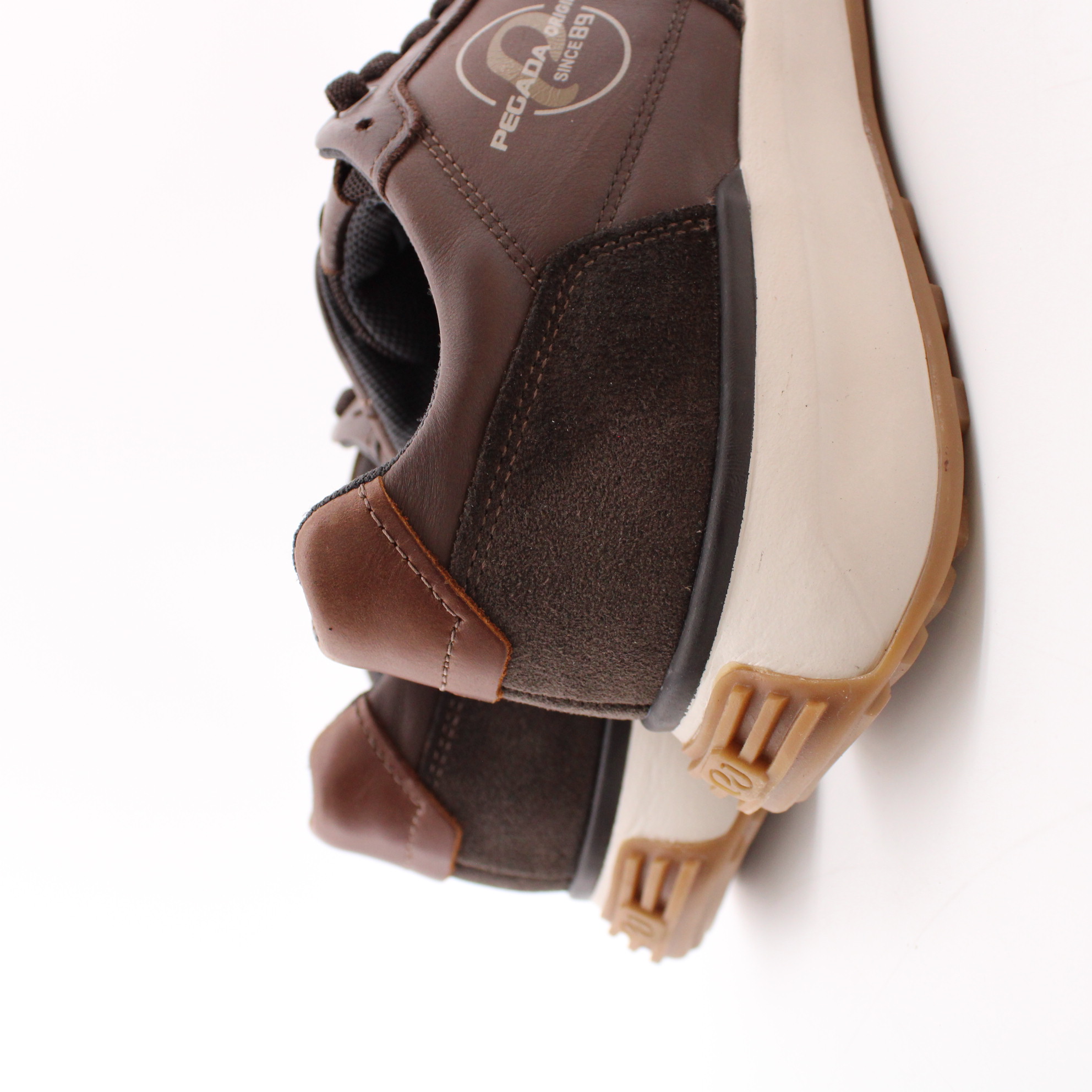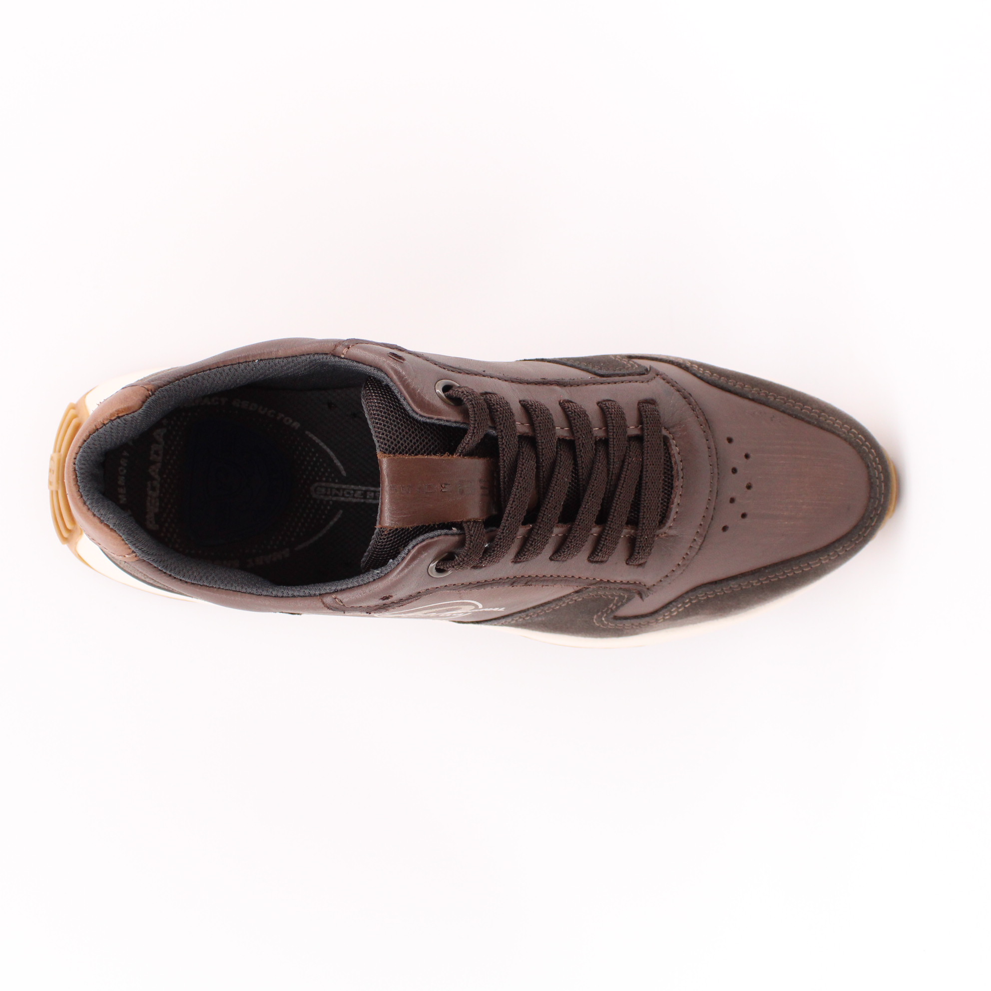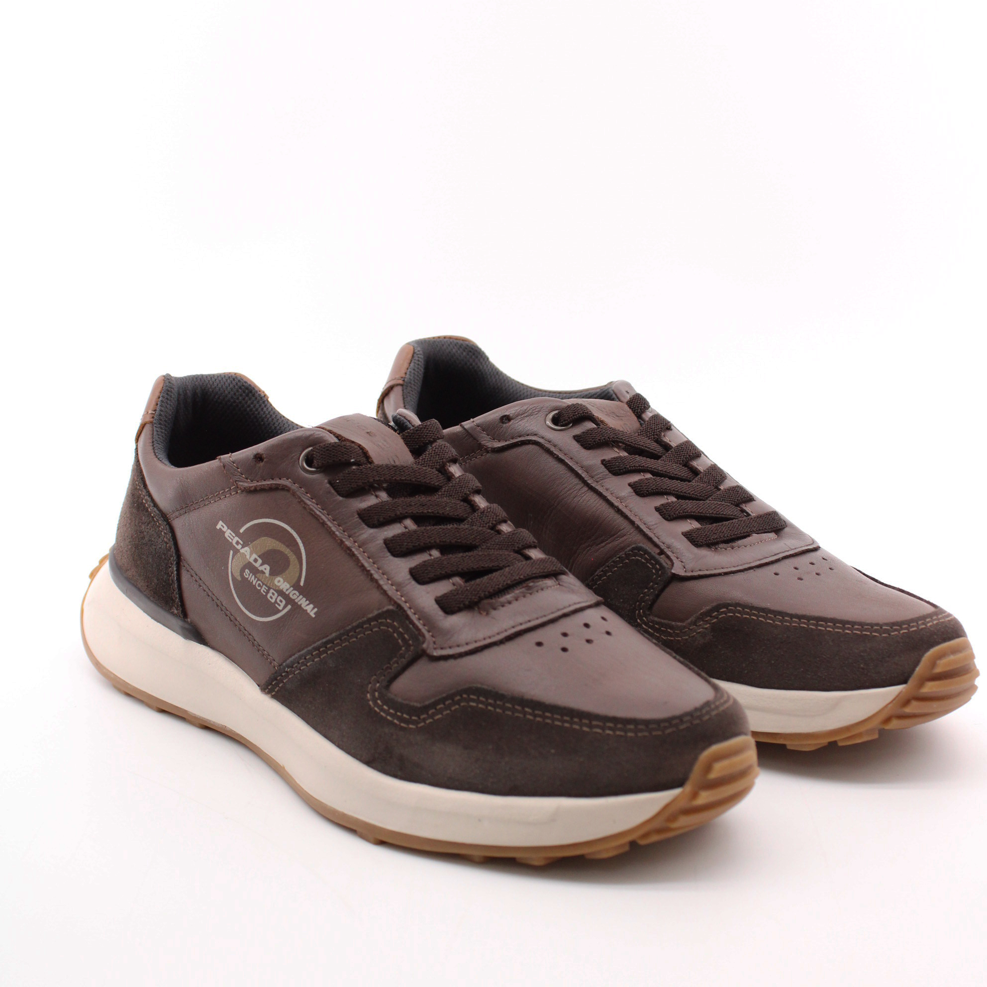 Коричневые кроссовки на светлой подошве от бразильского бренда PEGADA. Верх выполнен из комбинации натуральной кожи и замши, с фирменным логотипом с наружней стороны. Белая подошва изготовлена из ЭВА материала низкой плотности с коричневым резиновым протектором в ее основании. Она не только лёгкая и устойчивая, но и невероятно комфортная в эксплуатации. Внутри кроссовок имеется съемная стелька с эффектом памяти на тектильном подкладе. А для более быстрого надевания производитель интегрировал эластичный шнурок - резинку.