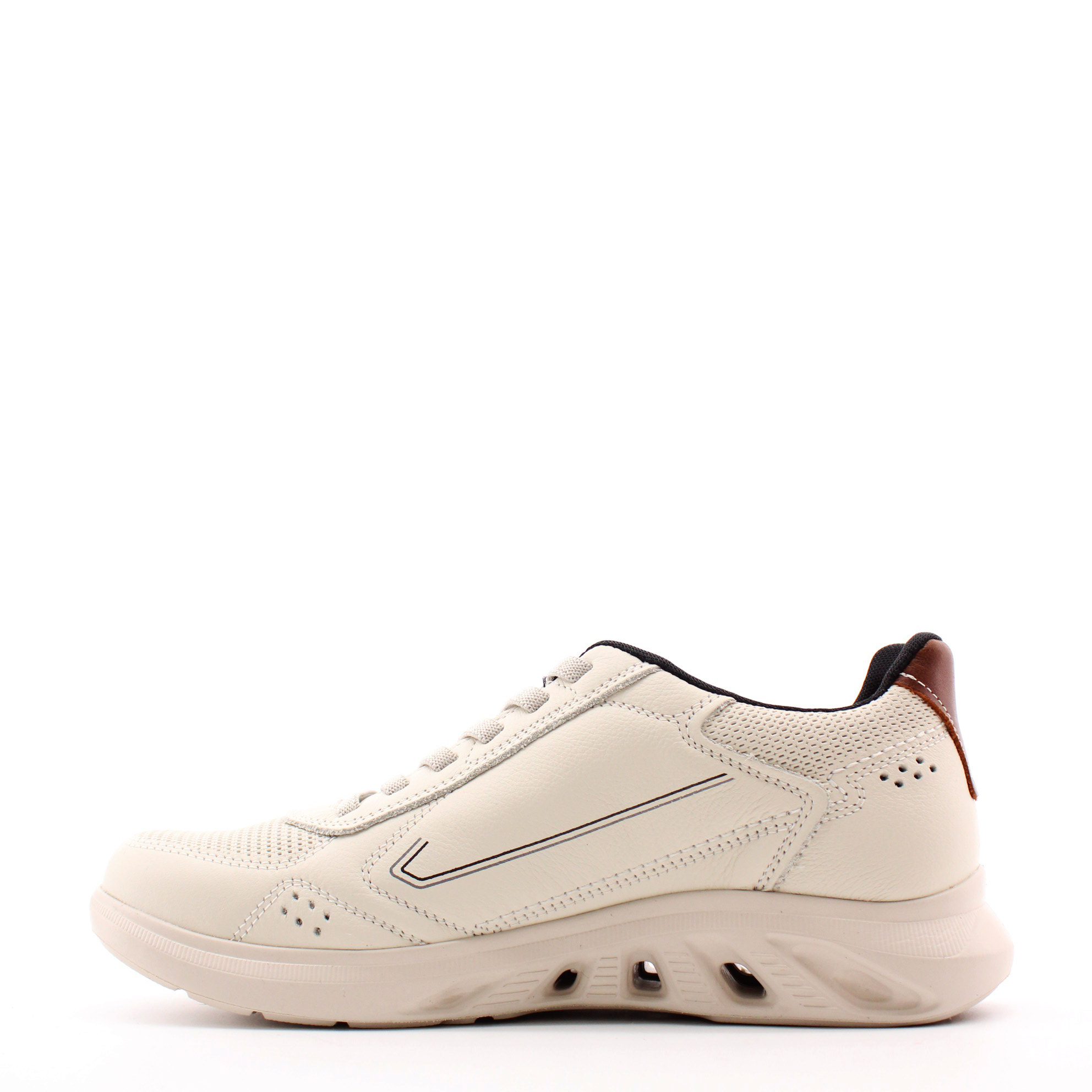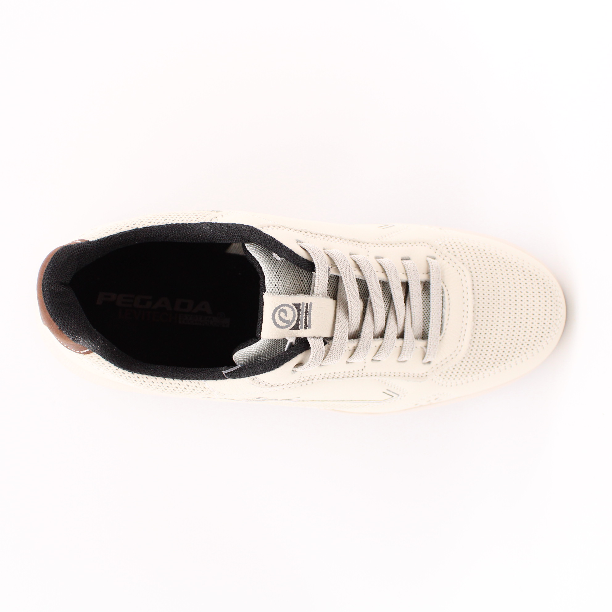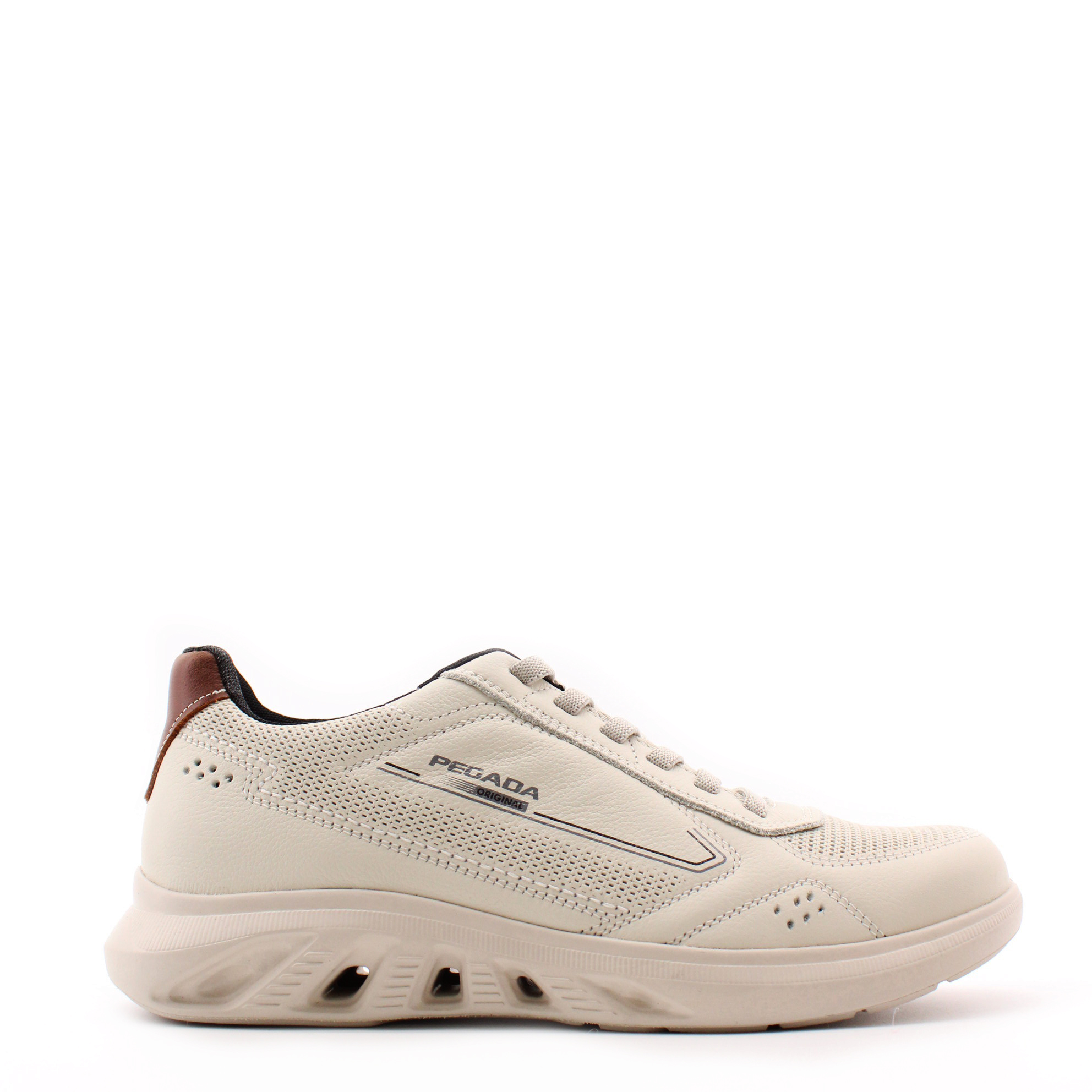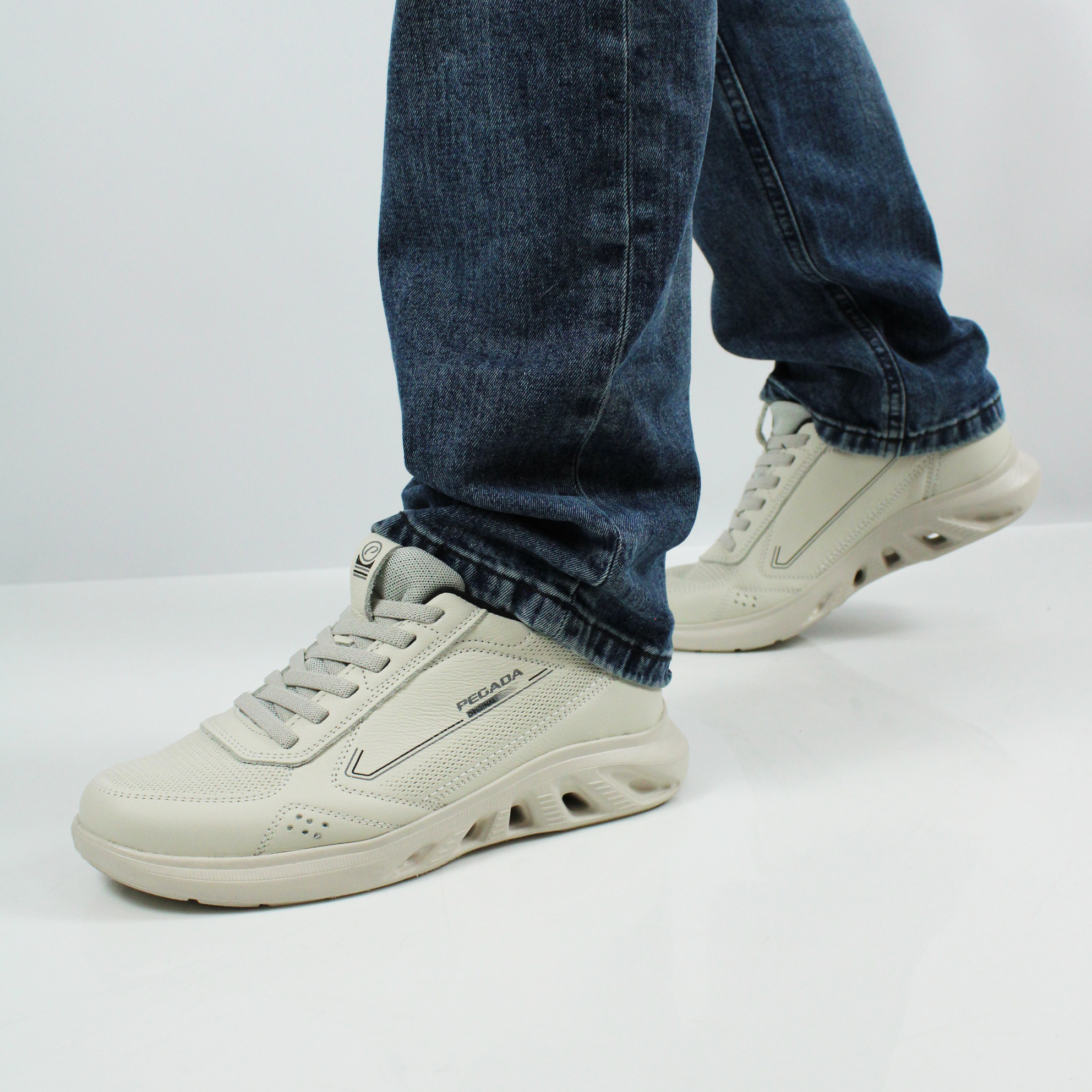 Бежевые кроссовки из натуральной кожи от бразильского бренда PEGADA. Верх модели имеет декоративное тиснение в носочной и берцовых частях. Эластичный шестирядный шнурок-резинка позволяет быстро и без усилий надевать и снимать эти кроссовки. Главным отличием этой модели является подошва: она выполнена из ЭВА низкой плотности, обеспечивая идеальный комфорт и  устойчивость в каждом шаге. Ее вес составляет менее 250 грамм, что свидетельствует о запатентованной технологии Levitech (Левитэк) - лёгкая, словно "ходьба босиком". В подошве также интрегрирована трехмерная система циркуляции воздуха и быстрого оттока воды.
