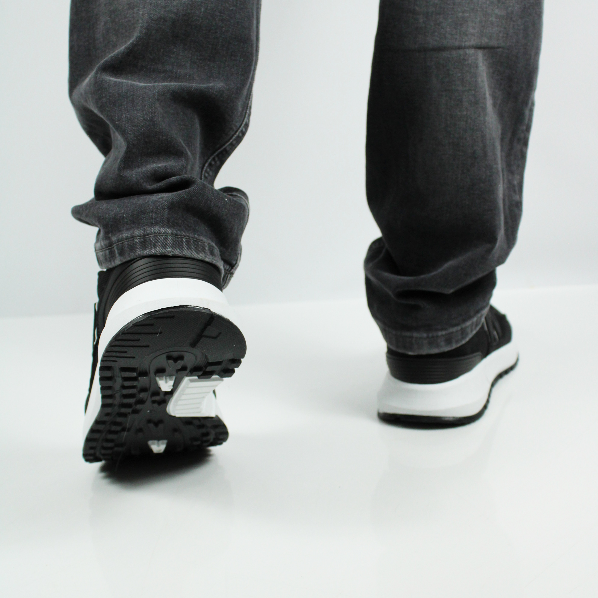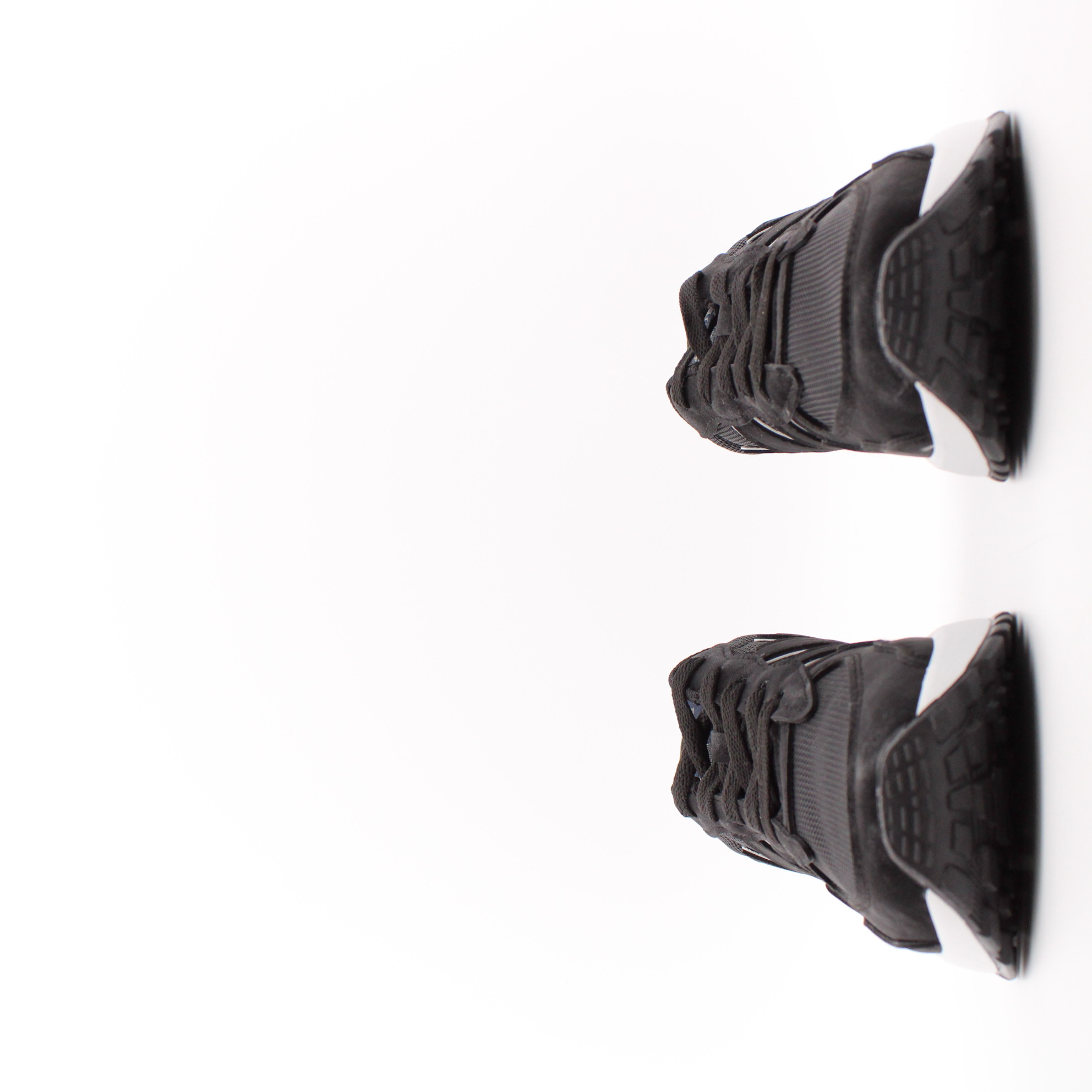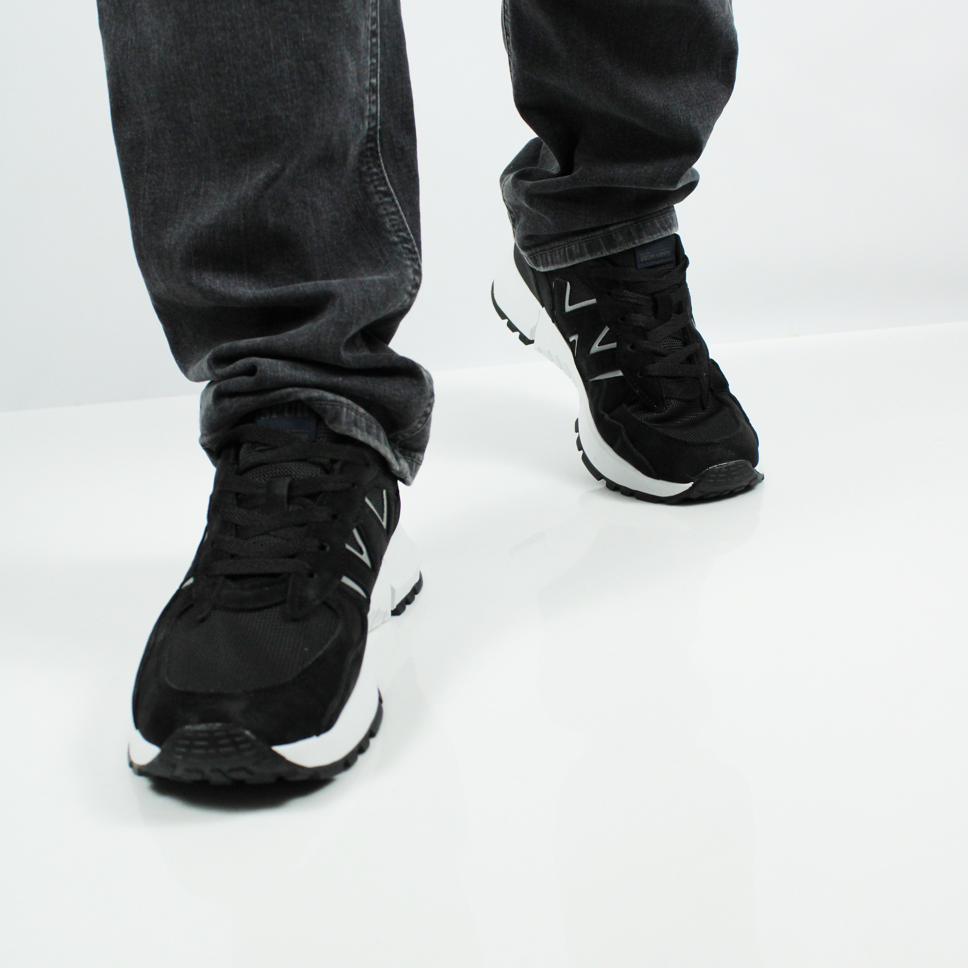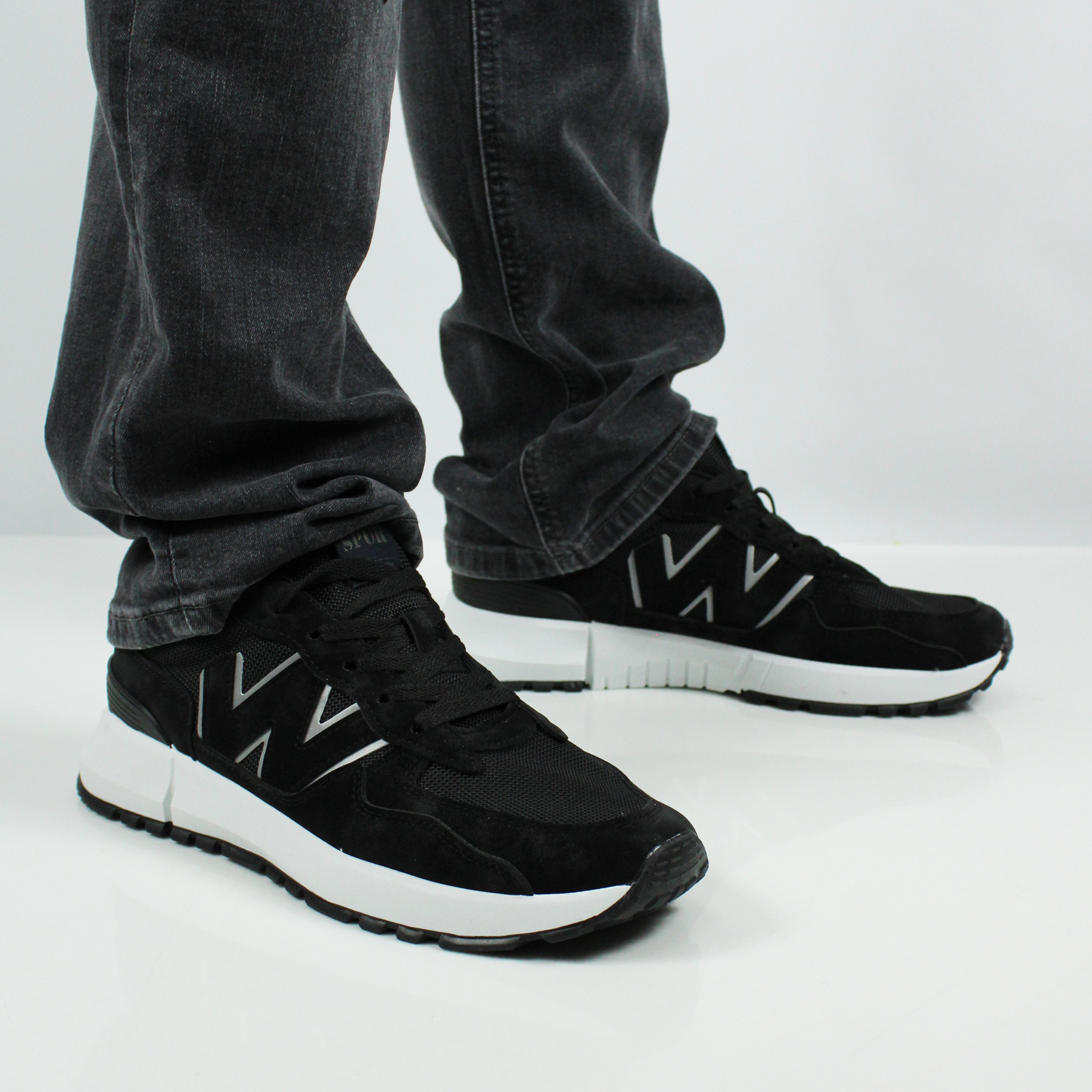 Чёрные кроссовки на белой подошве.