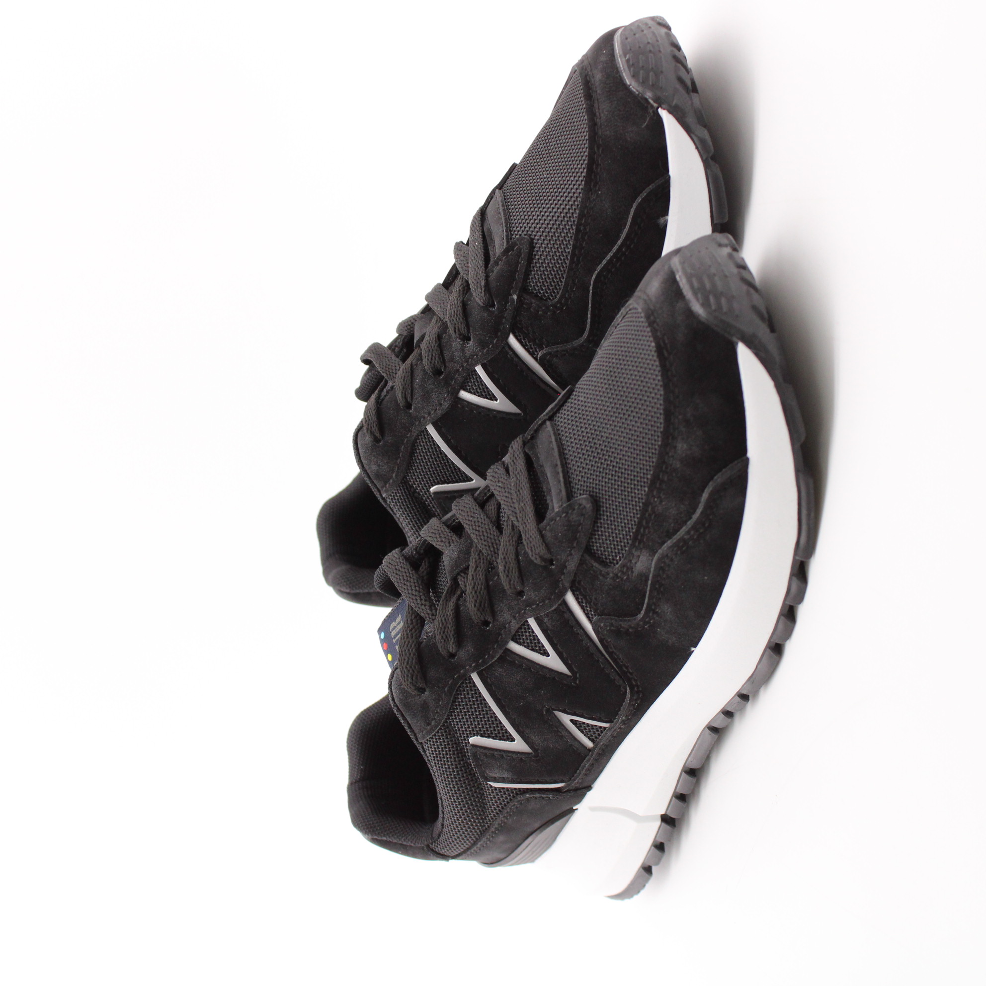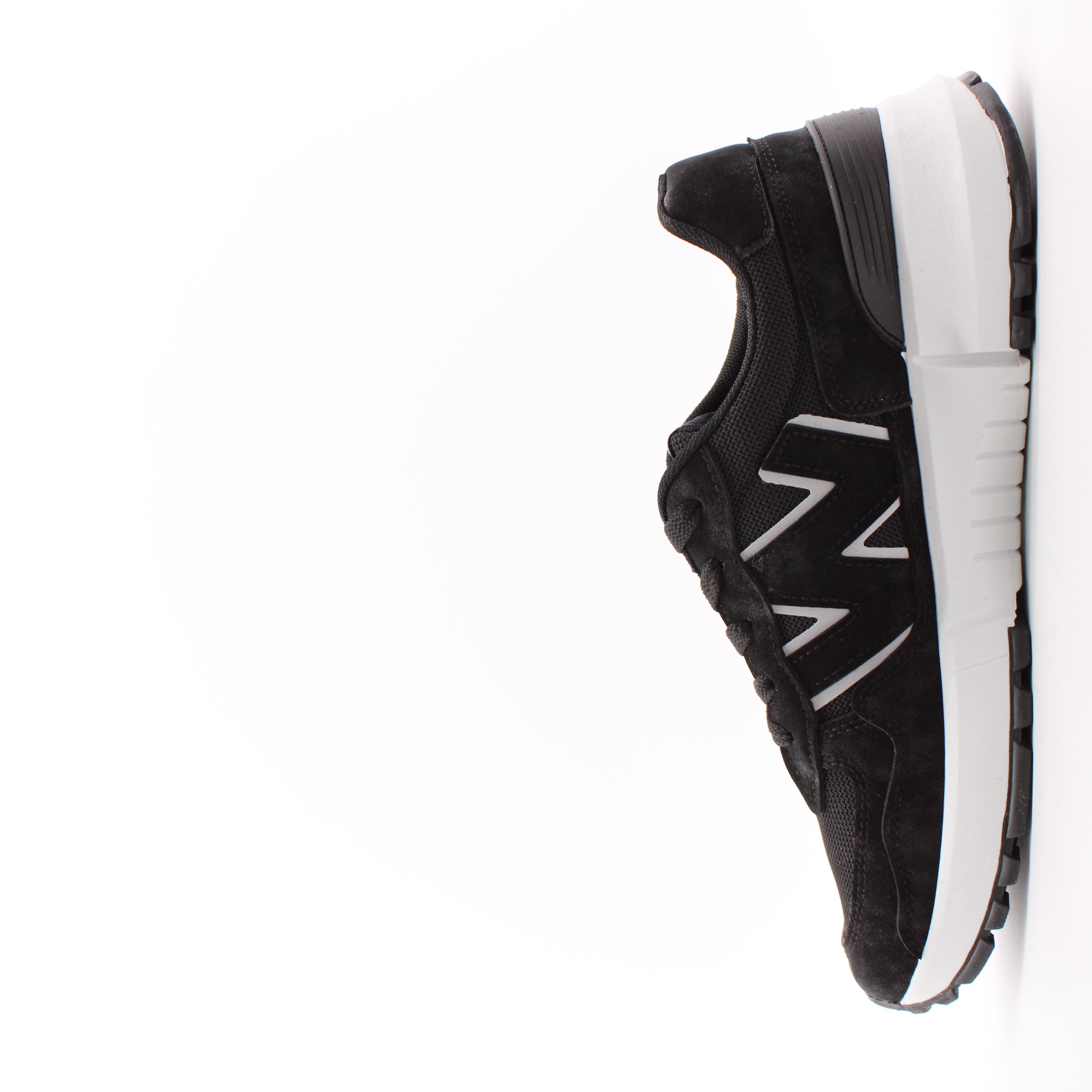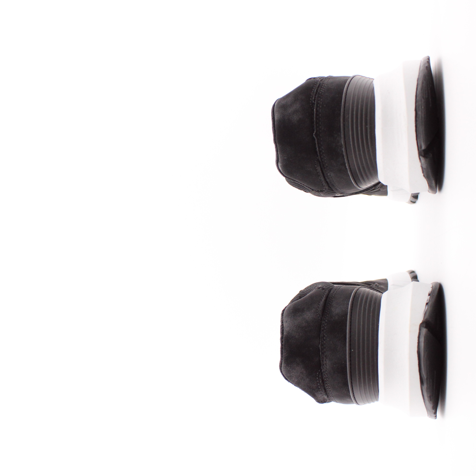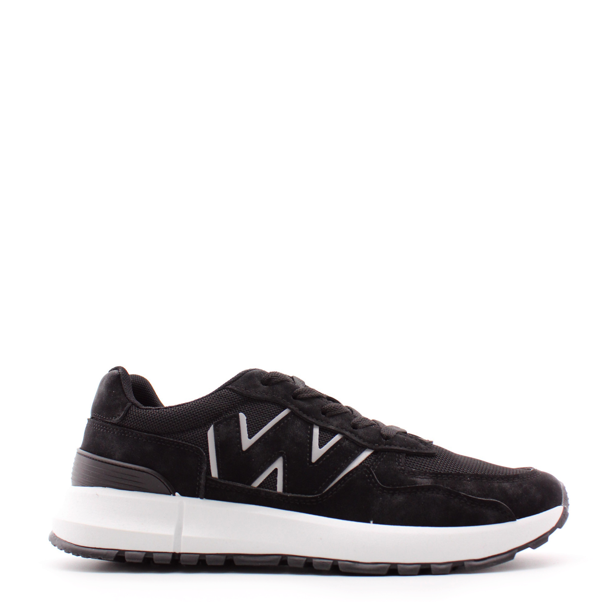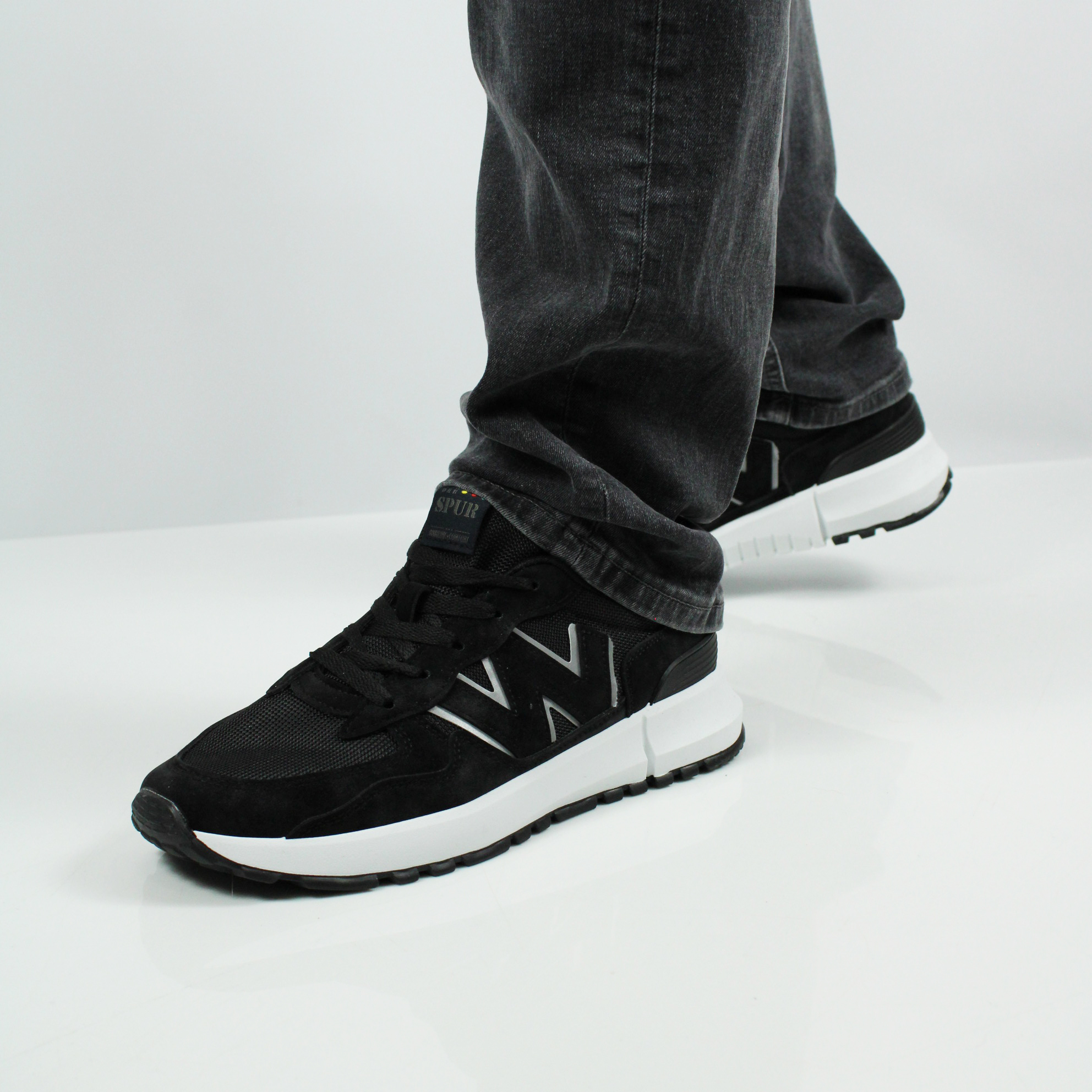 Чёрные кроссовки на белой подошве.