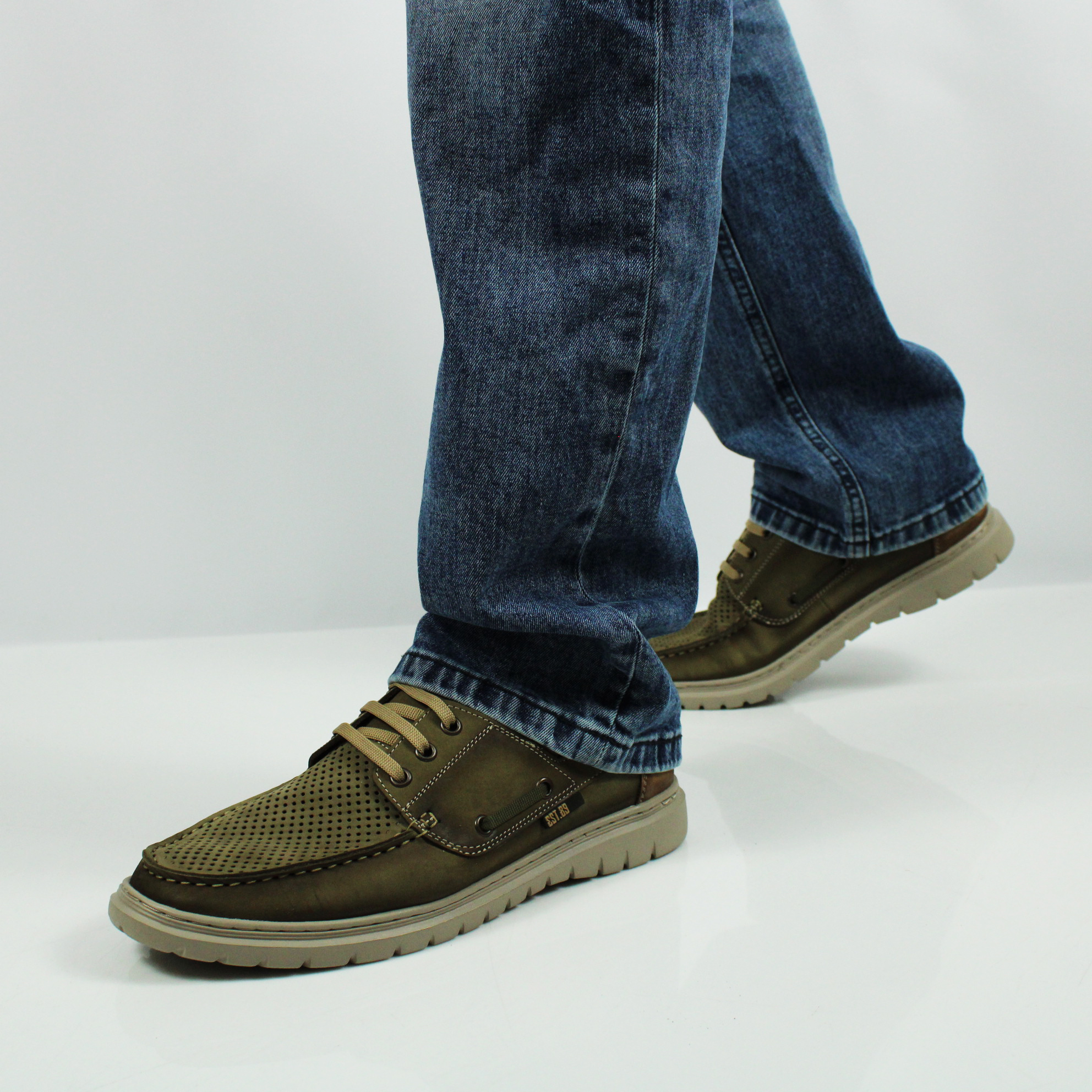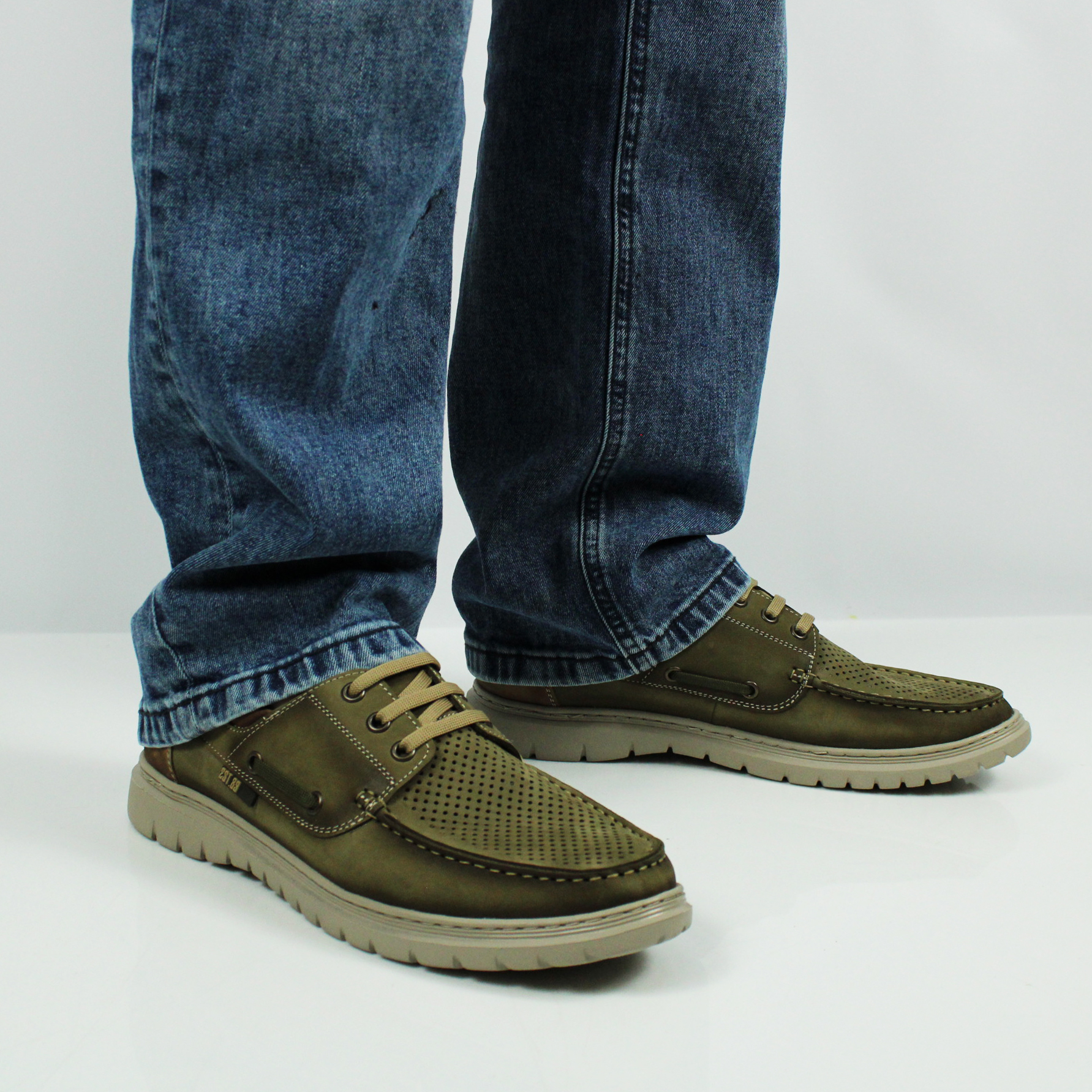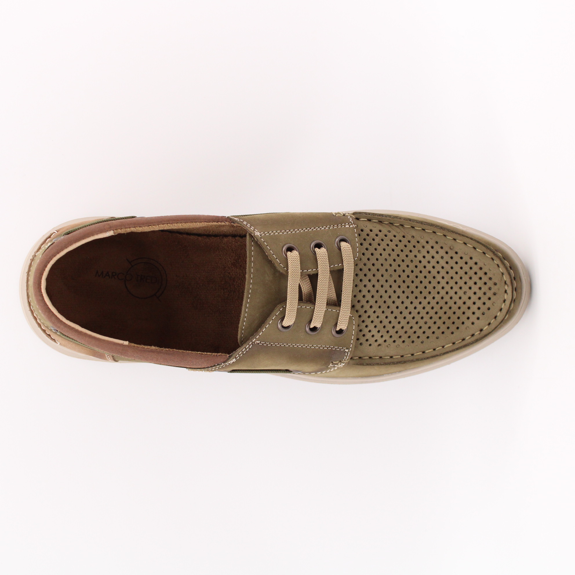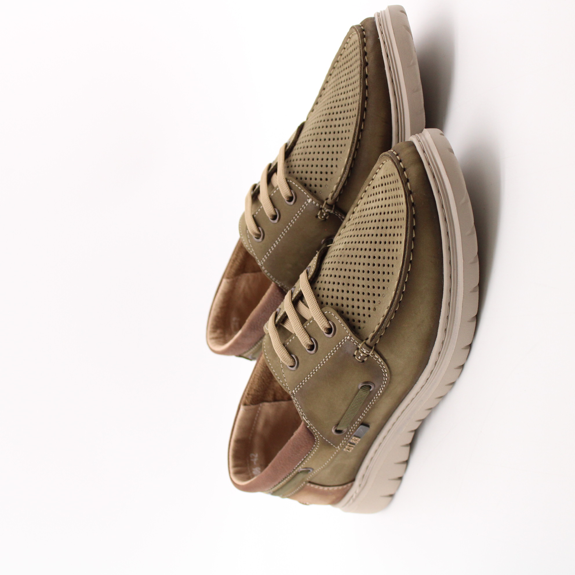 Топсайдеры цвета хаки с перфорированной носочной частью для комфортного микроклимата стопы. Модель выполнена на ультралёгкой подошве, что создаёт удобство при ходьбе.