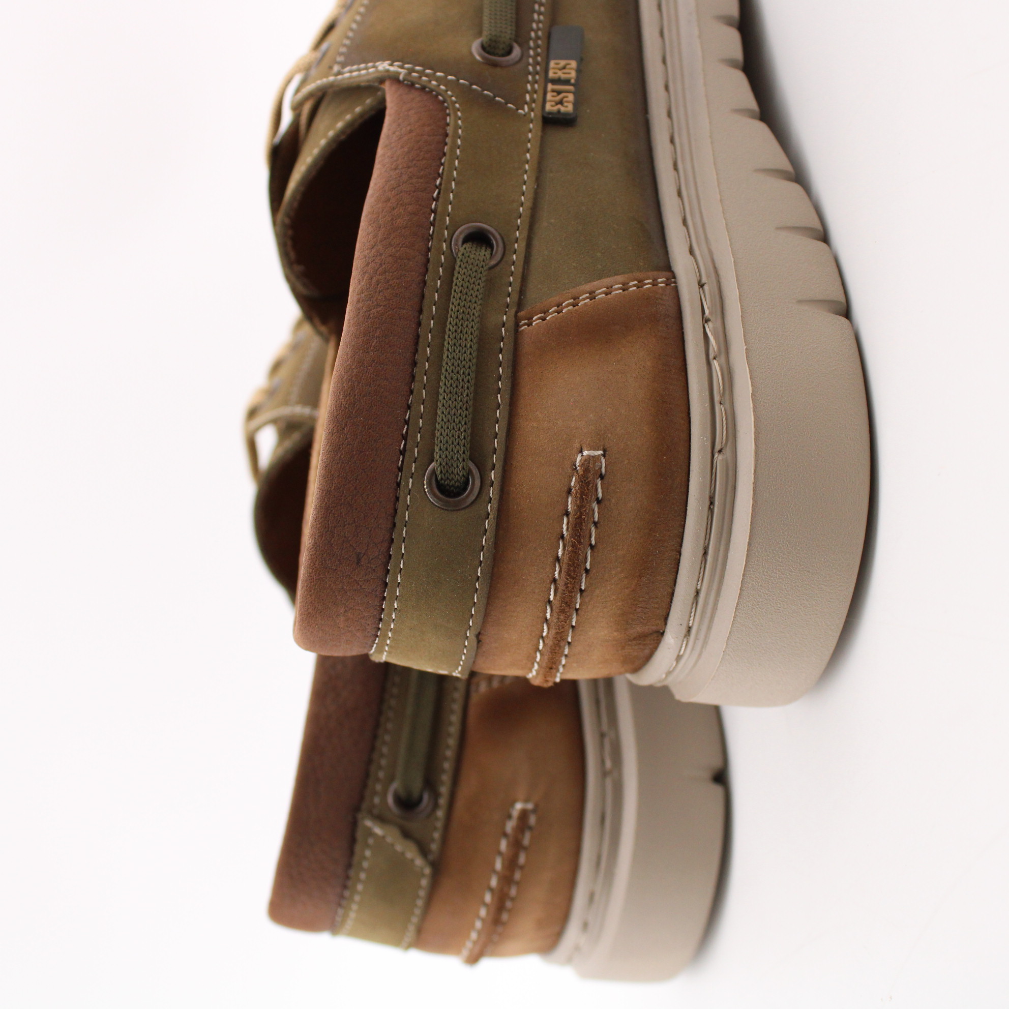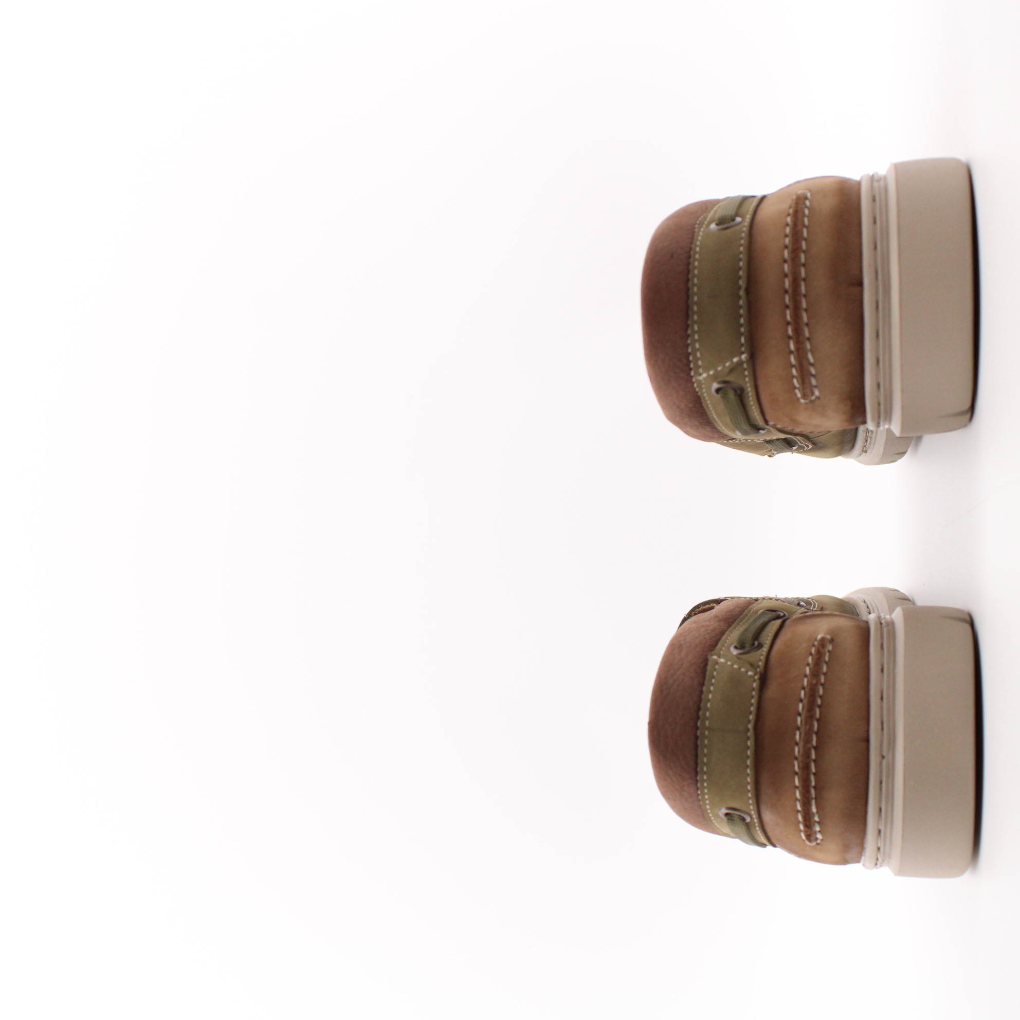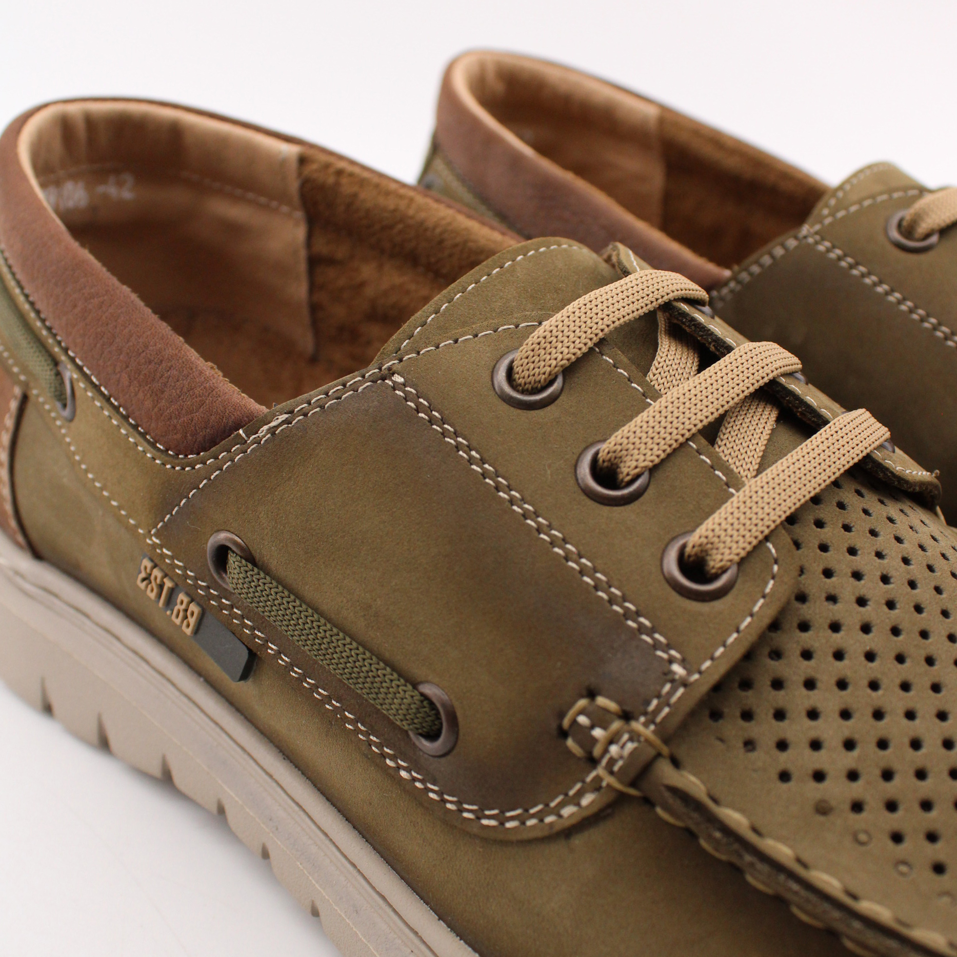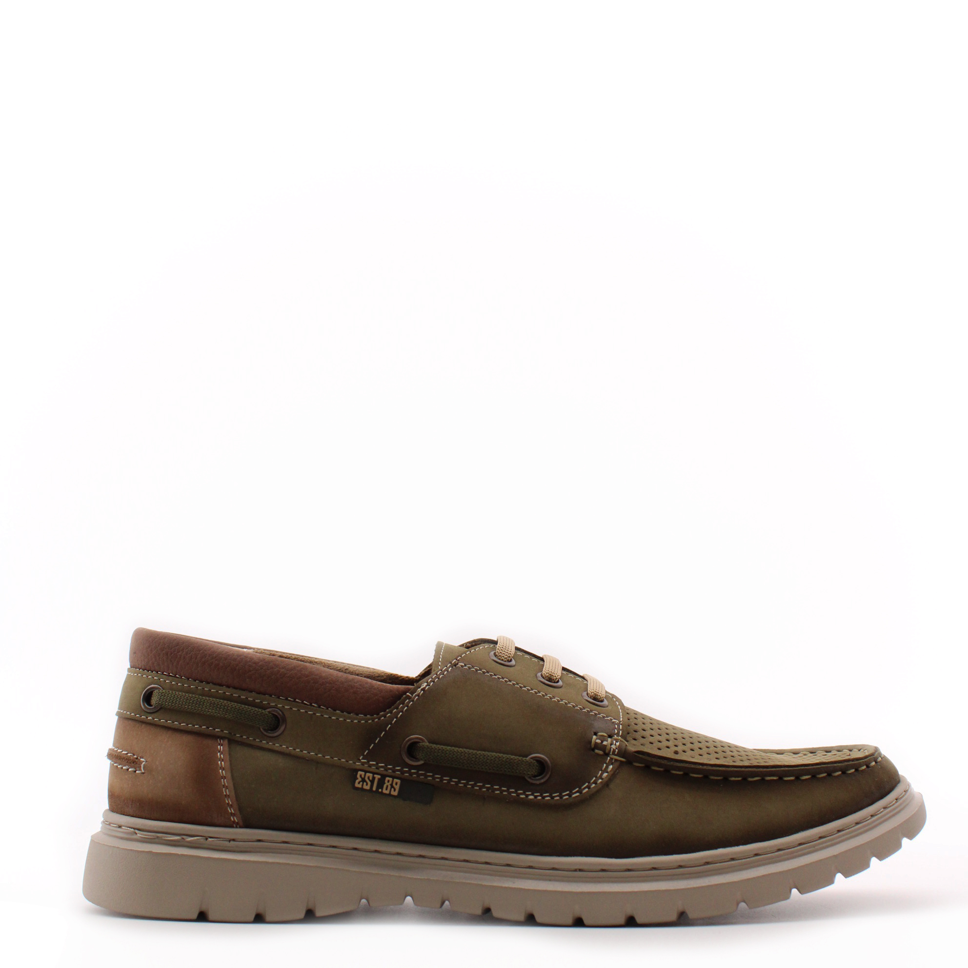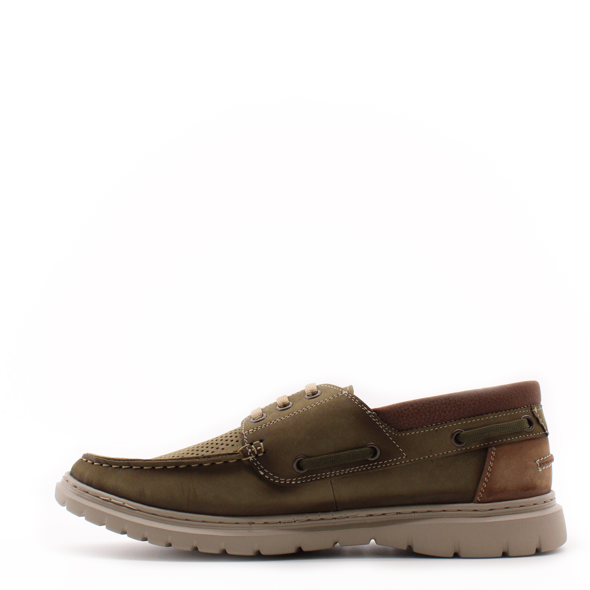 Топсайдеры цвета хаки с перфорированной носочной частью для комфортного микроклимата стопы. Модель выполнена на ультралёгкой подошве, что создаёт удобство при ходьбе.