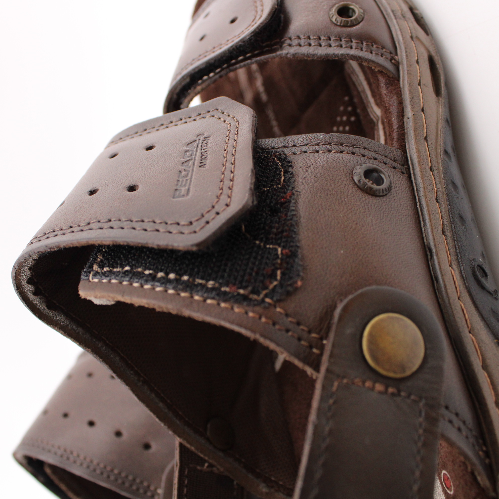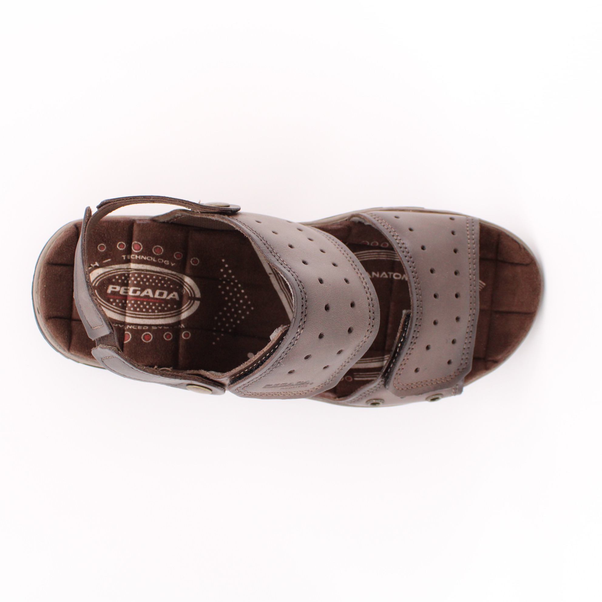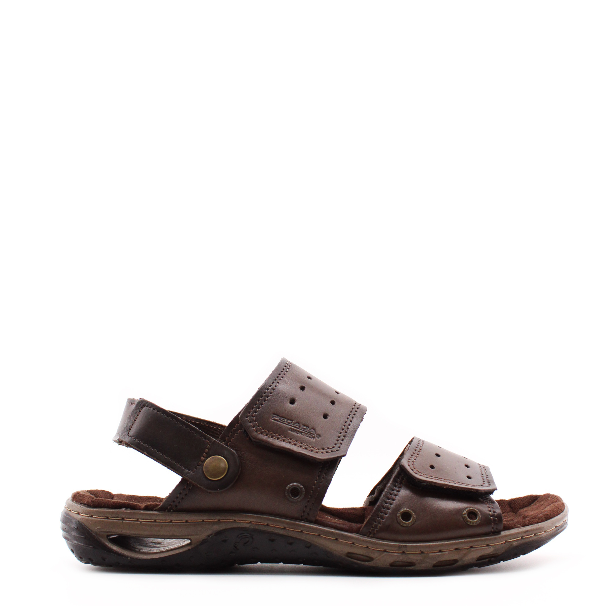 Коричневые сандалии на липучках от бразильского бренда PEGADA. Верх модели выполнен из натуральной кожи на мягком текстильном подкладе, с дополнительной перфоацией для лучшего воздухообмена. Воздушные камеры в носочной и пяточной частях подошвы дают повышенную амортизацию при ходьбе. Внутренняя стелька, с ударопоглощающим гелем внутри,  прошита износостойким тектильным материалом по всей поверхности. Такая стелька способствует уменьшению давления в пятке, распределяя вес и обеспечивая большую мягкость. В задний ремень вшита плотная резинка для дополнительного комфортного надевания. Ремни на тыльной стороне стопы оснащены прочными залипами, которые позволяют отрегулировать модель по взъём