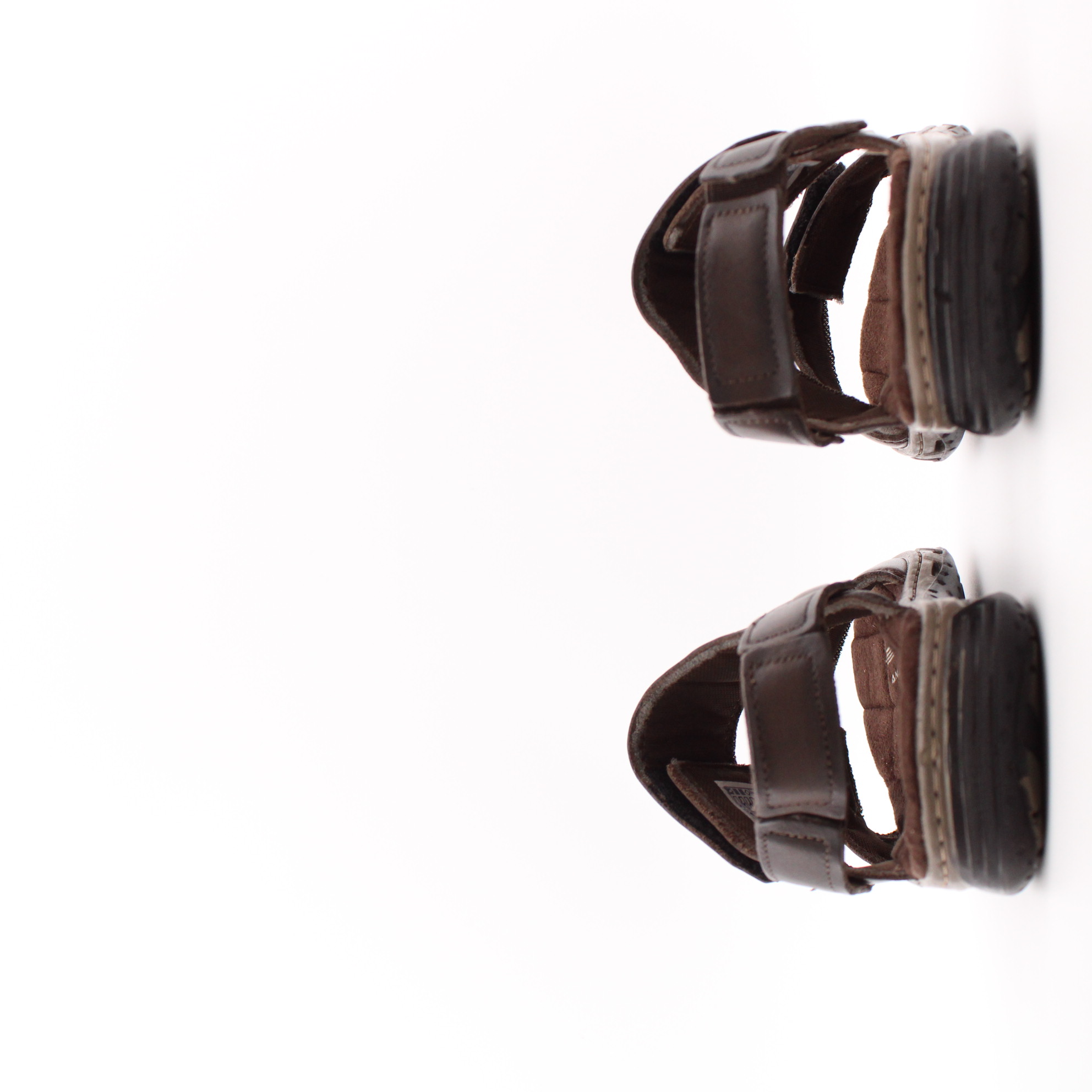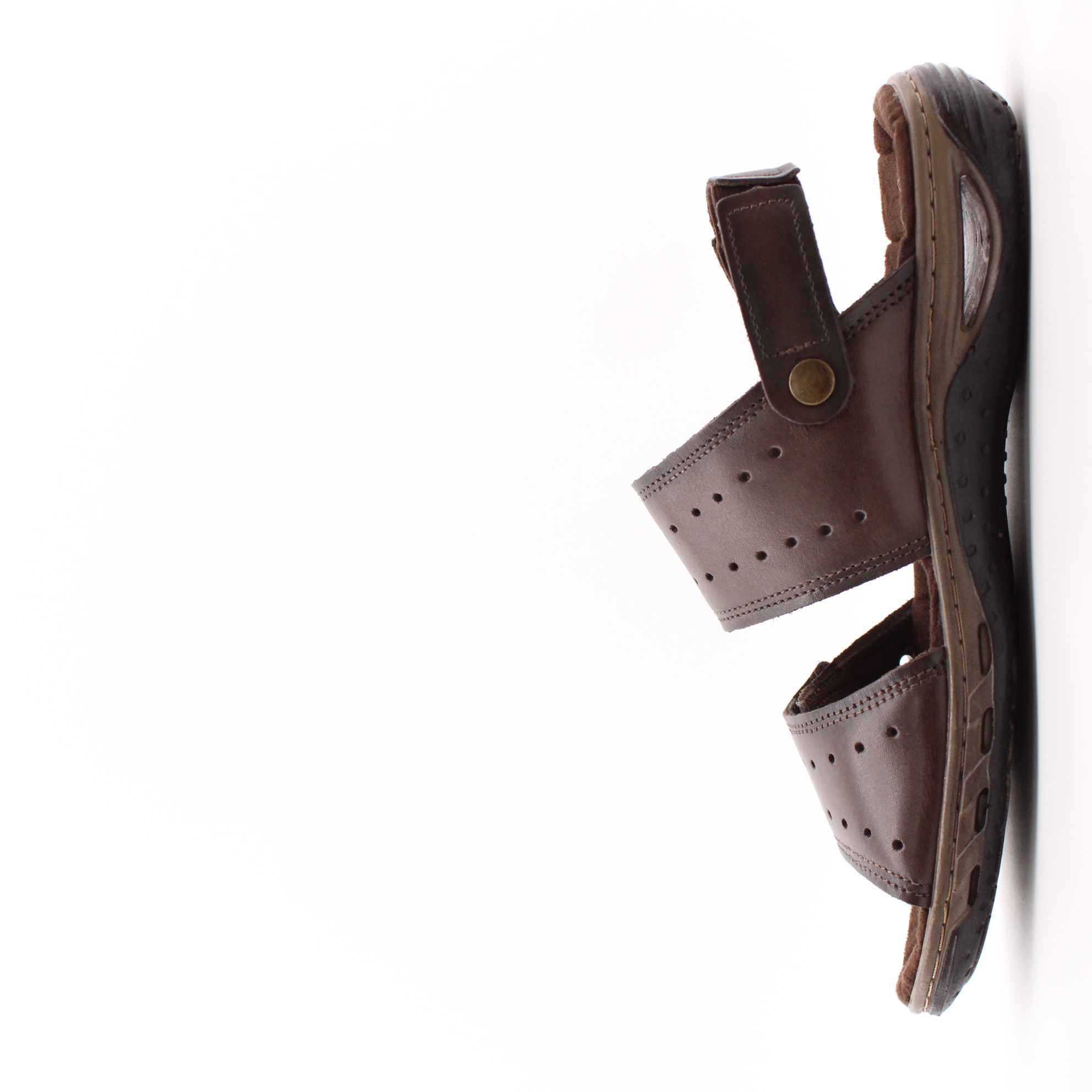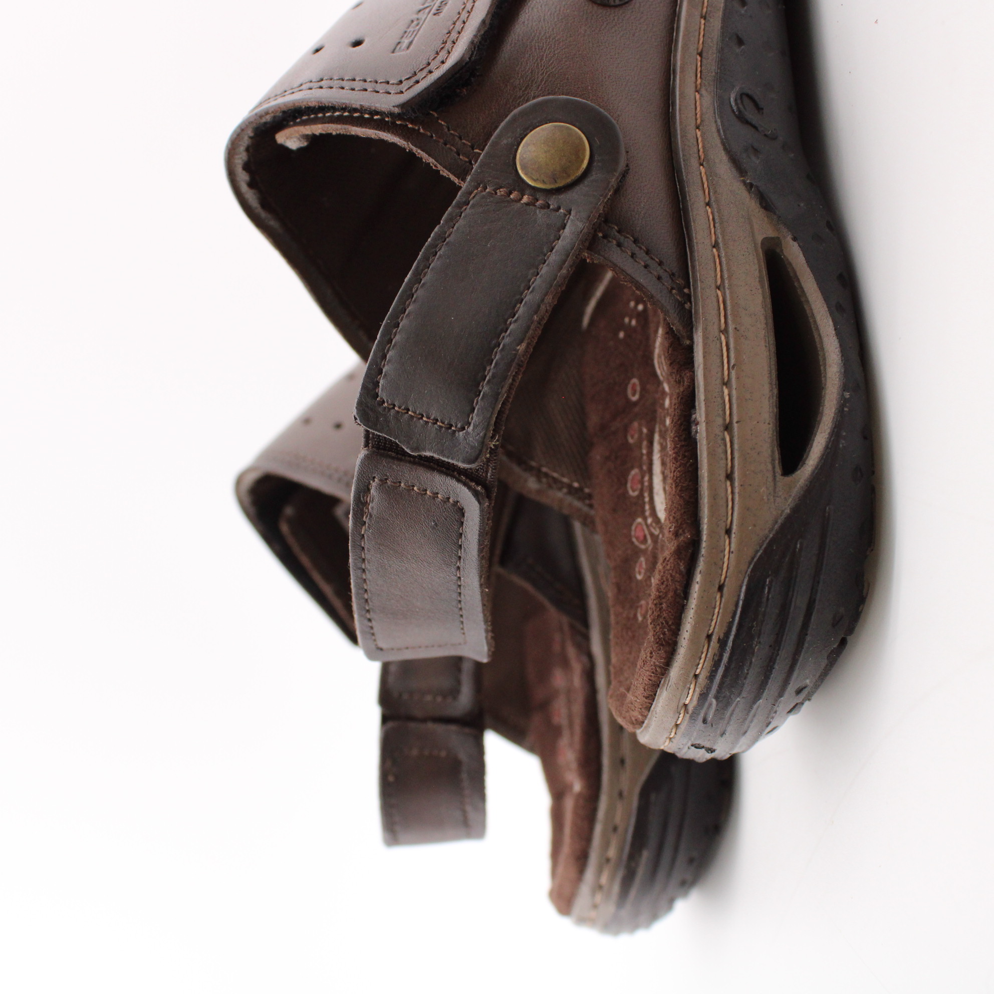 Коричневые сандалии на липучках от бразильского бренда PEGADA. Верх модели выполнен из натуральной кожи на мягком текстильном подкладе, с дополнительной перфоацией для лучшего воздухообмена. Воздушные камеры в носочной и пяточной частях подошвы дают повышенную амортизацию при ходьбе. Внутренняя стелька, с ударопоглощающим гелем внутри,  прошита износостойким тектильным материалом по всей поверхности. Такая стелька способствует уменьшению давления в пятке, распределяя вес и обеспечивая большую мягкость. В задний ремень вшита плотная резинка для дополнительного комфортного надевания. Ремни на тыльной стороне стопы оснащены прочными залипами, которые позволяют отрегулировать модель по взъём