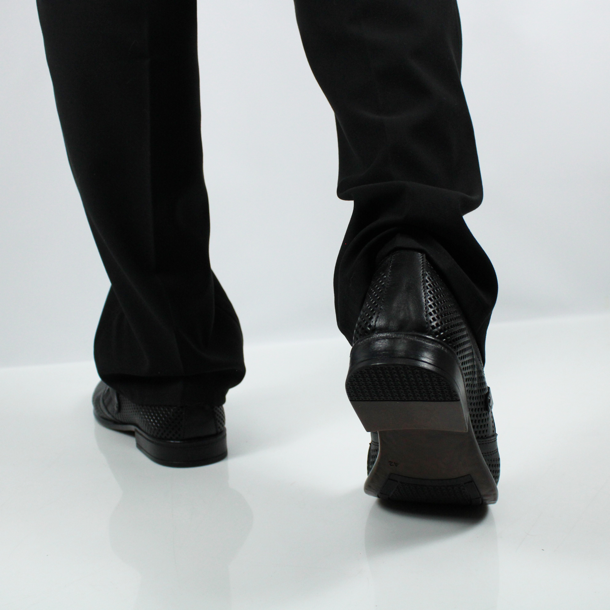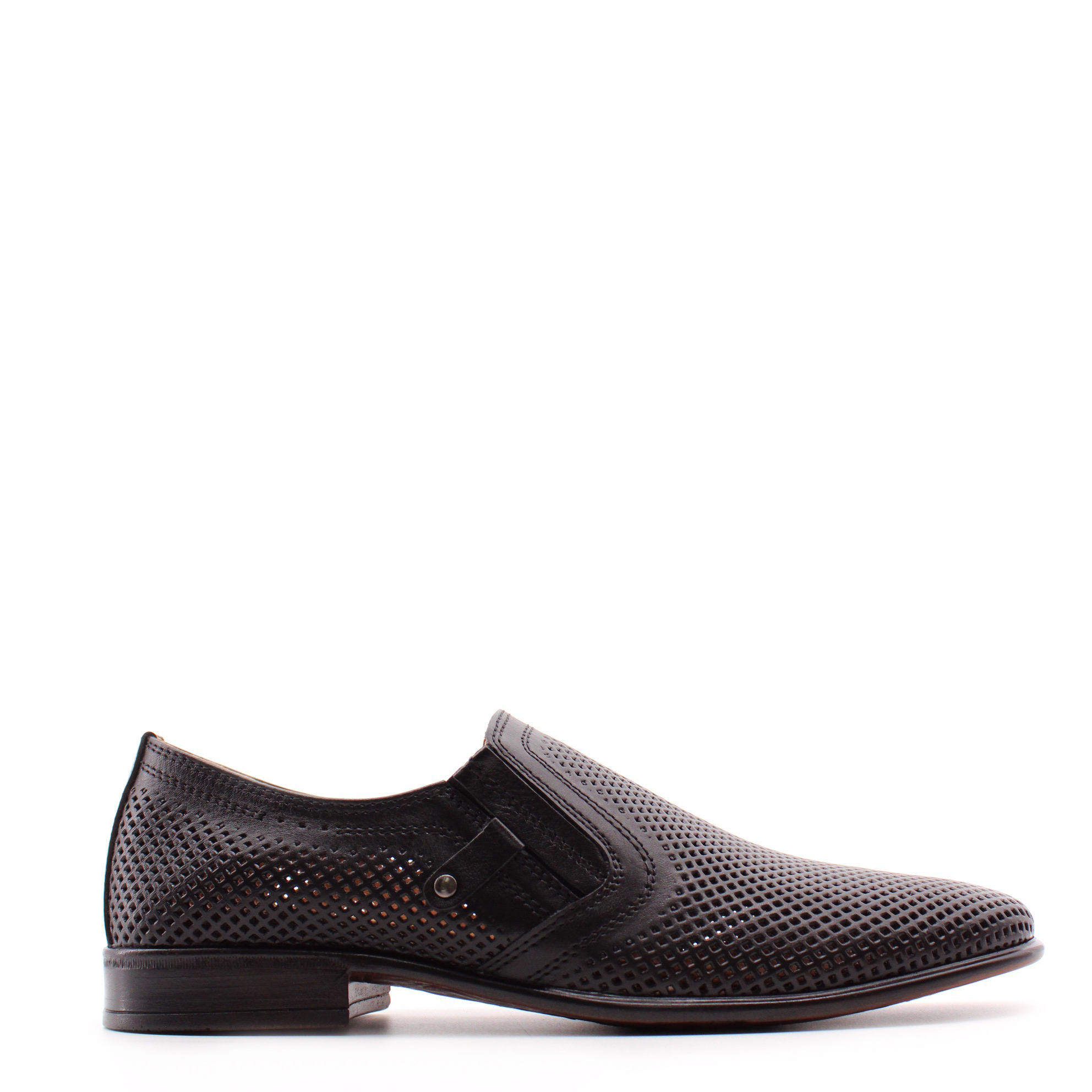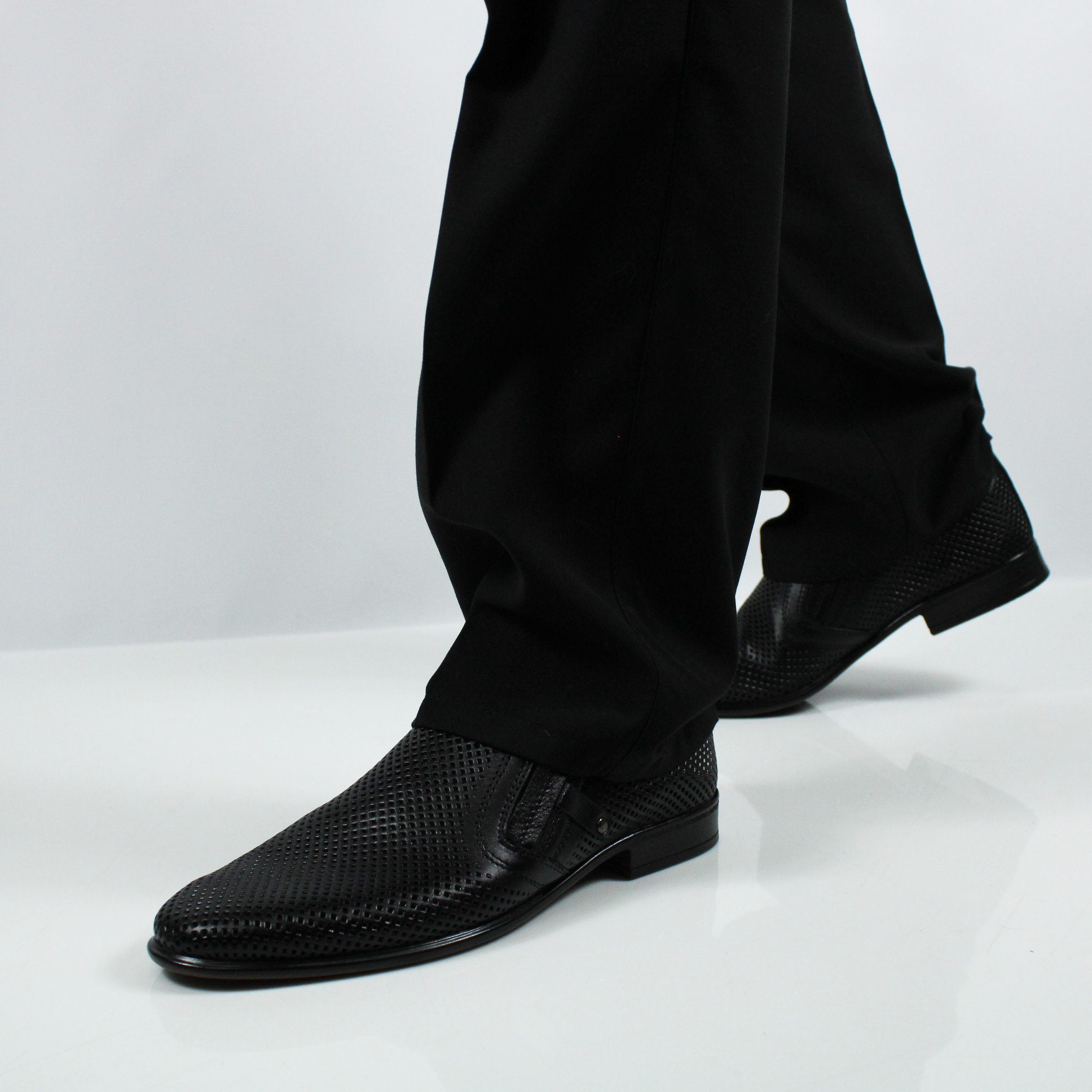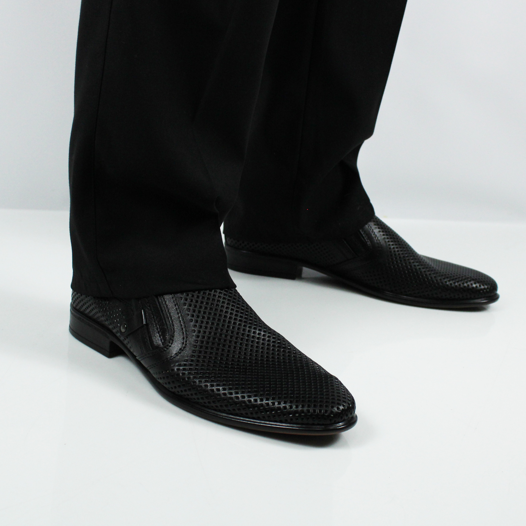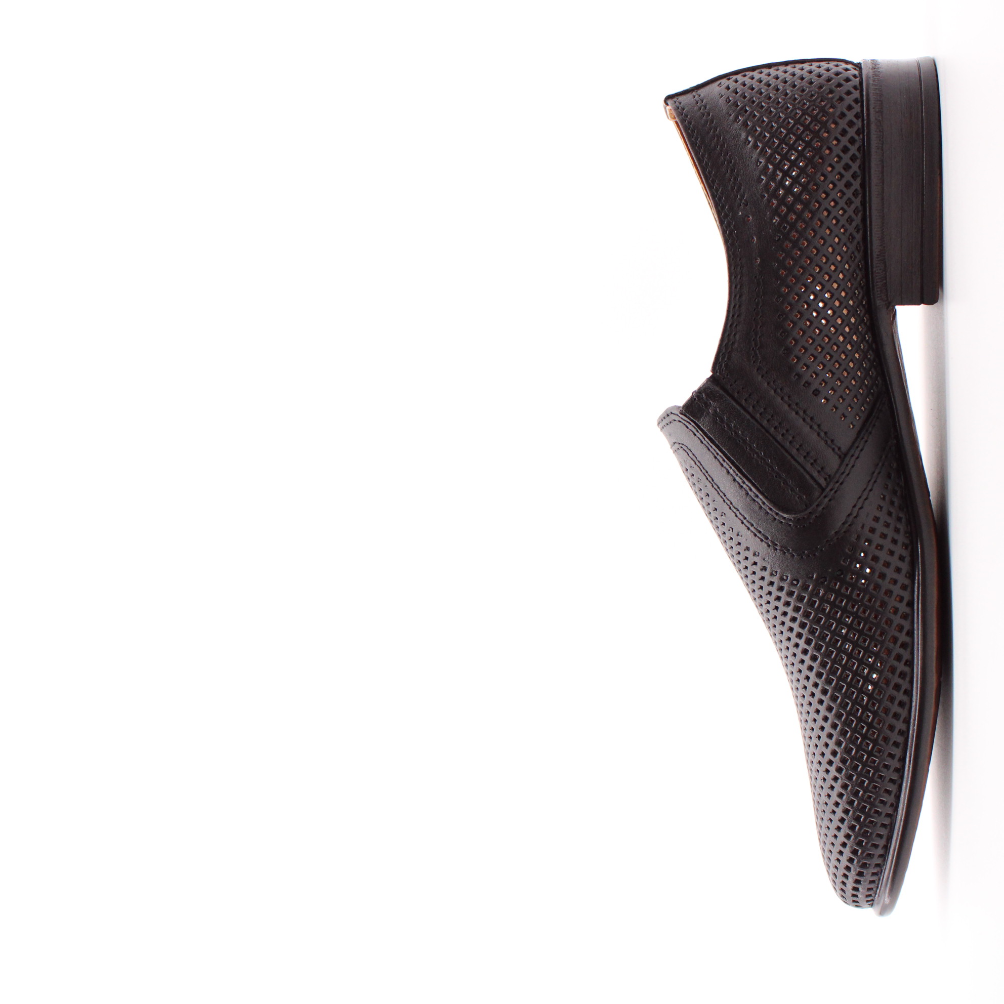 Классические мужские туфли чёрного цвета без шнурка. Модель полностью перфорирована для комфортного микроклимата стопы в тёплое время года.