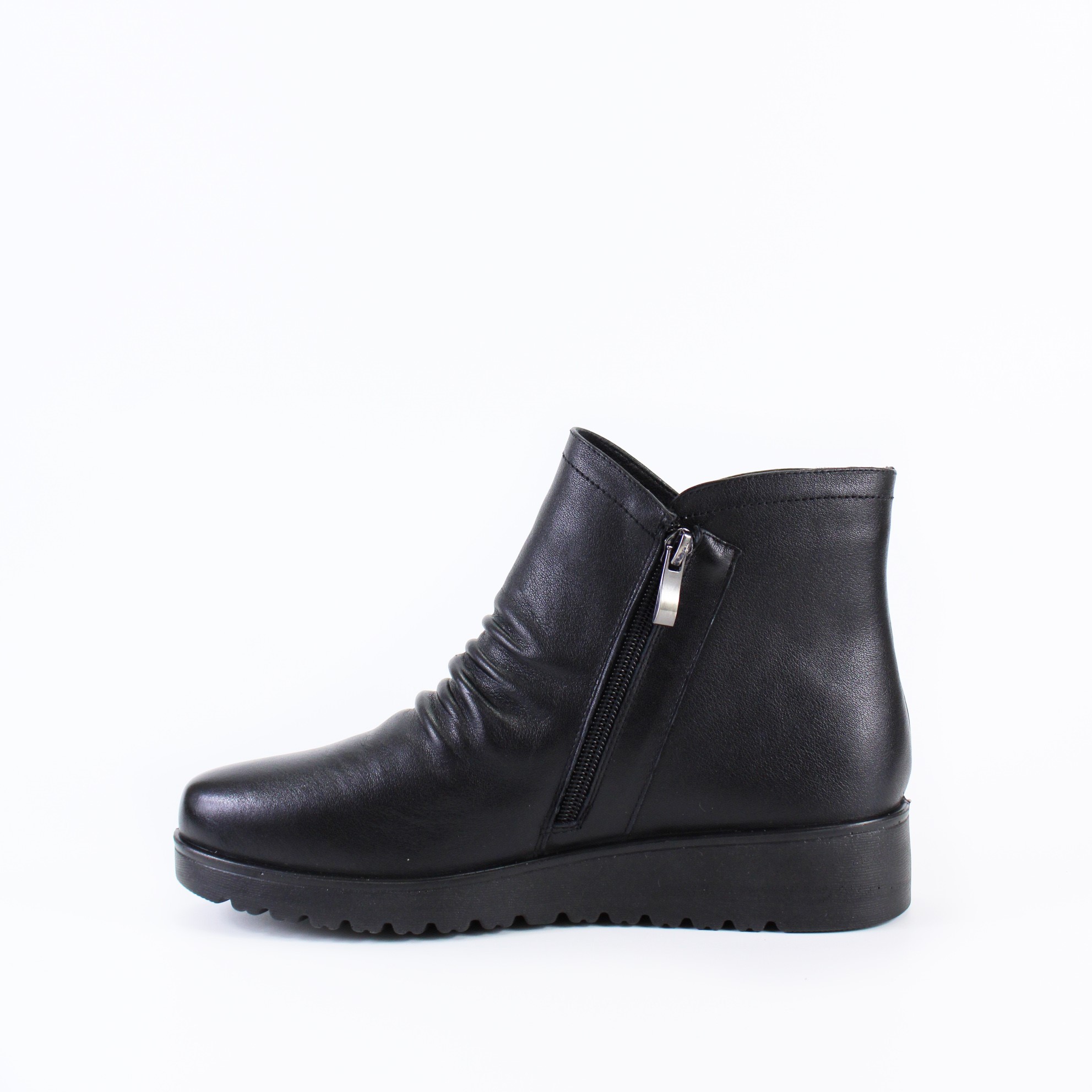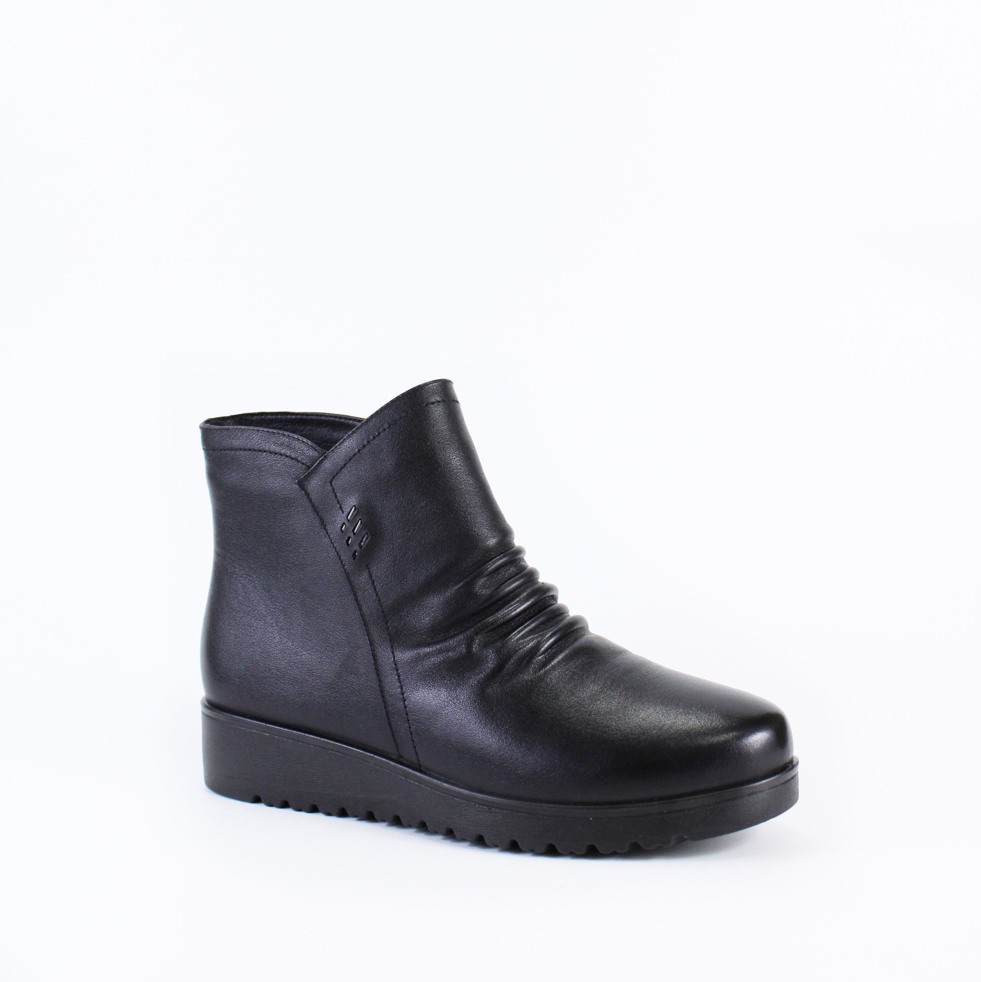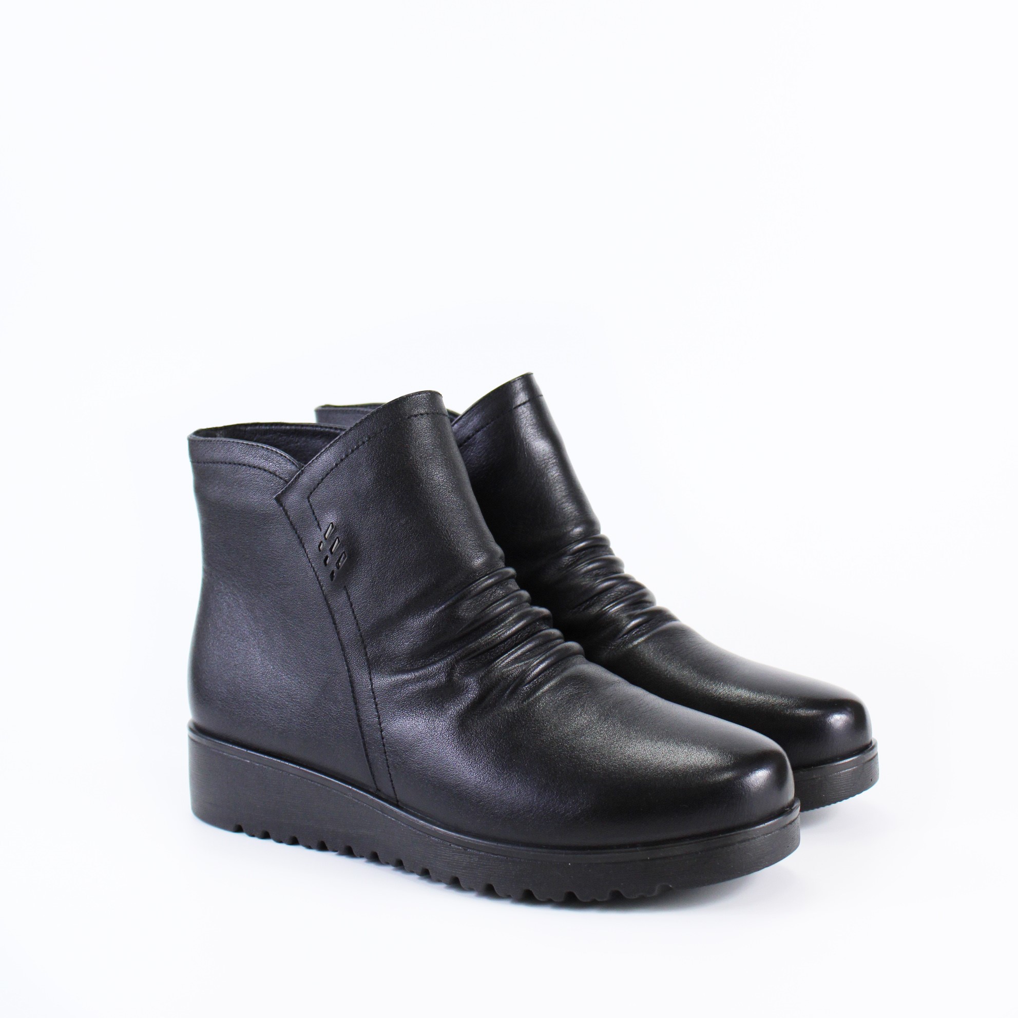 Чёрные демисезонные ботинки на небольшой танкетке на широкую и объемную ногу. Модель выполнена с имитацией нахлеста передней части на заднюю и прострочена в тон ботинок. Утолщенная подошва-горка и кожаные складки на тыльной части придают этой модели изящность и особый шарм.