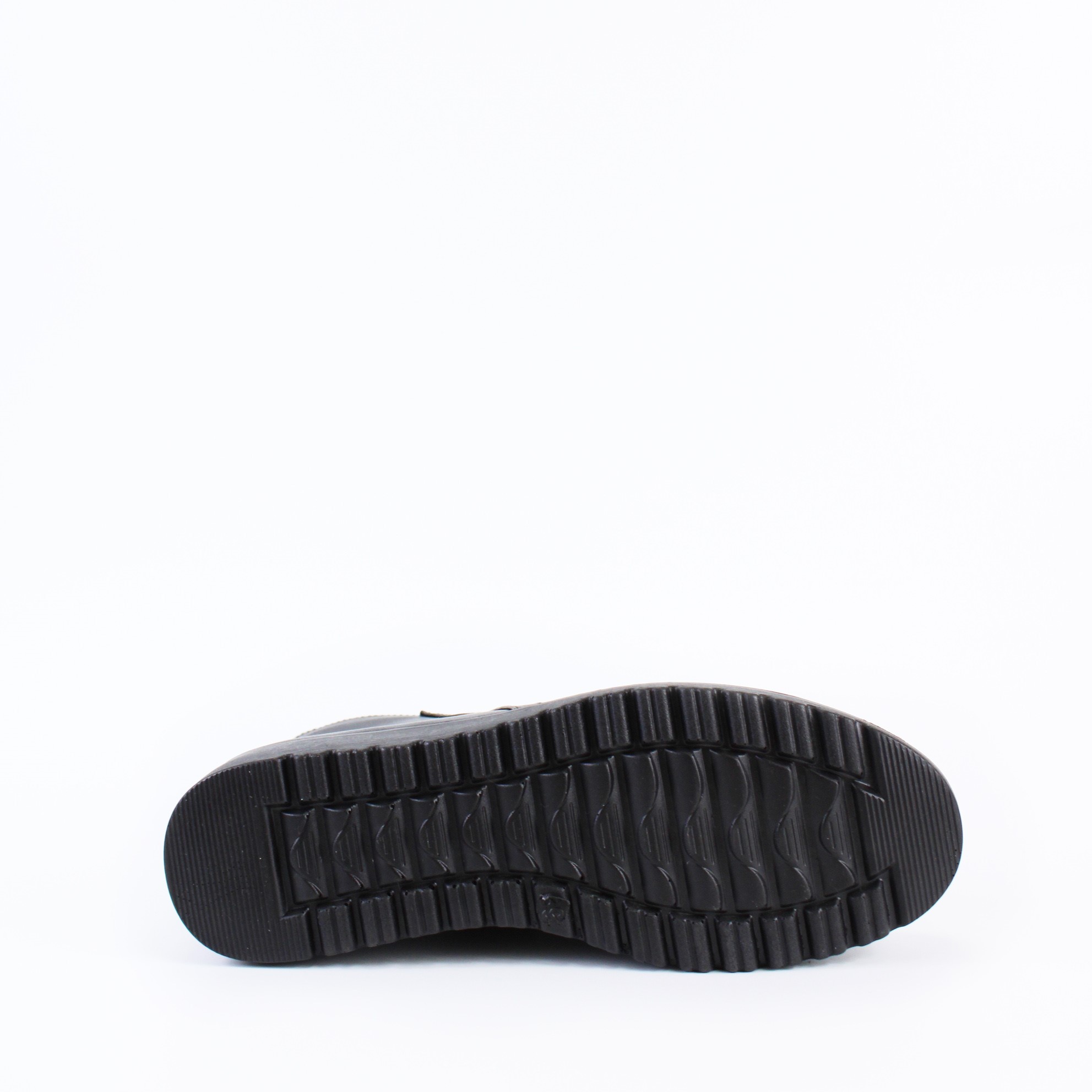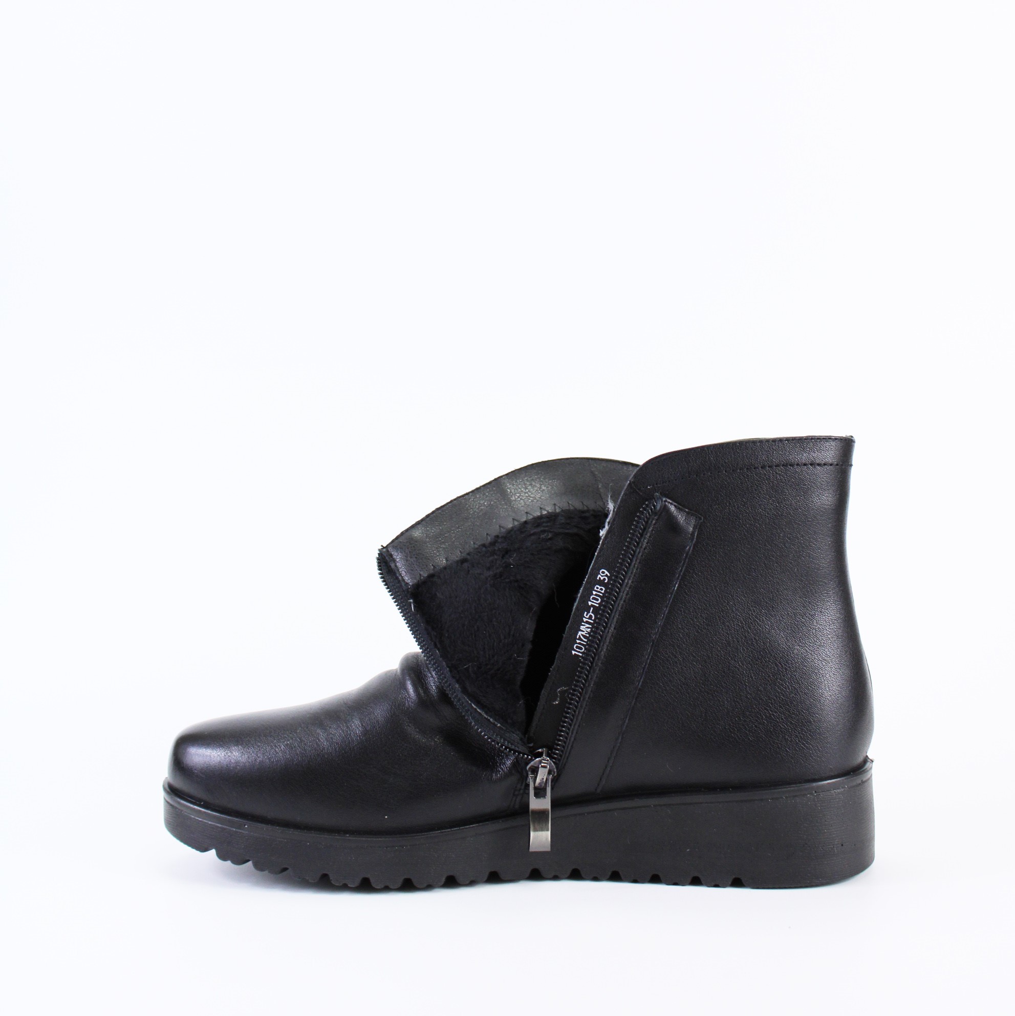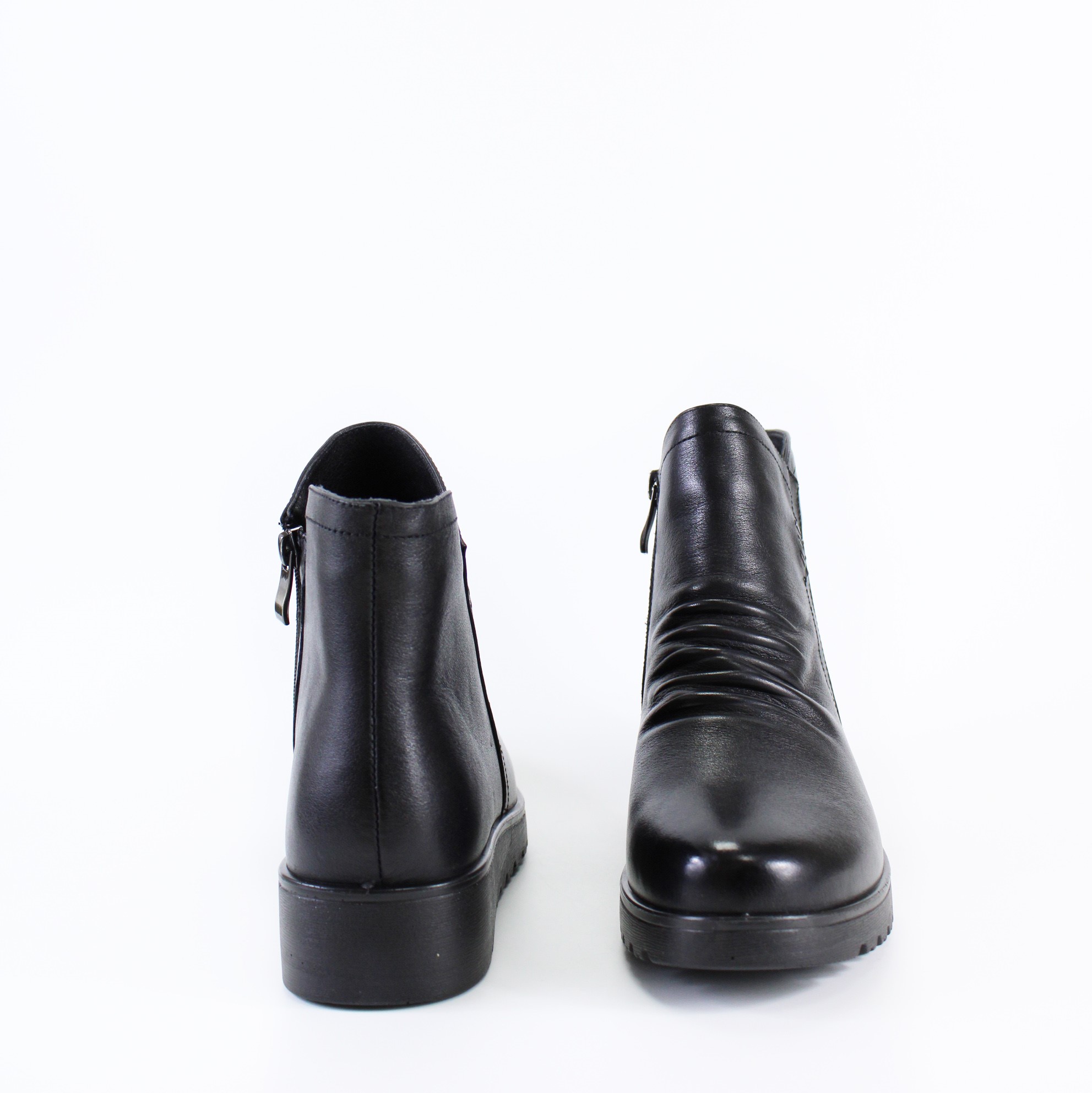 Чёрные демисезонные ботинки на небольшой танкетке на широкую и объемную ногу. Модель выполнена с имитацией нахлеста передней части на заднюю и прострочена в тон ботинок. Утолщенная подошва-горка и кожаные складки на тыльной части придают этой модели изящность и особый шарм.