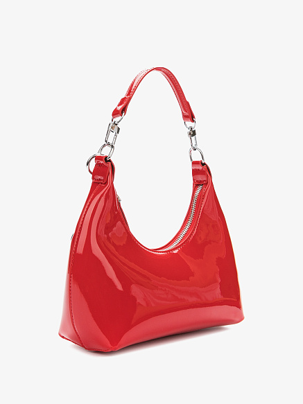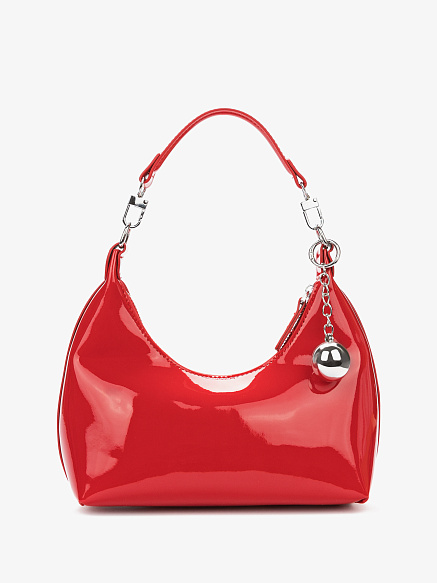 Ультрамодная красная сумка-полумесяц из лакированной высокотехнологичной кожи сделает вас центром внимания. Модель на молнии украшена серебристой подвеской-брелком. Внутри расположен дополнительный карман для мелочей.