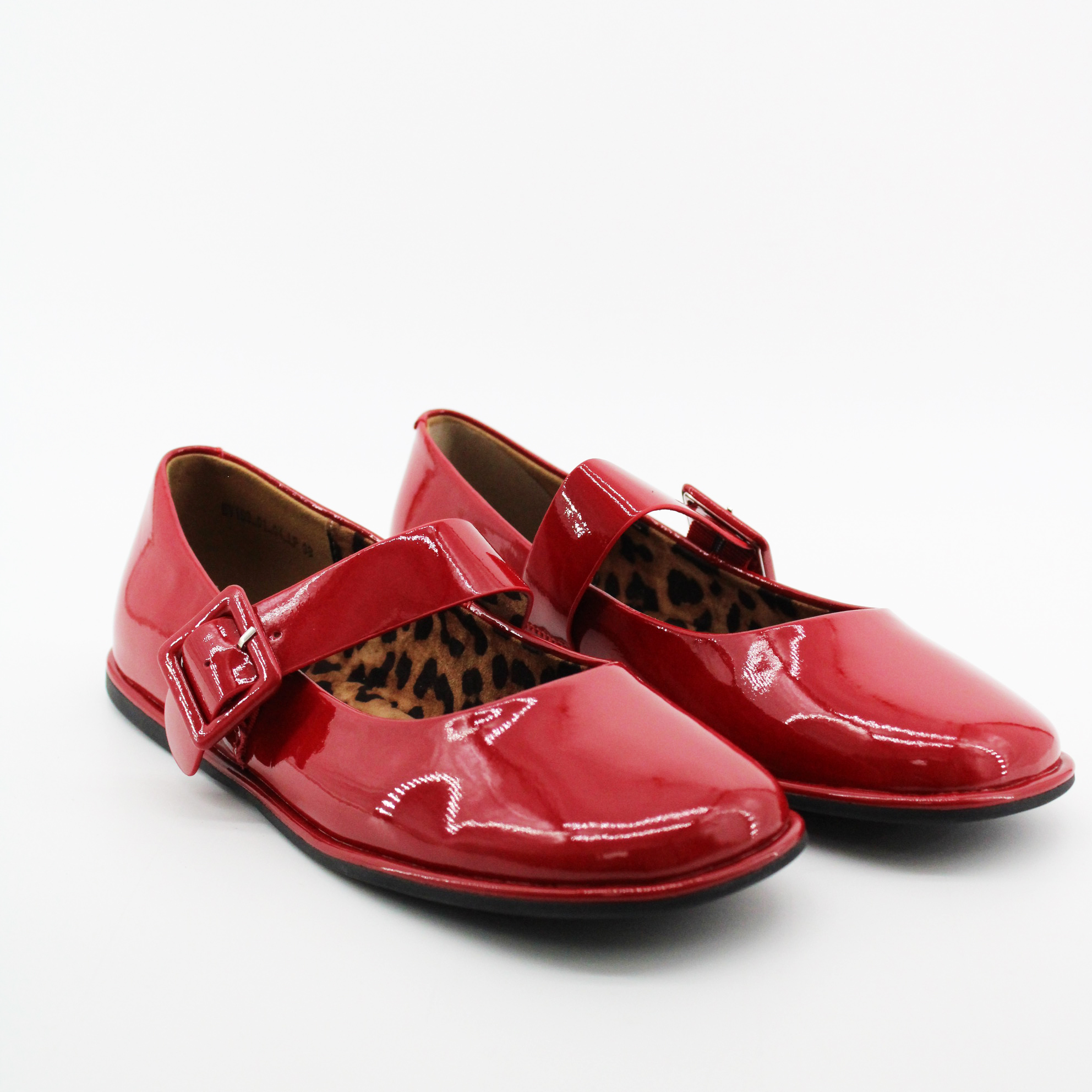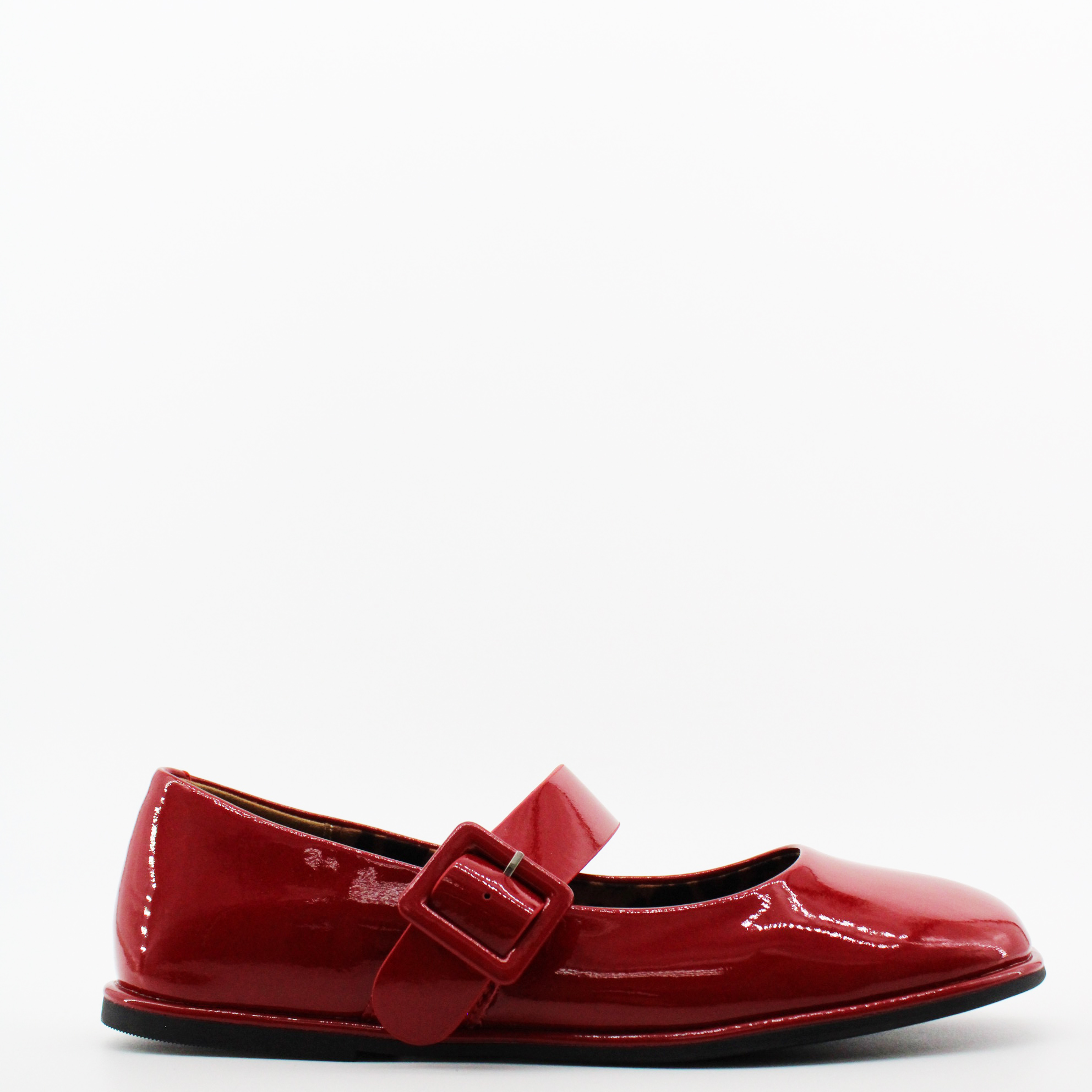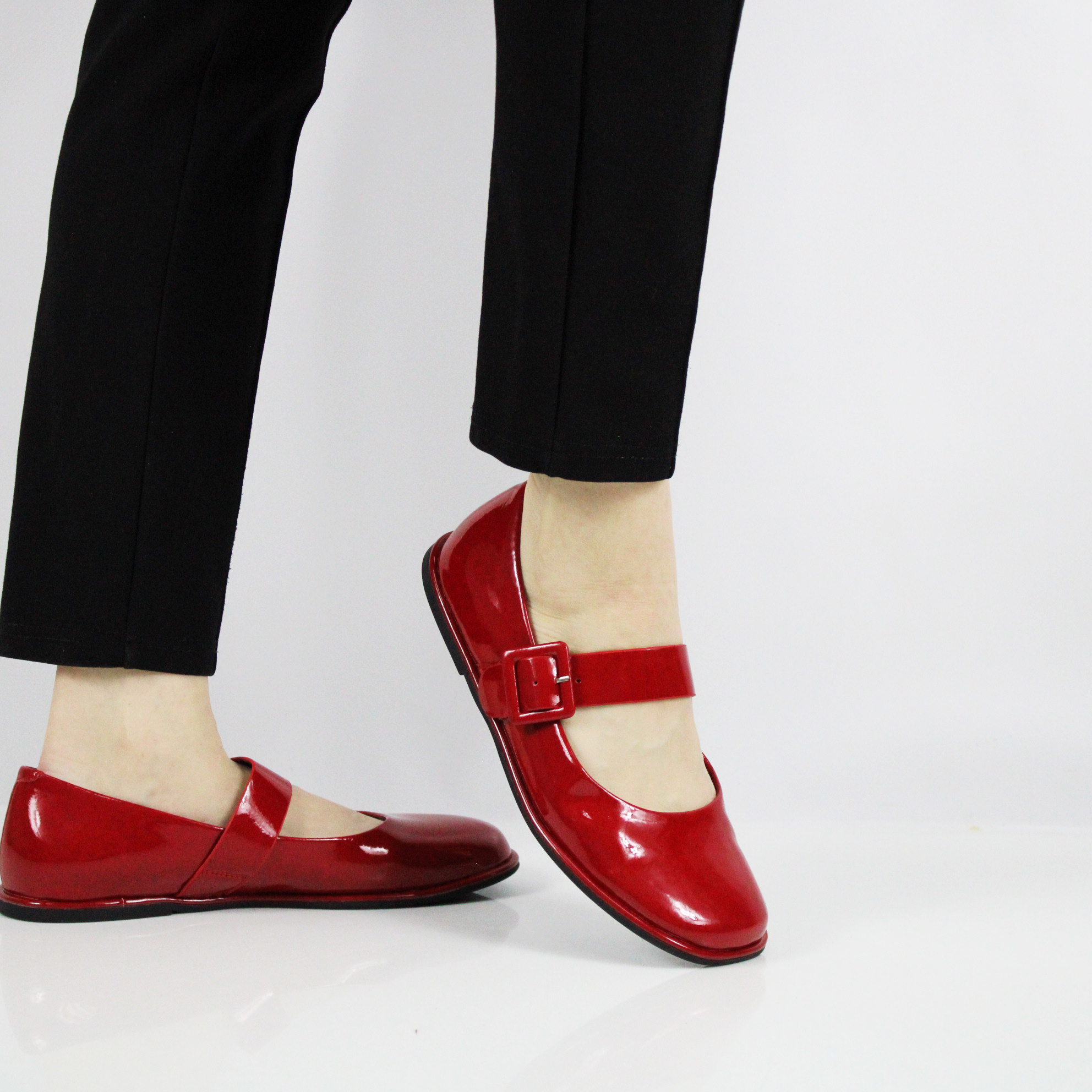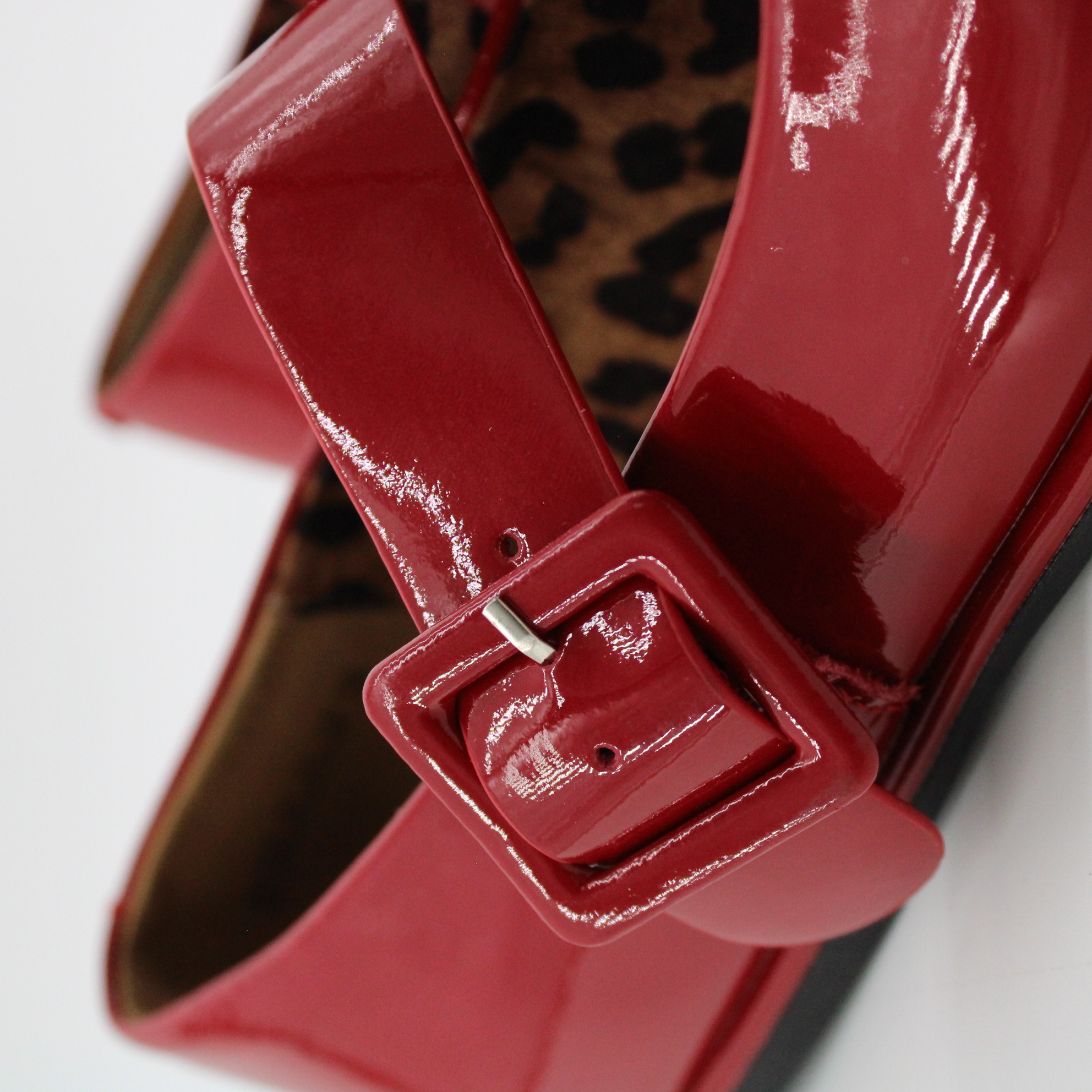 Красные лаковые туфли с пряжкой.