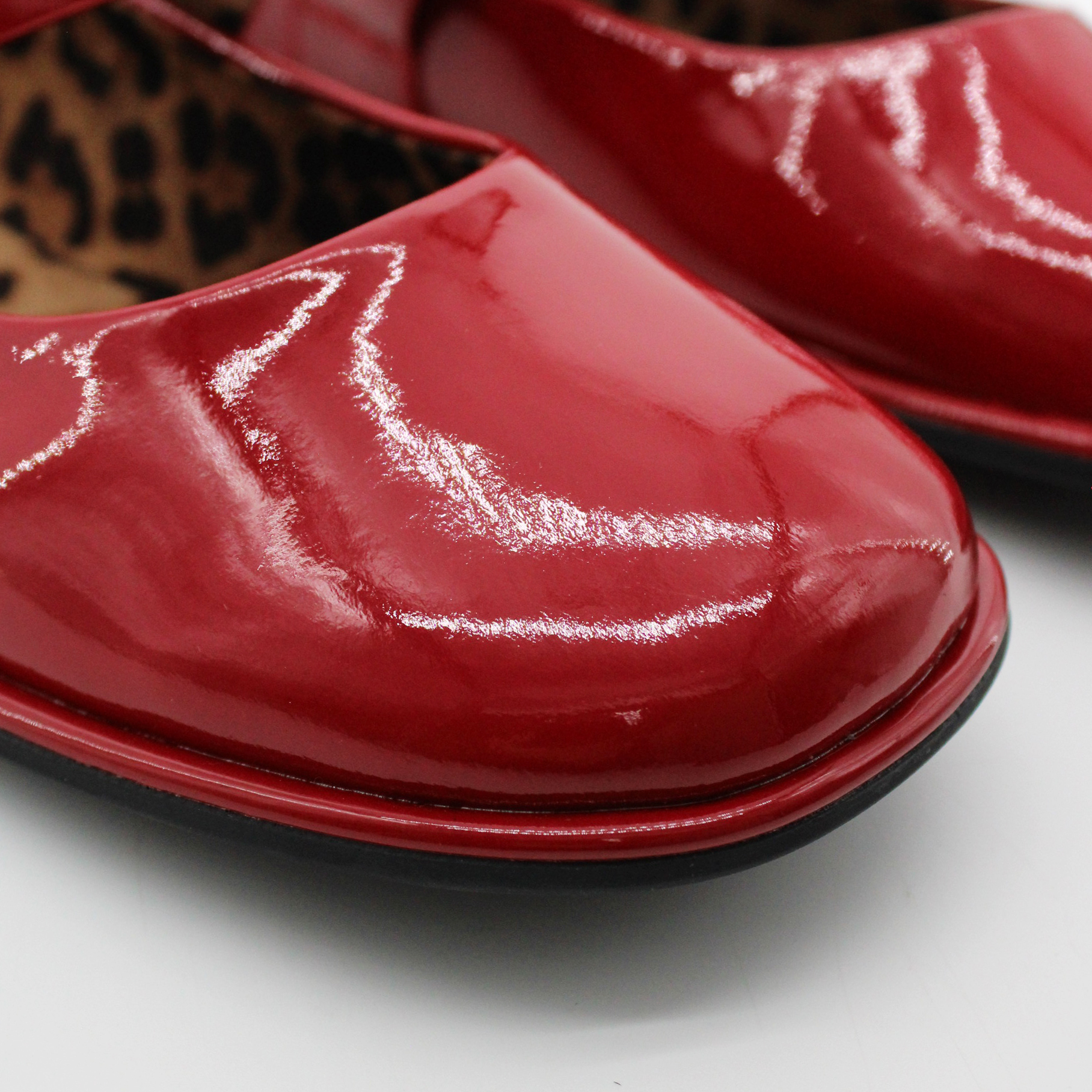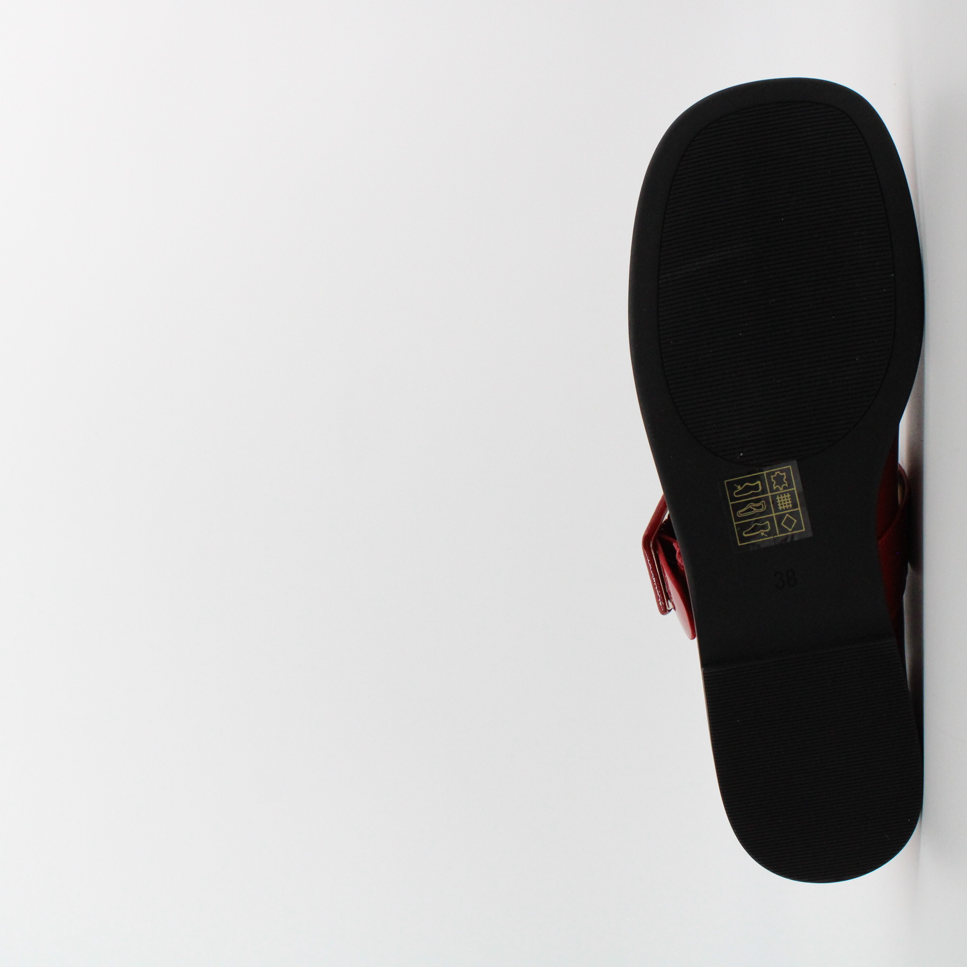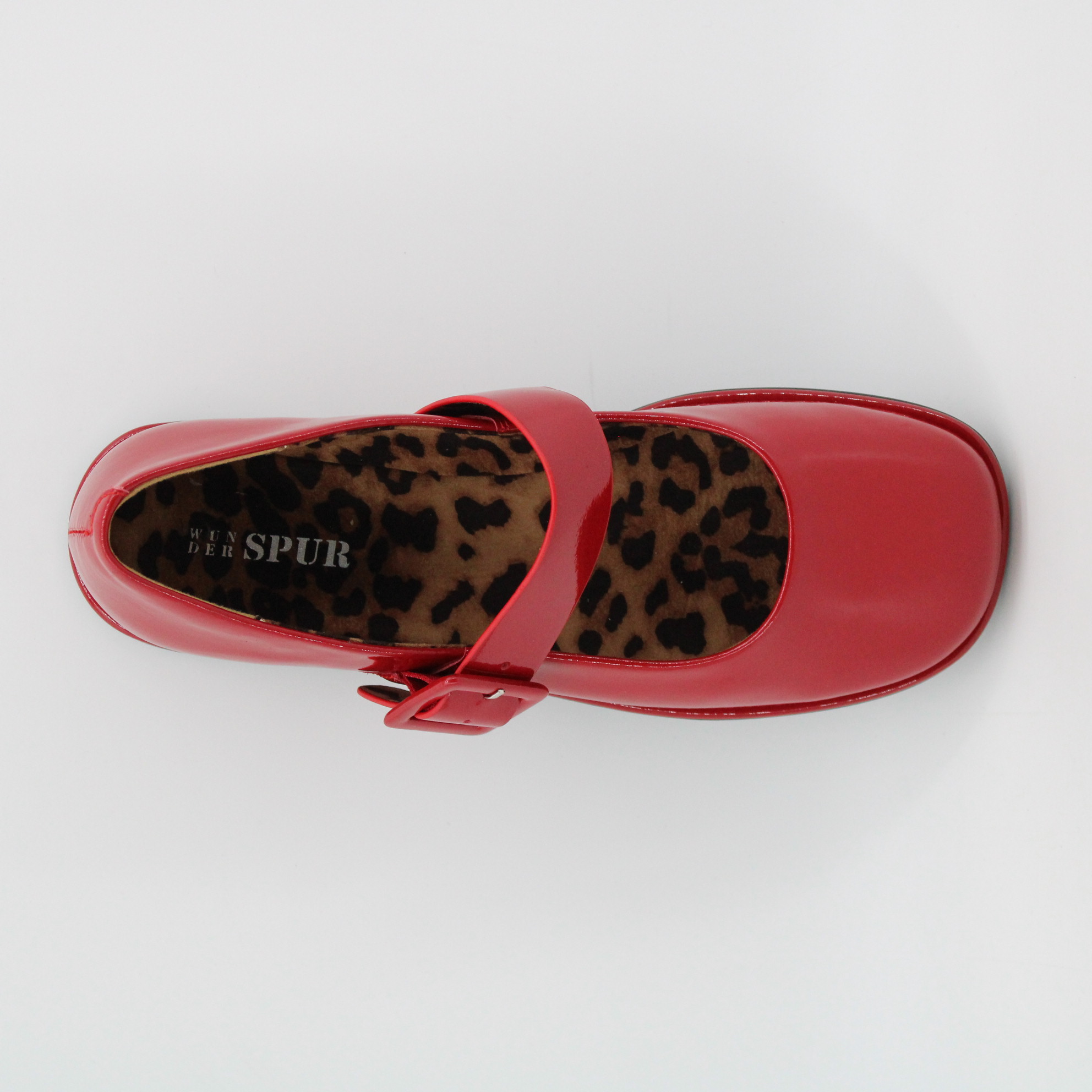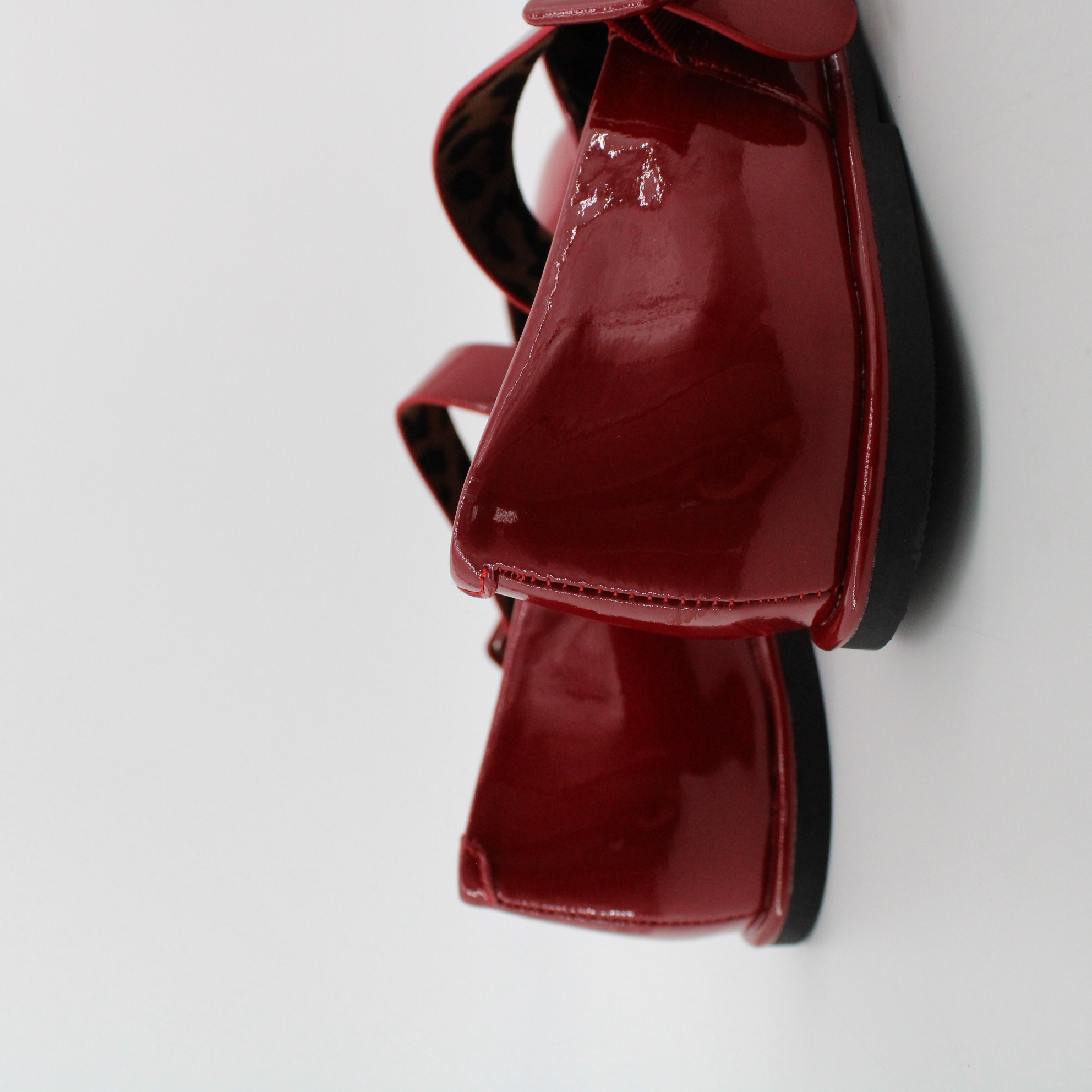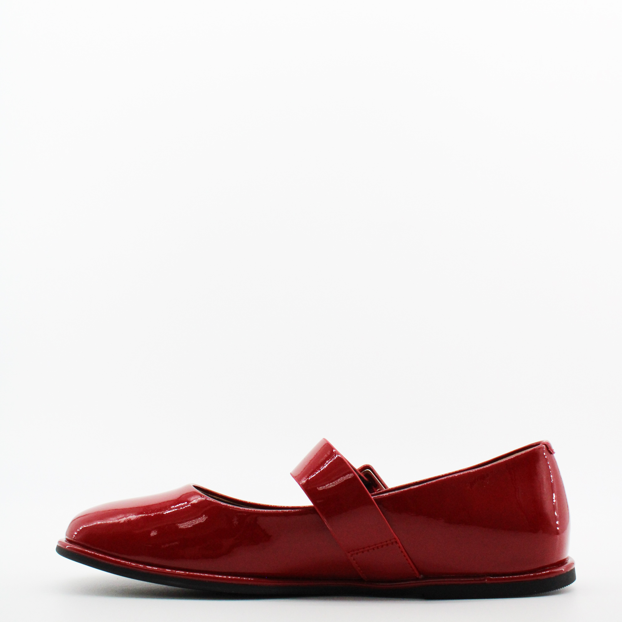 Красные лаковые туфли с пряжкой.