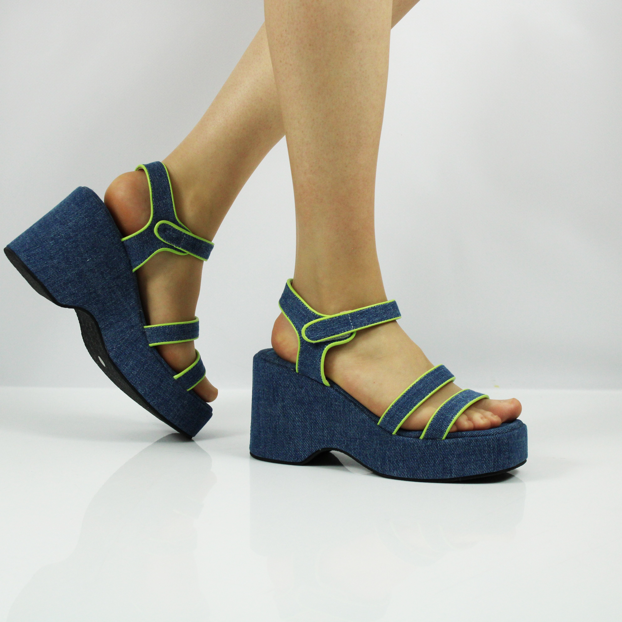 Босоножки из денима на высокой танкетке от бренда ABRICOT. Модель отличается футуристическим исполнением: каждый ремешок обшит контрастным кантом салатового цвета.