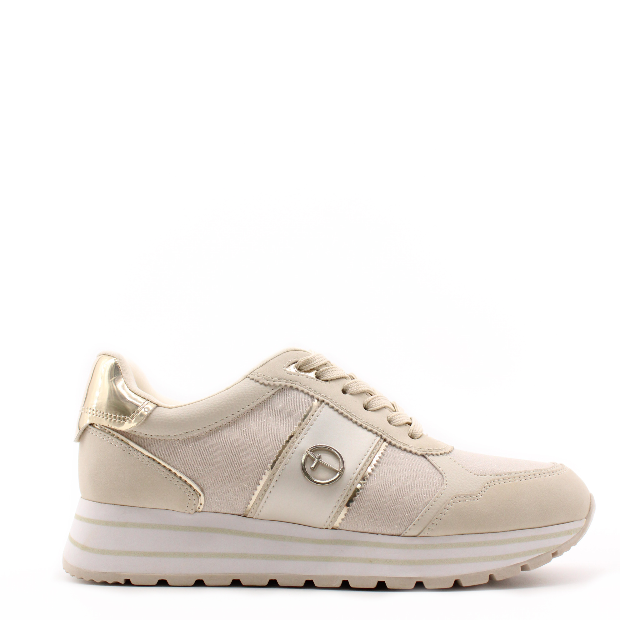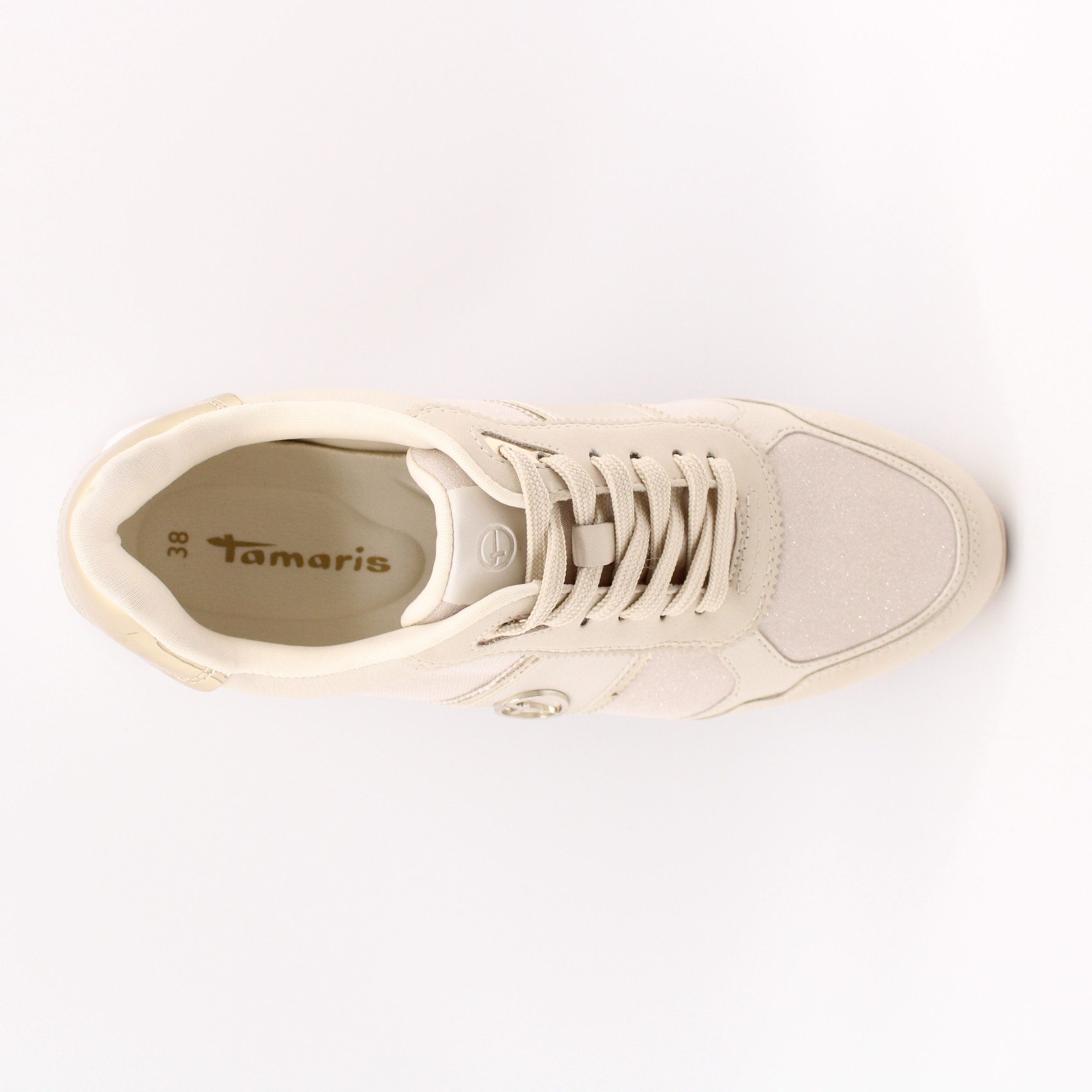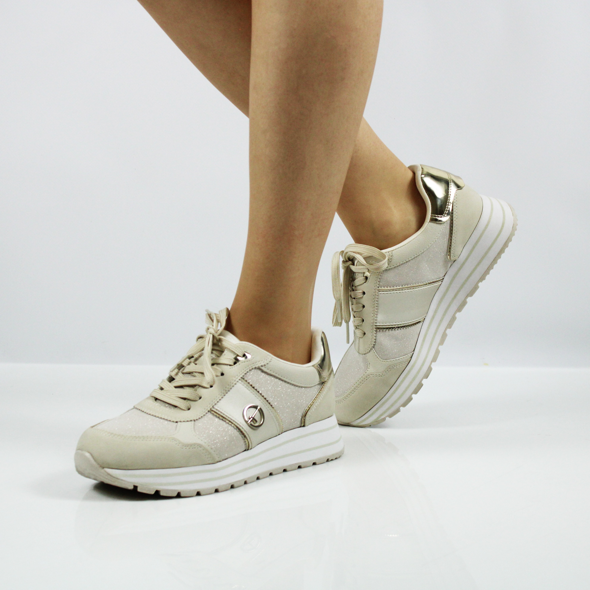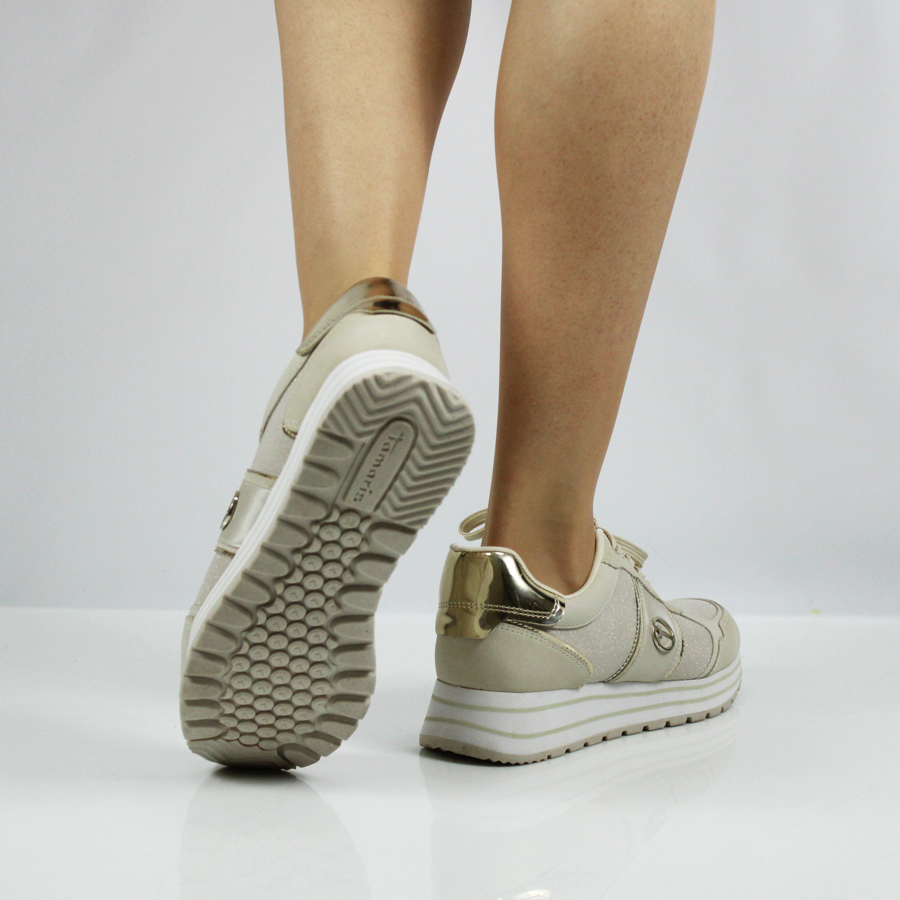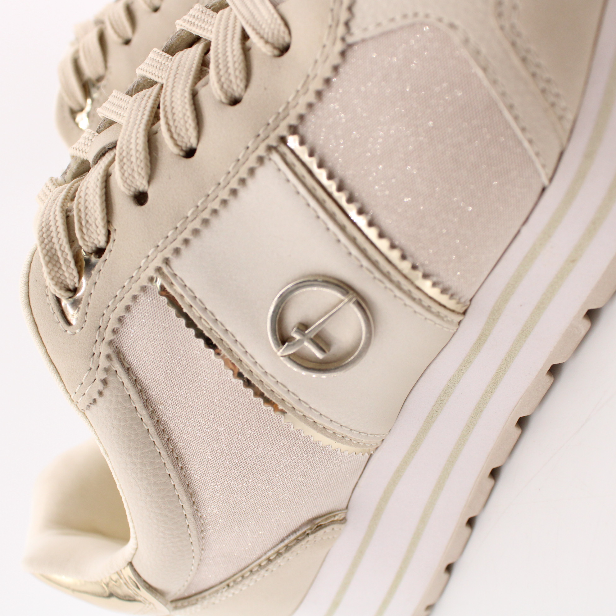 Кроссовки на танкетке из коллекции Tamaris ESSENTIALS отличаются особой элегантностью и высоким качеством исполнения. Модель цвета айвори декорирована золотистыми вставками, что делает ее особенно привлекательной.