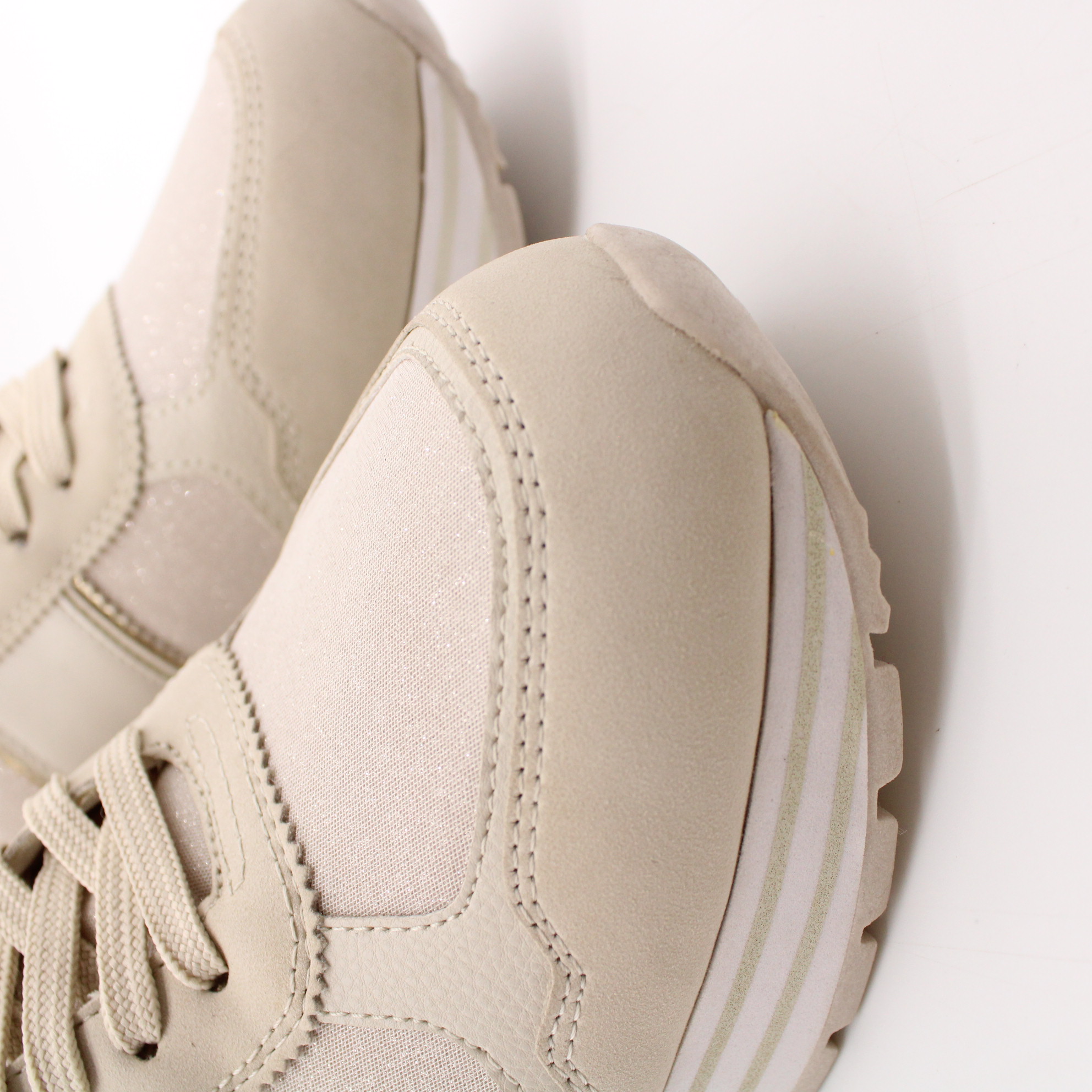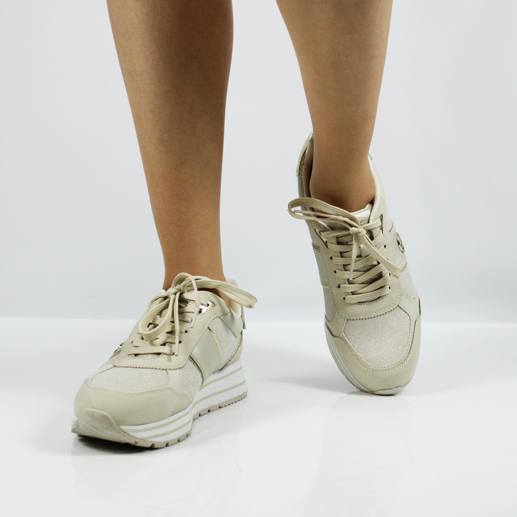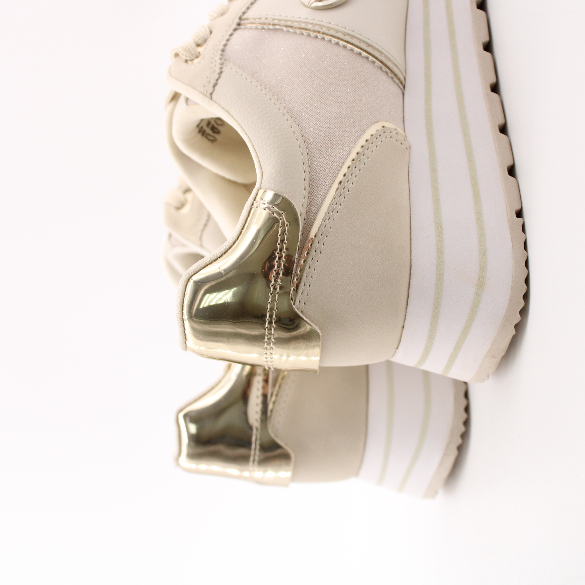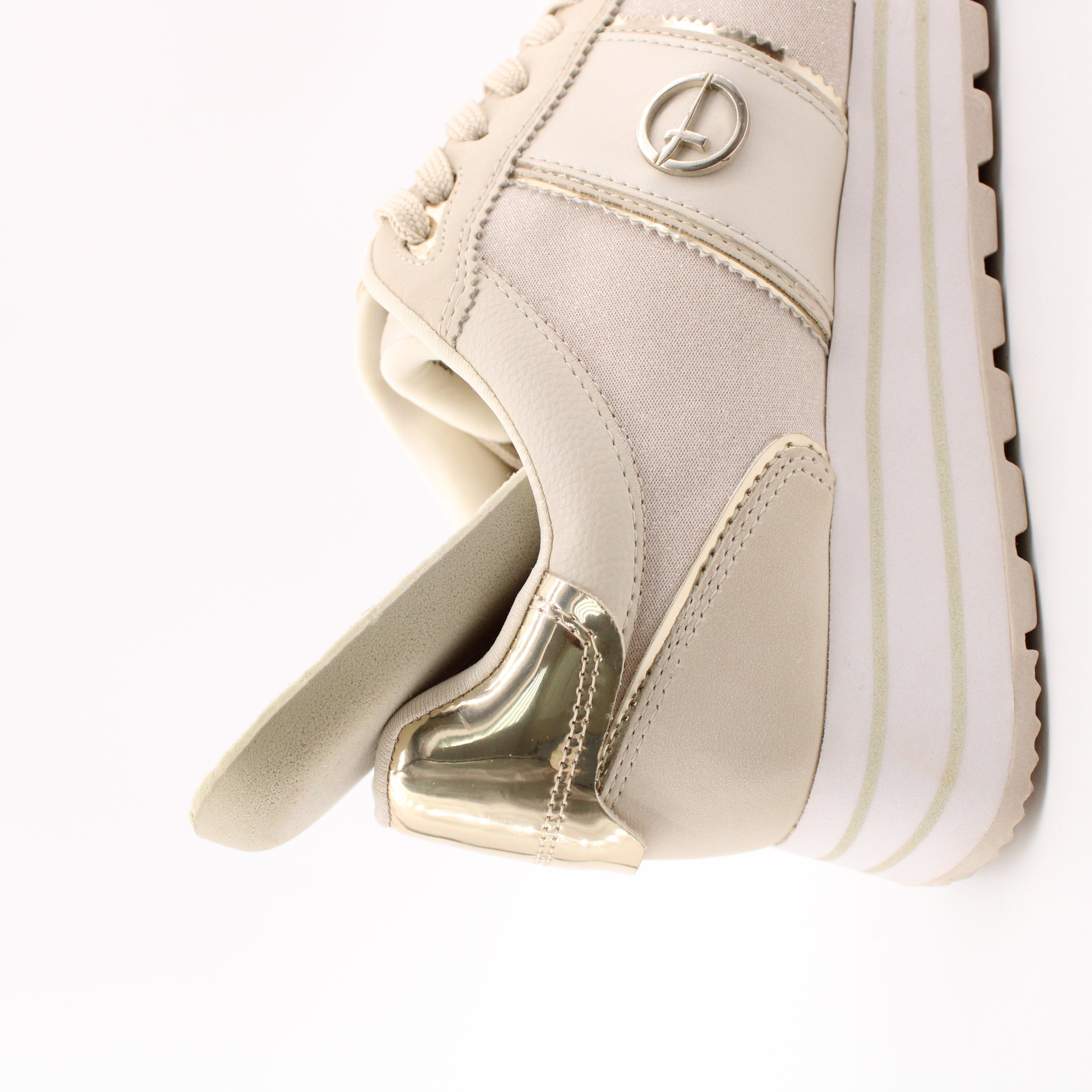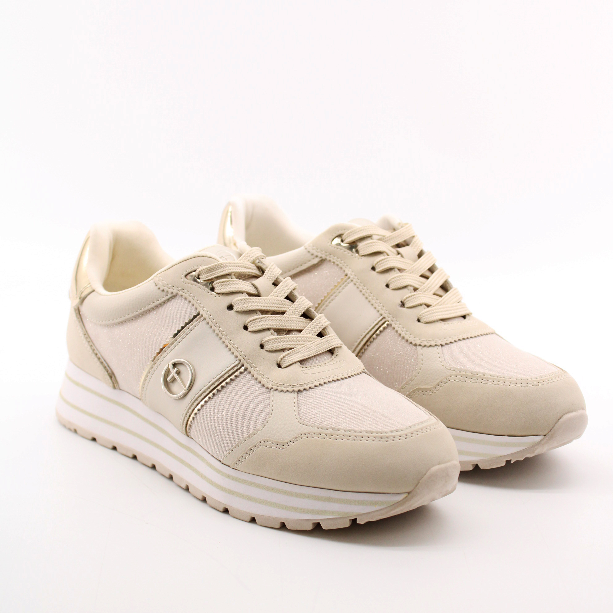 Кроссовки на танкетке из коллекции Tamaris ESSENTIALS отличаются особой элегантностью и высоким качеством исполнения. Модель цвета айвори декорирована золотистыми вставками, что делает ее особенно привлекательной.