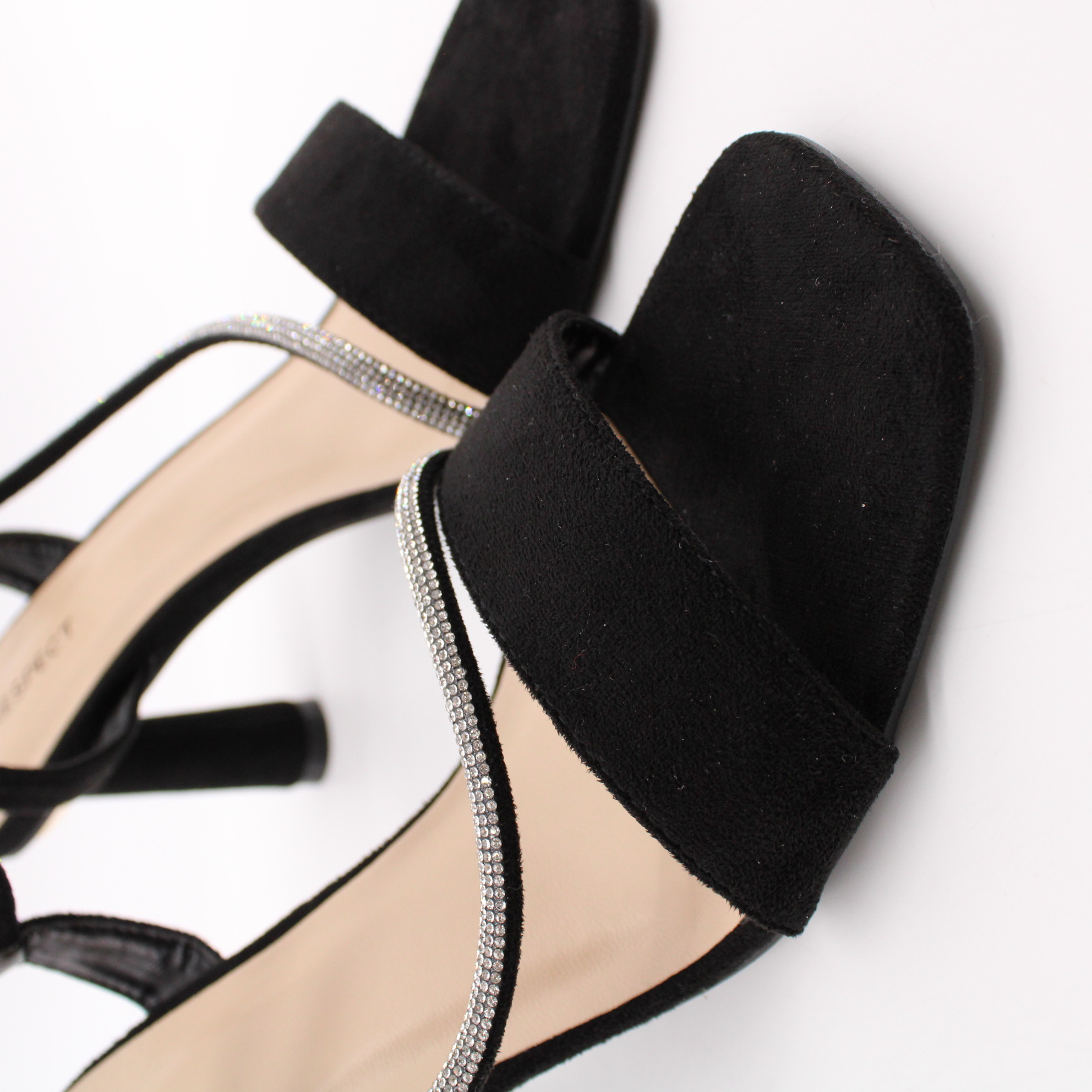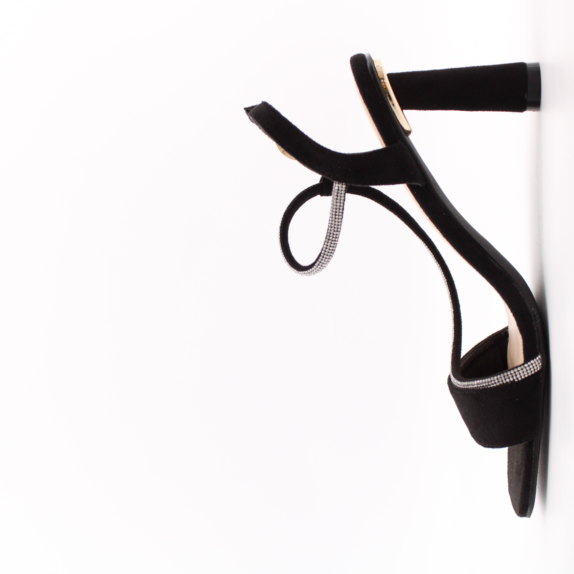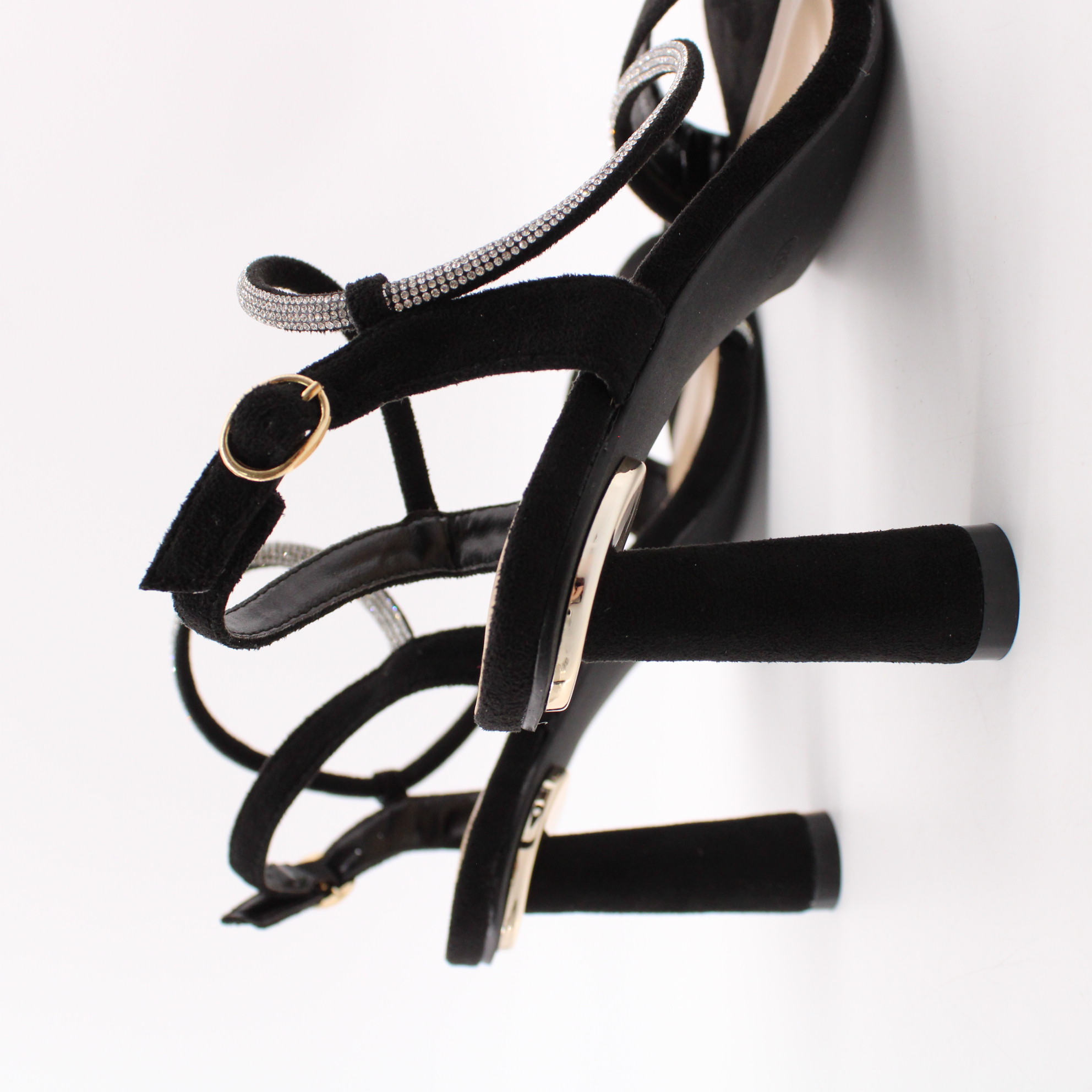 Чёрные велюровые босоножки с декоративным хлястиком с стразами.