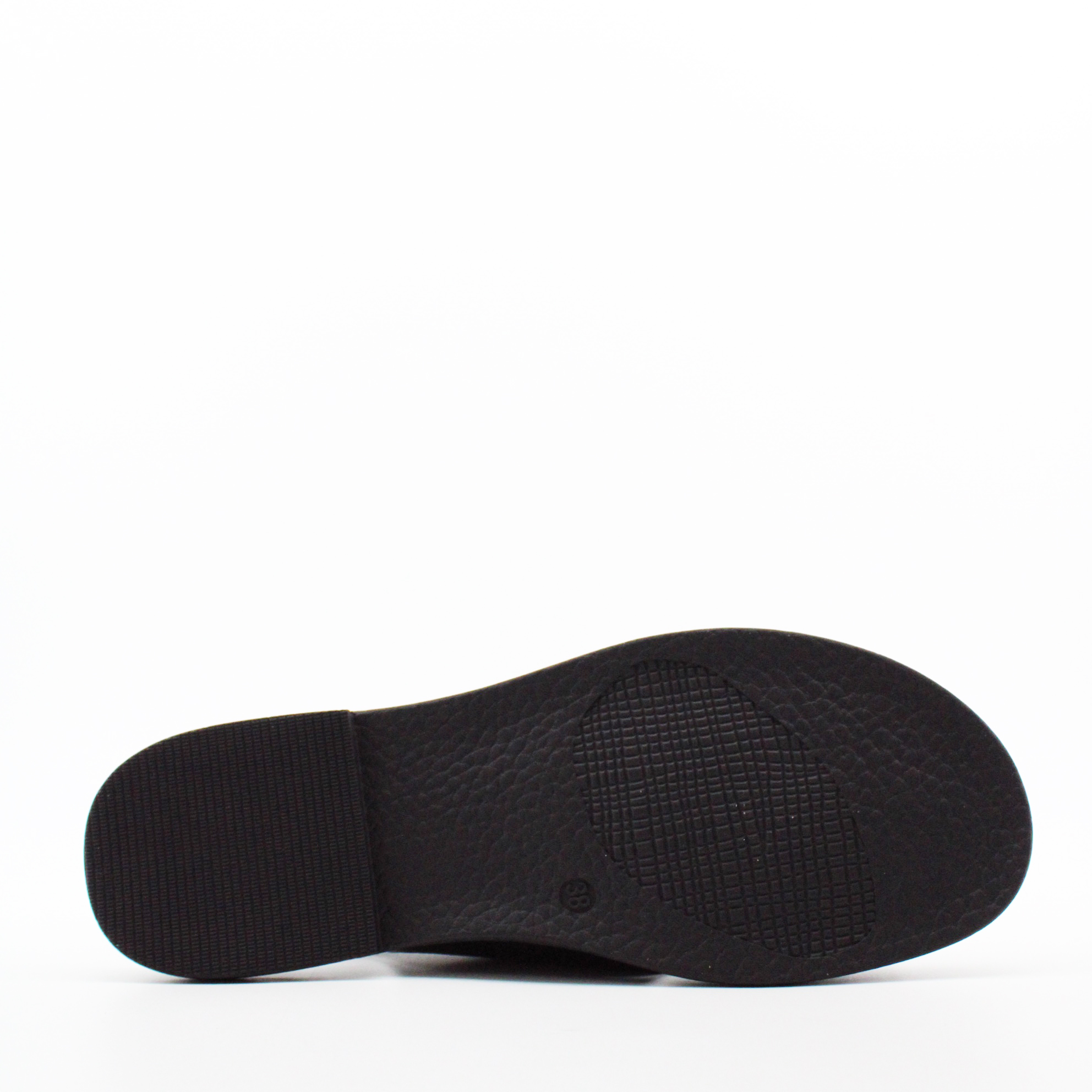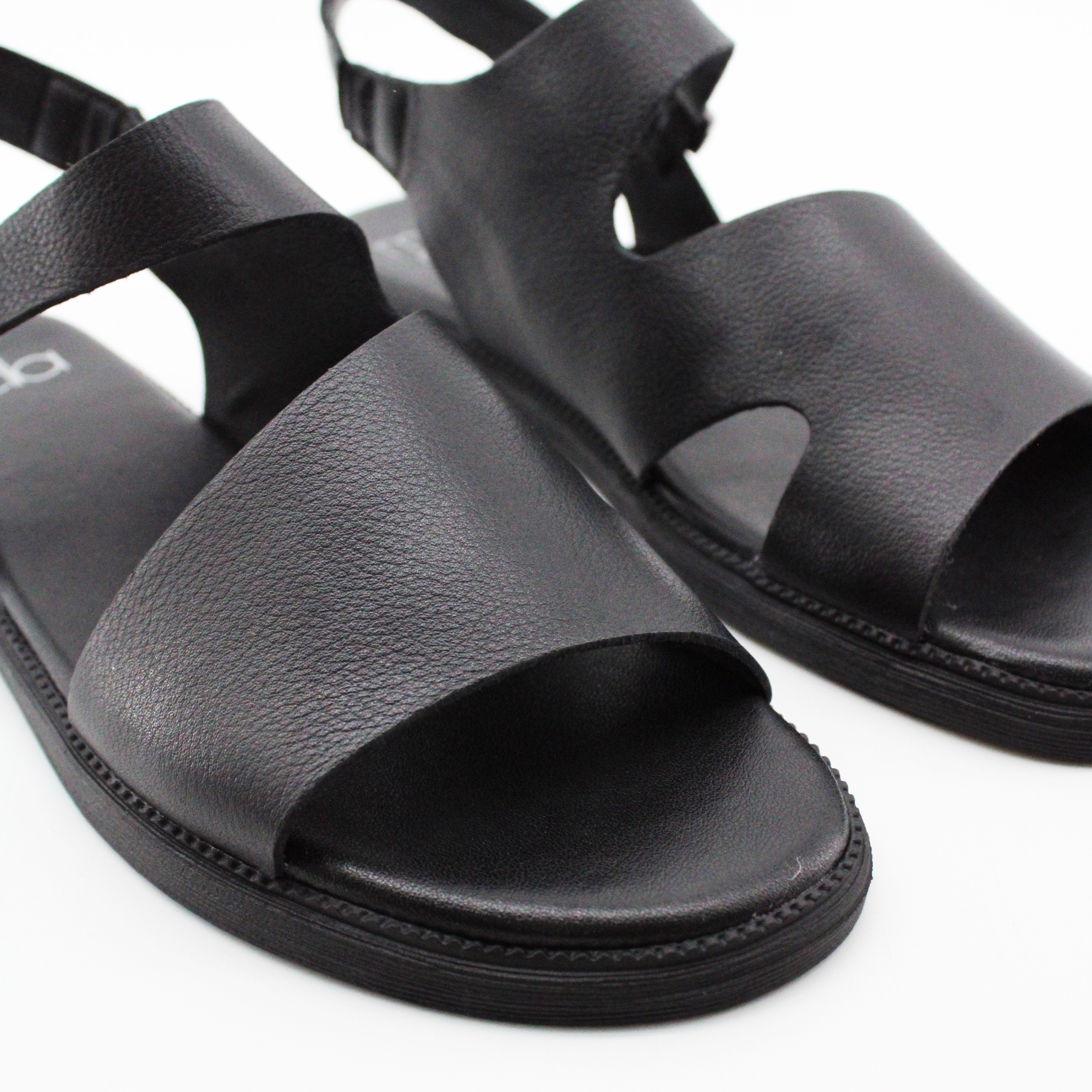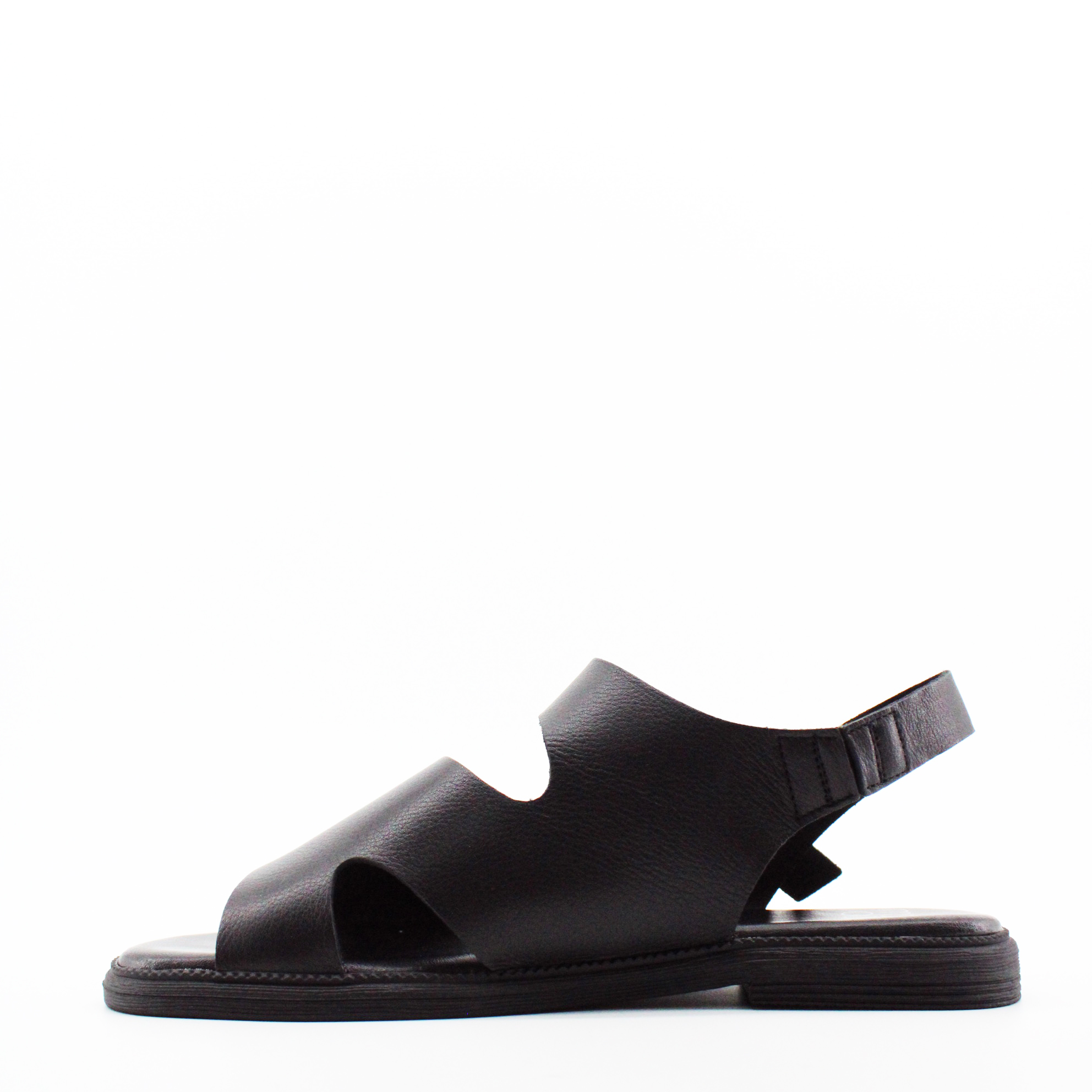 Передняя часть — широкая кожаная панель, которая закрывает пальцы и переднюю часть стопы. Она плавно изгибается, открывая стопу с внутренней стороны — создавая асимметричный V-образный вырез. Этот вырез — ключевой дизайнерский элемент: он открывает ровно столько кожи, сколько нужно для вентиляции и эстетики, но при этом надёжно фиксирует переднюю часть стопы.