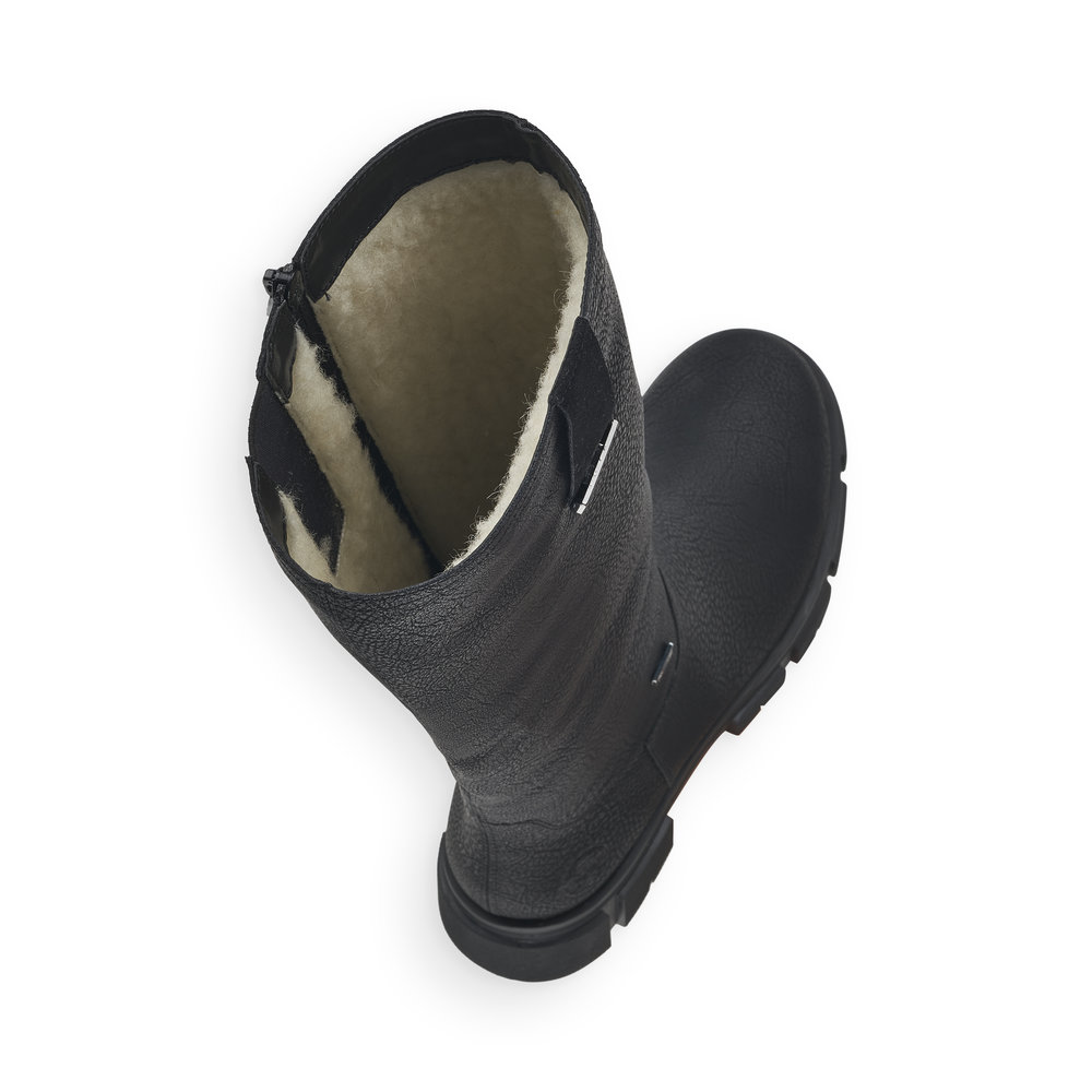 Сапоги женские немецкого бренда Rieker. Верх изготовлен из  искуственной кожи черного цвета. Материал подкладки натуральная шерсть с ТЕХ мембраной. Отлично подойдут на зиму и станут хорошим завершением к вашему гардеробу.